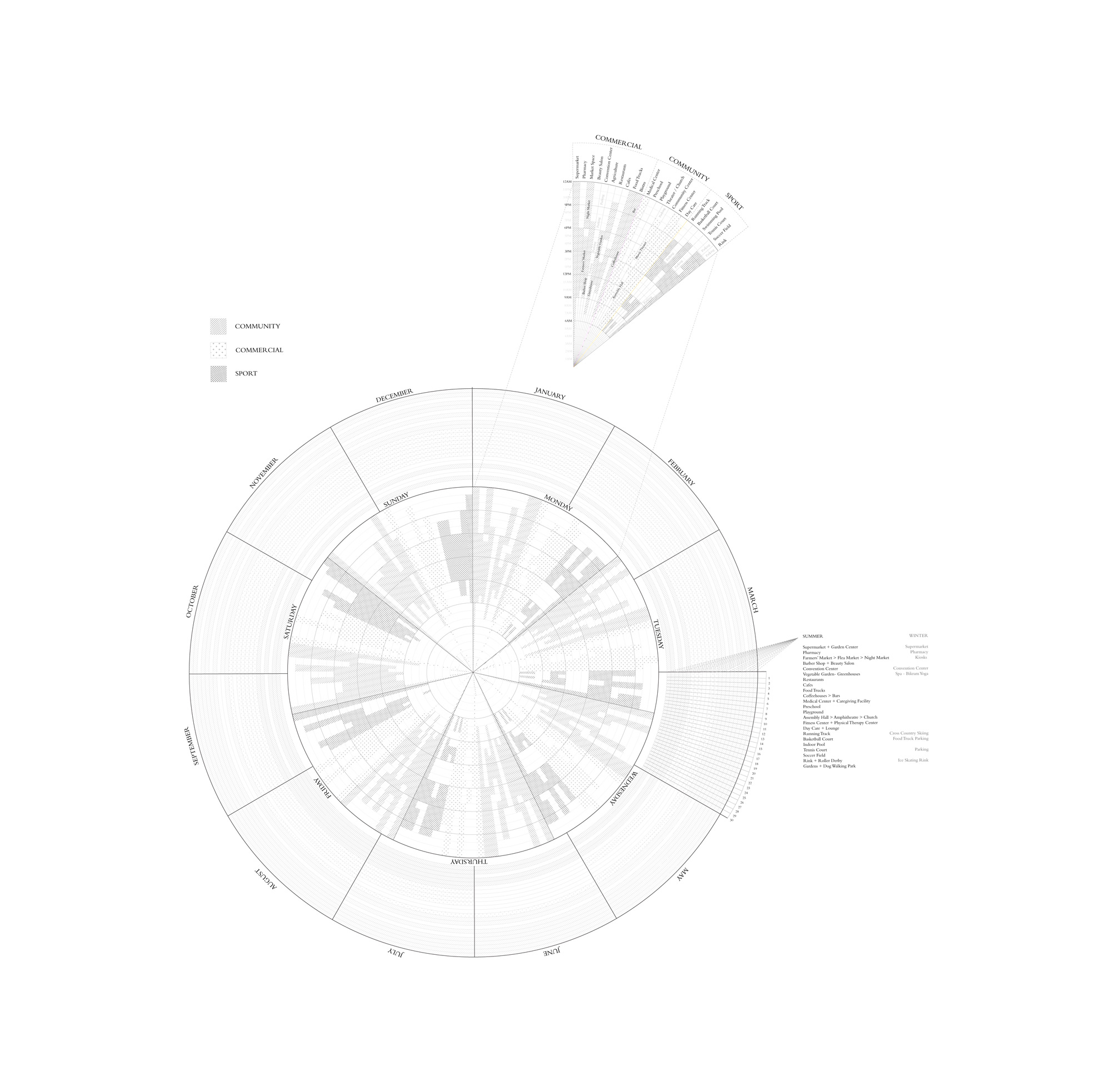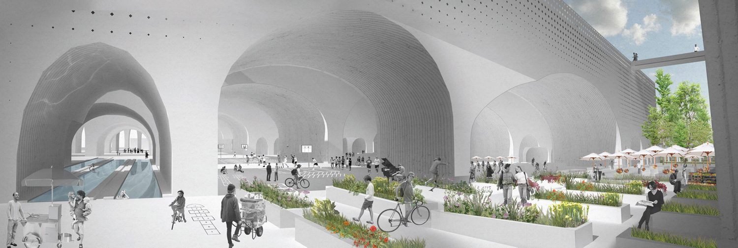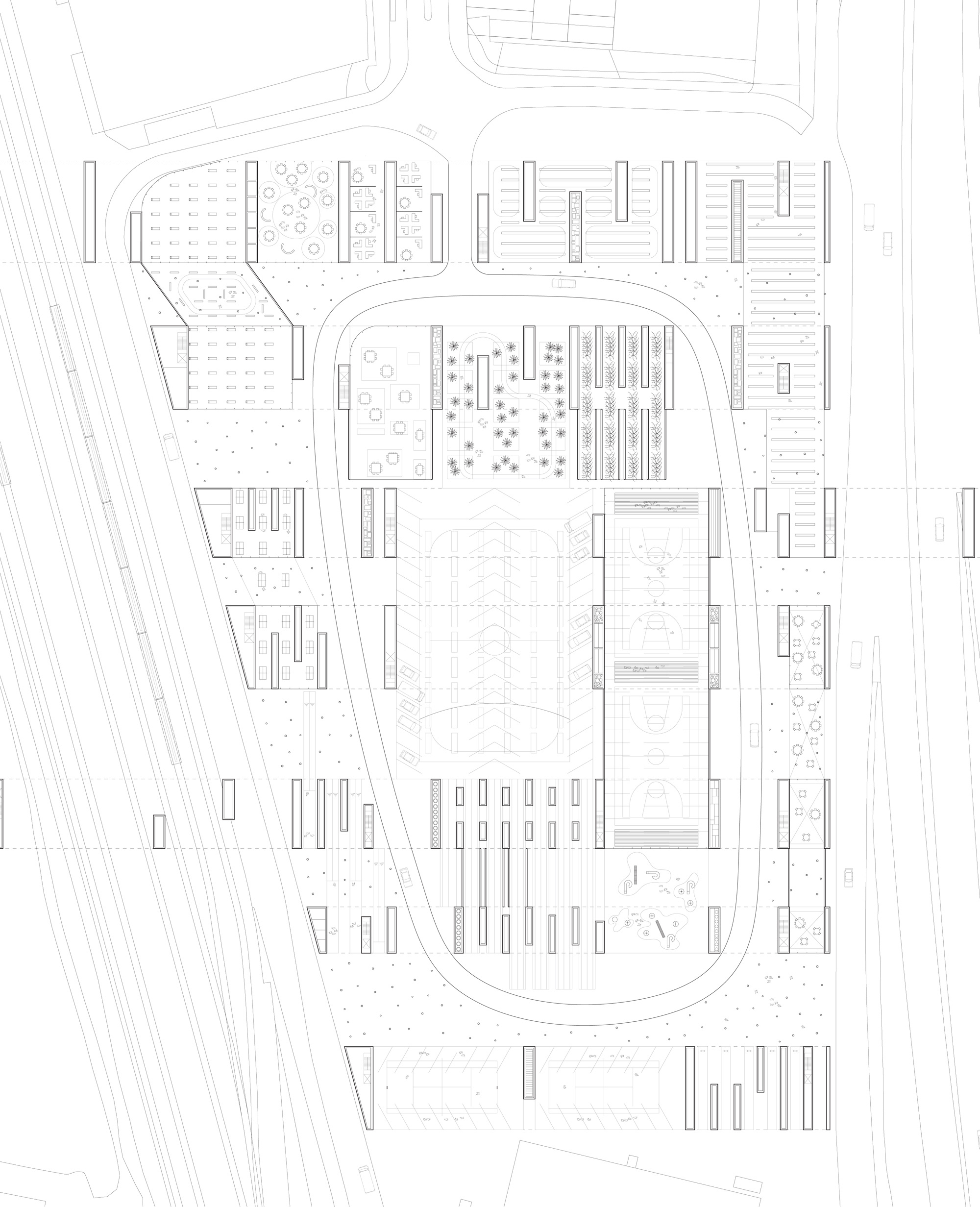 The question of adaptability in the site is addressed through the notion of time and the spatial type of the surface. A large surface operates as a multi-programmed public realm that is timeshared through a schedule – to allow a more diverse and larger set of public programs. The surface is coded through differing materials and paint to provide flexible, soft organizational strategies that are activated by the bars above. For instance, the same space can be used for greenhouses, parking, a market, and basketball courts at different times of the day, week, and year. The schedule is malleable to the needs of current and future residents, adapting for seasonal festivals, cultural events, and needs that cannot be anticipated. The surface is broadly organized into programs that share the similar surface characteristics — recreational, commercial, and community. Regions of overlap between these sectors allow for hybrid uses. For instance, a school’s playground can be used in a broader recreational sense when the school is closed, or market areas can be converted to informal night theaters. Five subtle surface variations provide diversity while still allowing for flexible programming. Pools of water and landscape enable sustainable water collection and promote microclimates to alleviate the large paved surfaces in the broader strategic site. The malleable surface and schedule is structures through the arches above, forming a symbiotic arrangement as well a unique architectural scenario wherein form runs east-west through the site to connect across infrastructure while space runs north-south to connect with the larger strategic site. This weave between form and space is structured through the public realm and surface below.