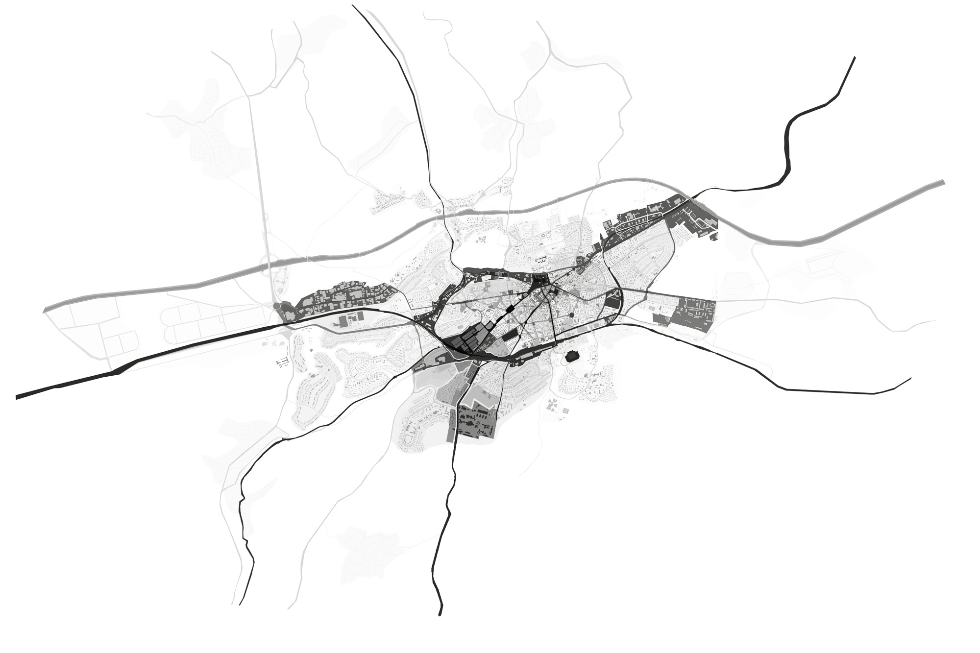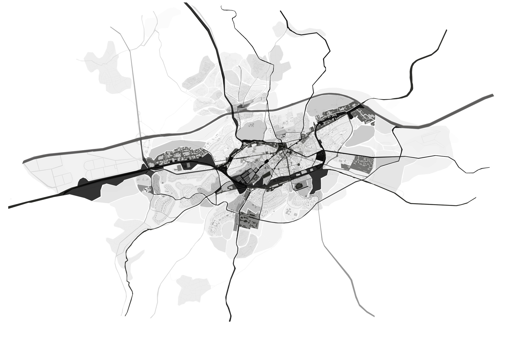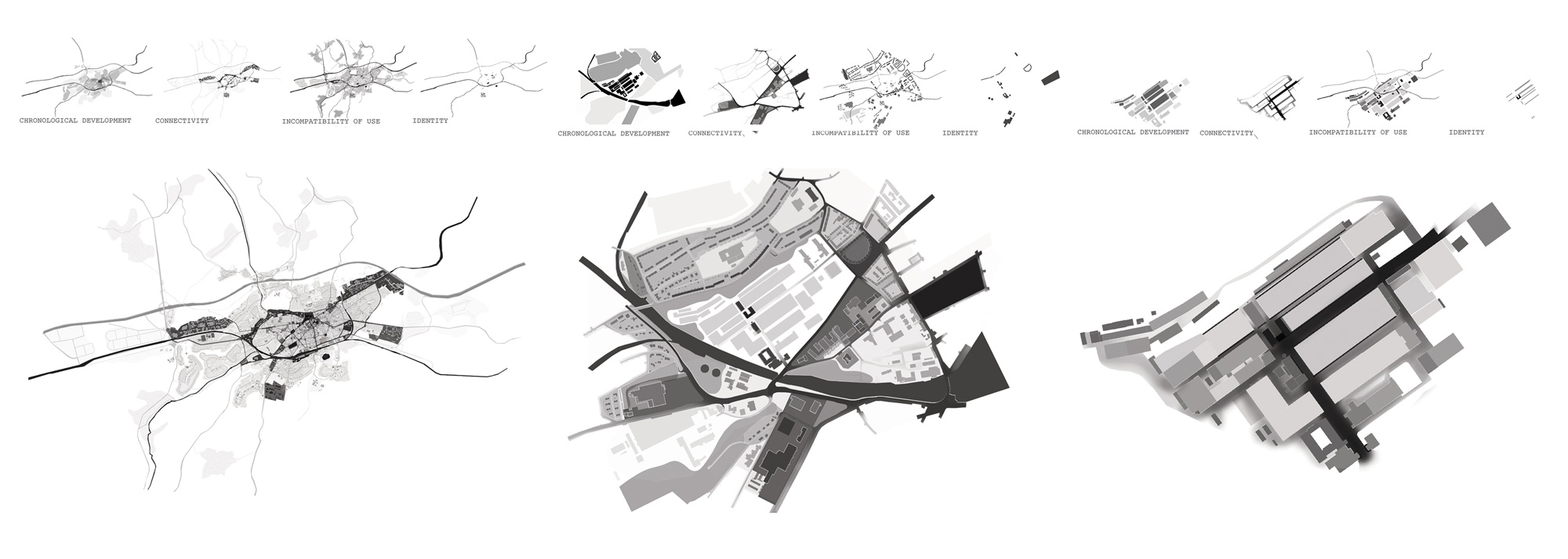 We propose a methodology of analysis, able to determine the change rate of the elements that make up a city, based on four study criteria: chronological development, connectivity, incompatibility of use and identity. Darker structures represent static nature while lighter stands for the mutable. Territorial, Urban and Architectural scales are used following the idea of fractal logic, proving how the given value to elements varies according to the analysed scale.