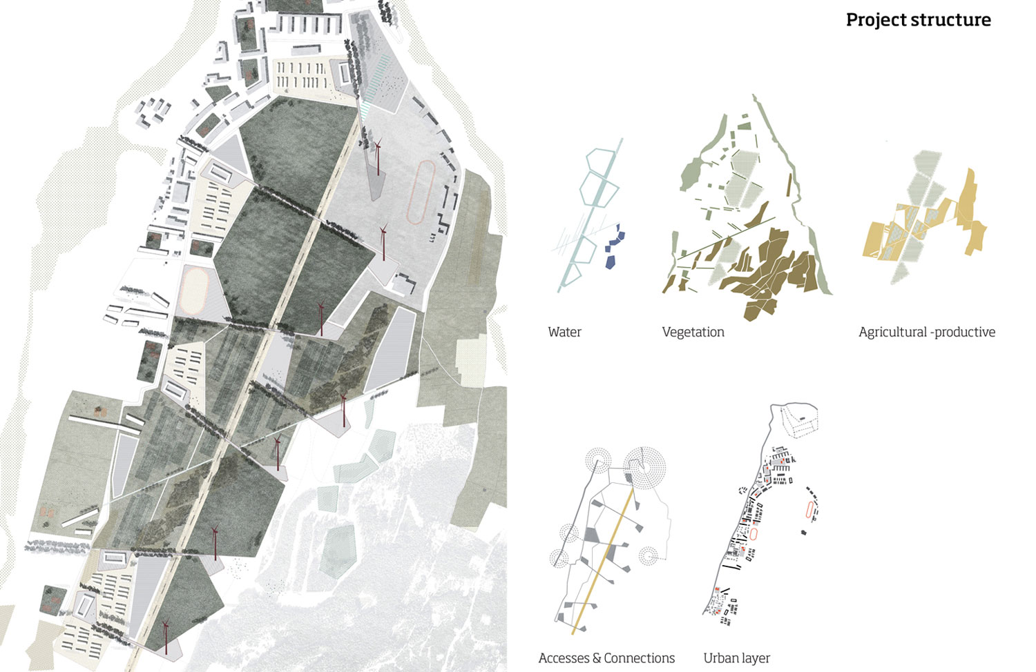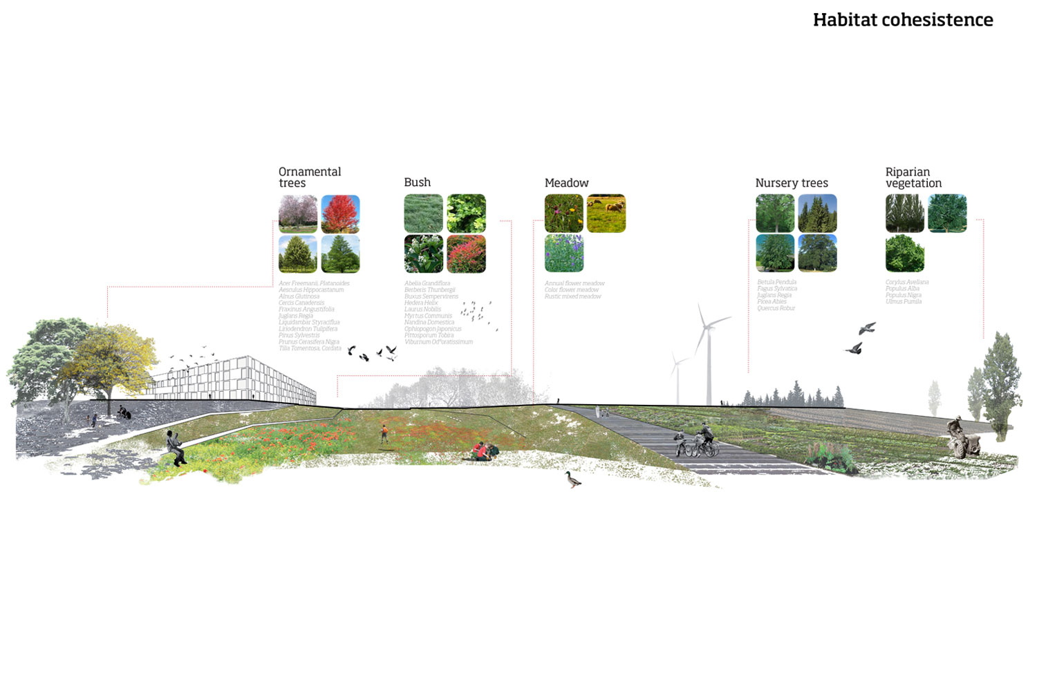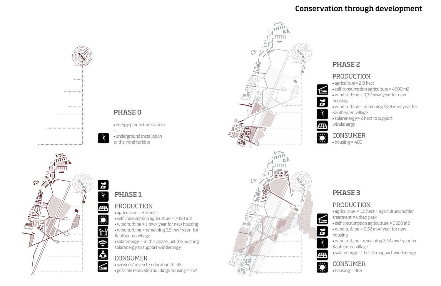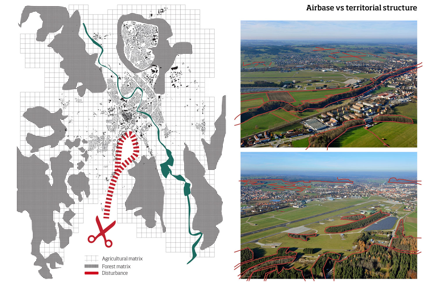 The Kaufbeuren airbase is an interruption in the natural fabric of this part of the Swabian landscape: it cuts across the green belt obstructing a natural corridor. This proposal aims to solve the disconnection with the old town, with the use of linking pedestrian and cycle paths, and by giving new value to the existing old walls and main existing buildings. The new master plan combines urban and natural synergies, using the transversal park as a connecting element. There is coexistence between urban farming, the research center, the production of energy and flexible living styles. The new development takes advantage of the elevated location and panoramic views. Moreover, the project conserves the identity of the old military airbase by exploiting the main lines of its layout. The project has a multilayered approach, and, instead of an unflexible, fixed plan, consists of a structure which will lead to a process based on 3 principal aims: flexibility, sustainability and adaptability. Time processes are another element of the project. On the one hand, the architectural structures will be in a variety of types planned to meet the town’s changing needs. On the other hand, new natural systems will be consolidated and integrated within the agricultural and forest matrix. The new inhabitants will customize their habitats and nature itself will create a new ecosystem.