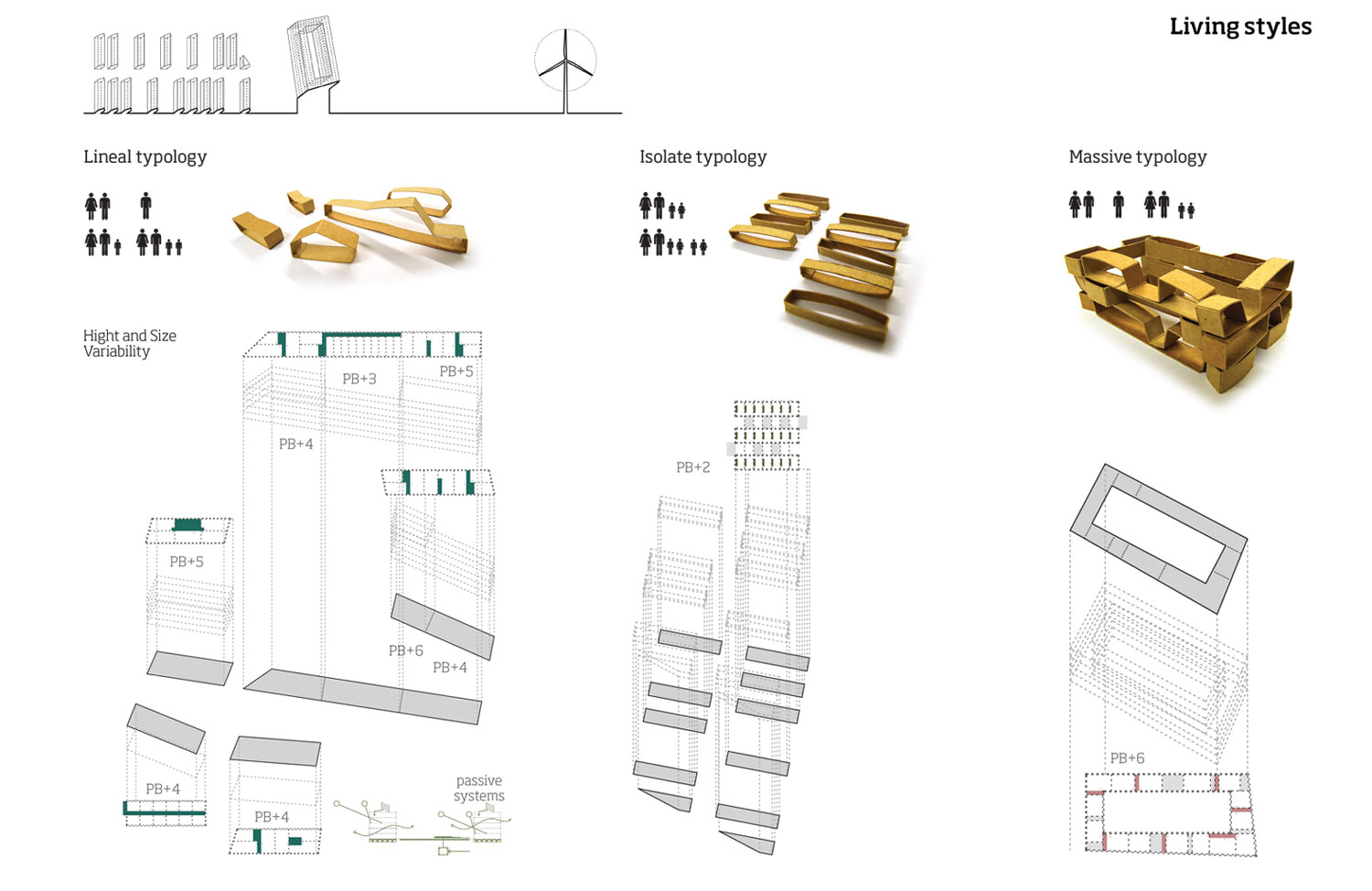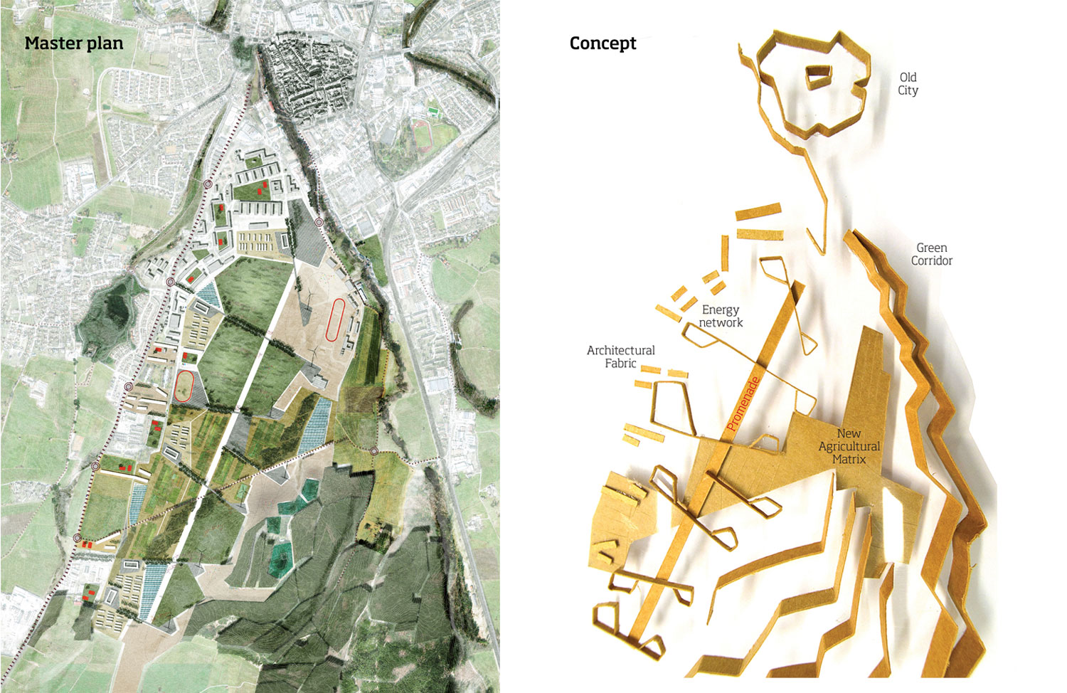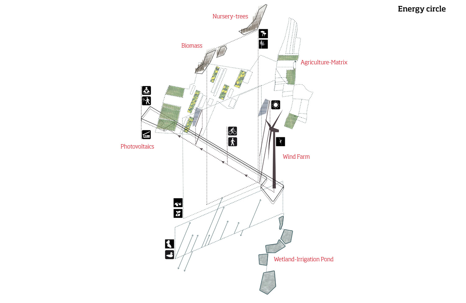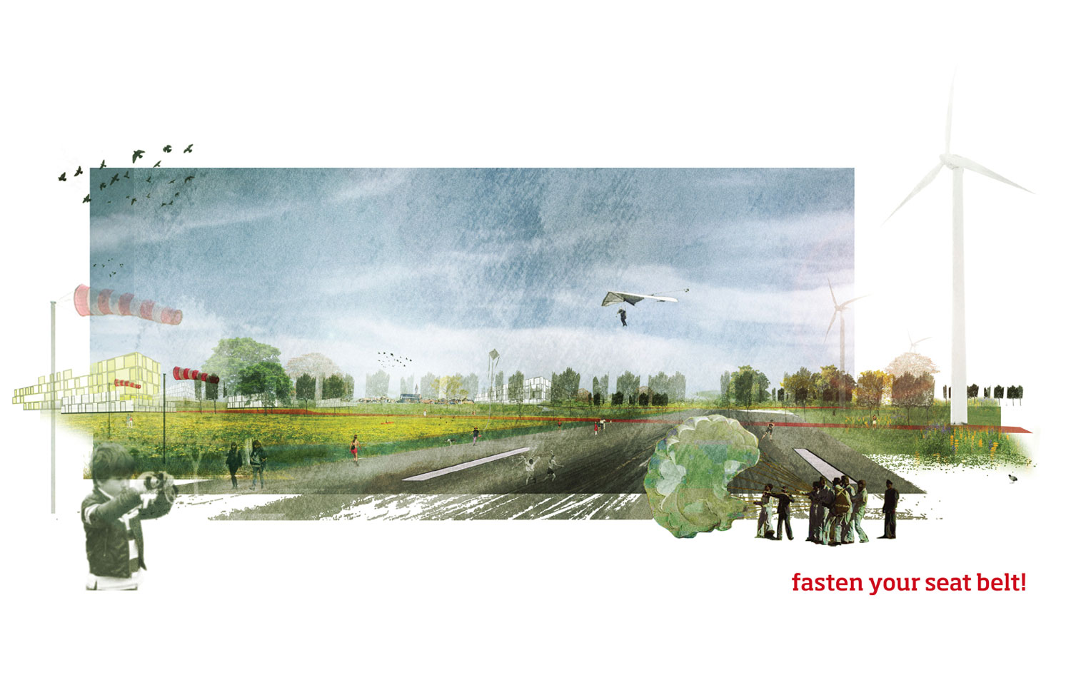 The Kaufbeuren airbase is an interruption in the natural fabric of this part of the Swabian landscape: it cuts across the green belt obstructing a natural corridor. This proposal aims to solve the disconnection with the old town, with the use of linking pedestrian and cycle paths, and by giving new value to the existing old walls and main existing buildings. The new master plan combines urban and natural synergies, using the transversal park as a connecting element. There is coexistence between urban farming, the research center, the production of energy and flexible living styles. The new development takes advantage of the elevated location and panoramic views. Moreover, the project conserves the identity of the old military airbase by exploiting the main lines of its layout. The project has a multilayered approach, and, instead of an unflexible, fixed plan, consists of a structure which will lead to a process based on 3 principal aims: flexibility, sustainability and adaptability. Time processes are another element of the project. On the one hand, the architectural structures will be in a variety of types planned to meet the town’s changing needs. On the other hand, new natural systems will be consolidated and integrated within the agricultural and forest matrix. The new inhabitants will customize their habitats and nature itself will create a new ecosystem.