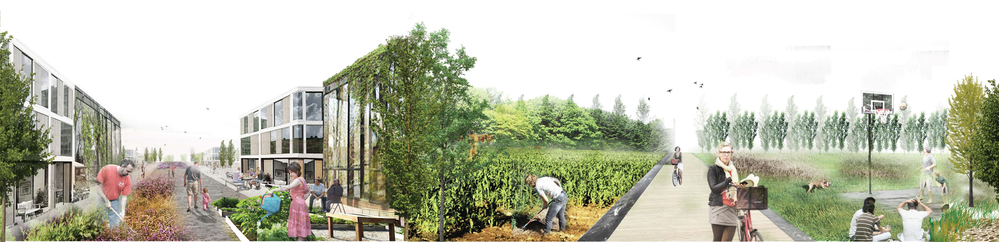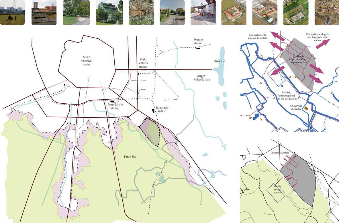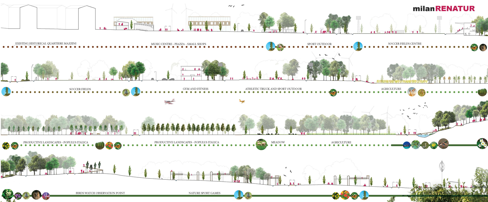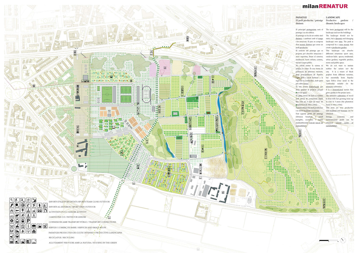 El proyecto promueve una renaturalización de la zona sur de Milan, una zona al límite entre ciudad y naturaleza actualmente ambigua, sin uso ni carácter y proclive a una deterioración progresiva fruto de usos indeseados por la comunidad, que se reinventa a través del paisaje productivo, gran protagonista de la propuesta, y donde también se incorpora programa residencial para gente joven y la exploración medios y formas de cohabitar e instalaciones deportivas que permiten un uso ecológico y sostenible de este área degradada con el fin de beneficiar y sustentar la comunidad de los barrios adyacentes. El paisaje productivo y deportivo es así un degradado entre la ciudad y la naturaleza, completando una progresiva desaparición del paisaje construido hasta el paisaje completamente natural y rural. La sostenibilidad ha sido un motor de proyecto, estando presente en todas las decisiones tomadas con el fin de brindar a la comunidad un proyecto coherente con su entorno natural y que no requiera de excesivo mantenimiento ni influya negativamente en el ecosistema. La producción de alimentos, el uso de vegetación autóctona, los paisajes y el tratamiento de los caminos y jerarquías de uso ha sido valorado para beneficiar la reducción de emisiones contaminantes e impulsar medios de circulación eficientes y no contaminantes.