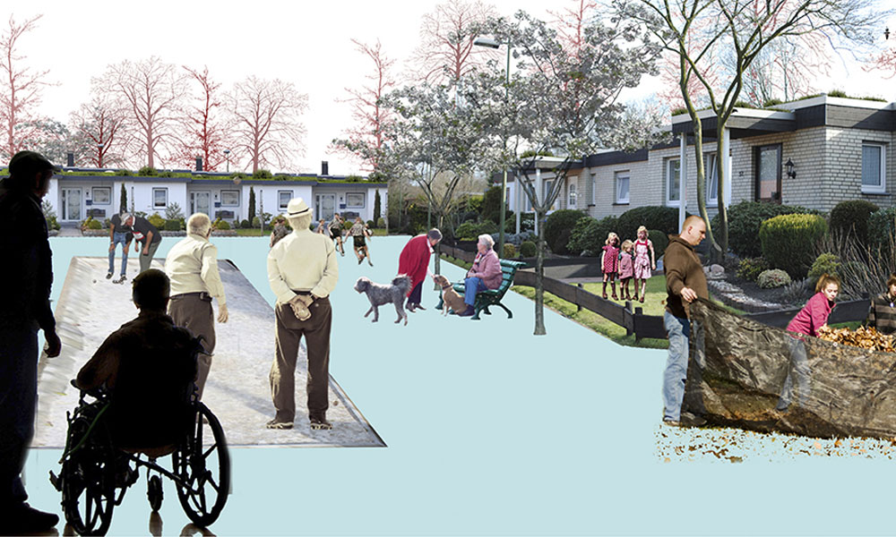 Kein Land für alte Männer is a bet on Münsterlanders. Kein Land für alte Männer is a toolbox of territorial strategies, urban planning and architectural vision on how local inhabitants must understand and learn from their environment in order to better manage their own resources. They are our key component to face the upcoming energetic, economic and social challenges for the next decades. New defeats are right ahead German society, some of them related to the obsolescence of certain old structures. The urban settlements from the 60-70’s are meant to be the hinge between past and future. Within the brick walls of those houses lies the most recent lesson of this society: the social and urban models inherited from them are gone. Beyond those walls there is a large knowledge to be awaken and ready to be shared. The dialogue between old and new generations needs to happen outdoors, at contemporary meeting points where to shape and develop new strategies all together.