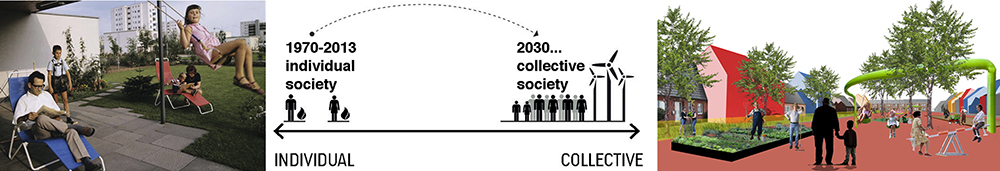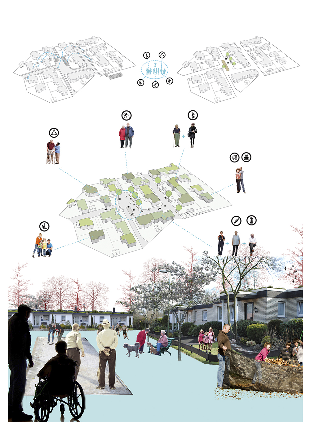 The main ambition for Barkenberg is to achieve a mixed society. A system of housing-share would provide reasonable housing costs to young people. Elderly who are hosting them would received at the same time assistance and care. There is a solidarity exchange of services by the guest and some financial income for the host. Both generations are coming together to share certain mutual services, increasing permeability between two very age elongated sectors of society. These resulting structures would perceived their neighbourhoods as extension of their homes. Once the idea of sharing is attached to people they would be able to think in a broader way, trying to invest their own resources in new sustainable ways of energy source. Geothermal energy is proposed as an example of this collective energetic systems.