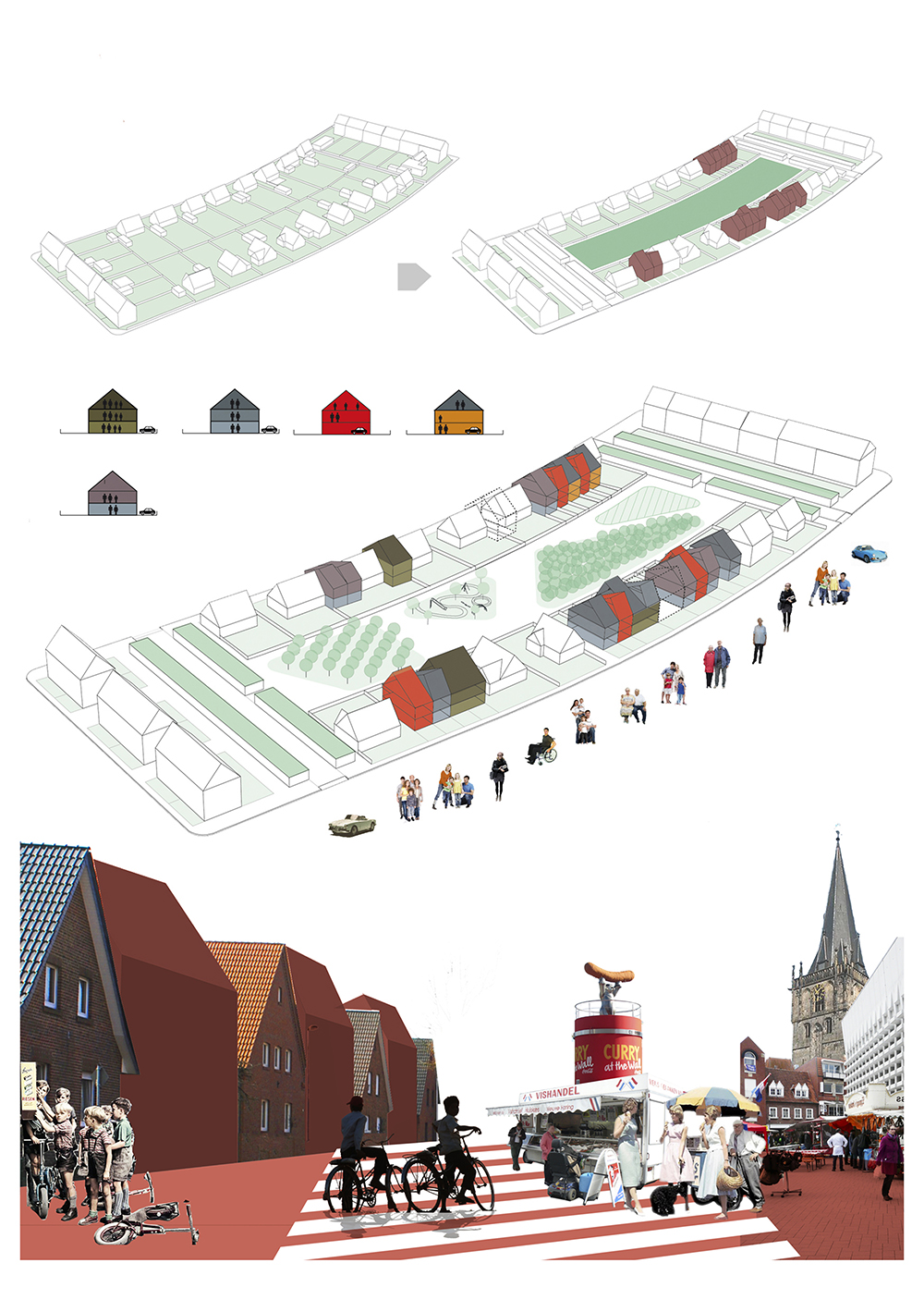 We are supplying a social sustainable process of densification for the Innenstadt Oost. The change in the urban regulation wants to make the blocks more flexible in order to host more houses. Current residents can chose to remain in their own homes, to extend them or to build or sell new building surfaces. The partial lost of garden surface is compensate with double benefits: better public/collective courtyards and economical benefits to improve energetic systems in the future. Accessibility is been provided, ground floor dwellings would be always desirable for elderly. Homes that are left from old people can be retrofitted and improved, new owners would find suitable houses with flexible typologies at affordable prices and very conveniently located. The retrofitted environment would become attractive for new investors, public investment is required only in the first phases trying to consolidate a meaningful space directly connected with the school and a future civic centre oriented into elderly which can become attractor for the rest of the city and urban link to the inner-city.