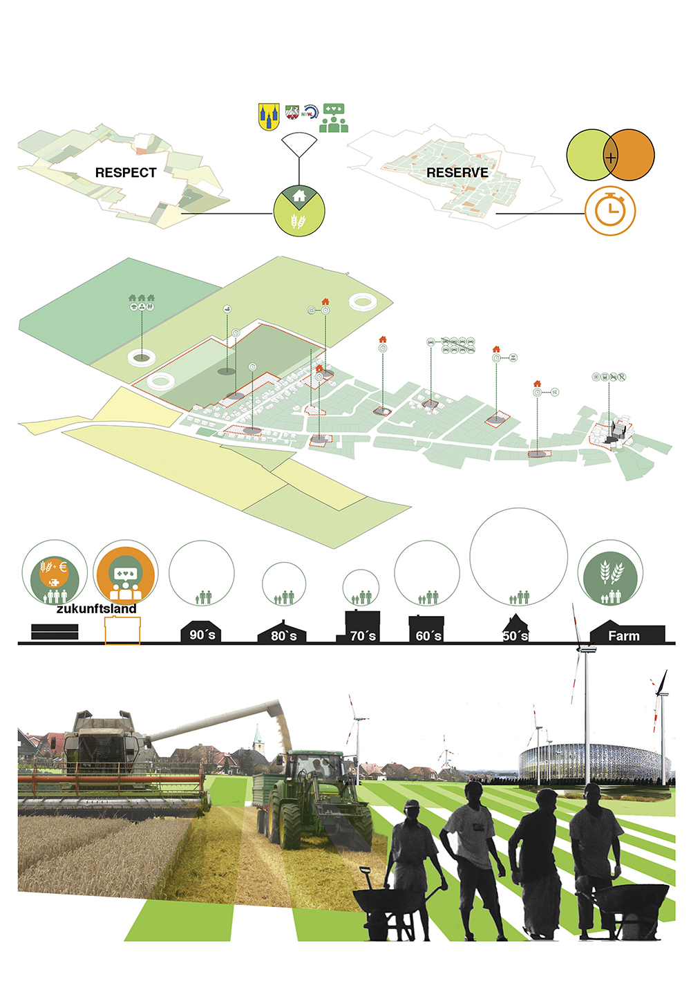 Südkirchen main topic is how to avoid monofounctionality for the future. Two strategies are provided to face the steady situation, which might turn into certain growth in two decades. Our proposal is based in a more rational land structure. First strategy defines vacant houses and lots as reservations for future urban infill, allowing shared and temporarily use of them until they get occupied for new buildings. Potential densification and private investment is allow to keep and increase population within the contour of the current urban shape. Second strategy focuses in how to deal with future growth on the landscape. Agricultural areas around the village feel the pressure of possible urban growths. New settlements would be allowed in those properties under restricted conditions. Inspired by the old land structure and farm typologies we introduce a system of co-ownership of the future homes. It would be required that at least a third of the housing would be owned by the municipality, a second third by associations such as the School of Business of Nordkirchen Schools and last third would be up to private owners and citizens that associated in baugruppen (building groups) to develop their own houses. To retain activity and activate land use besides agriculture, some business-atelier space related with the local entrepreneurship would be also desired. Coordinated by a local business incubator in the activity area.