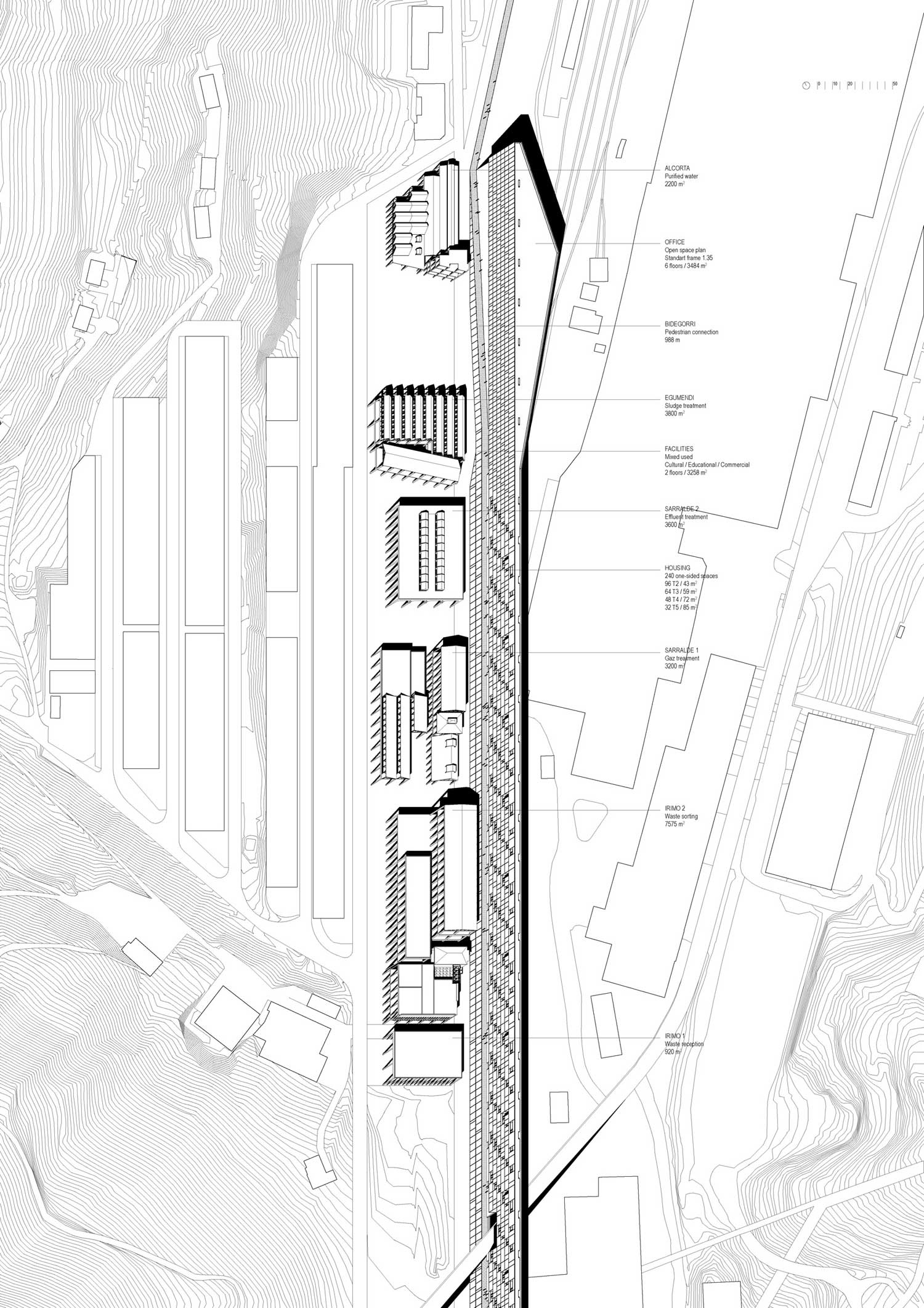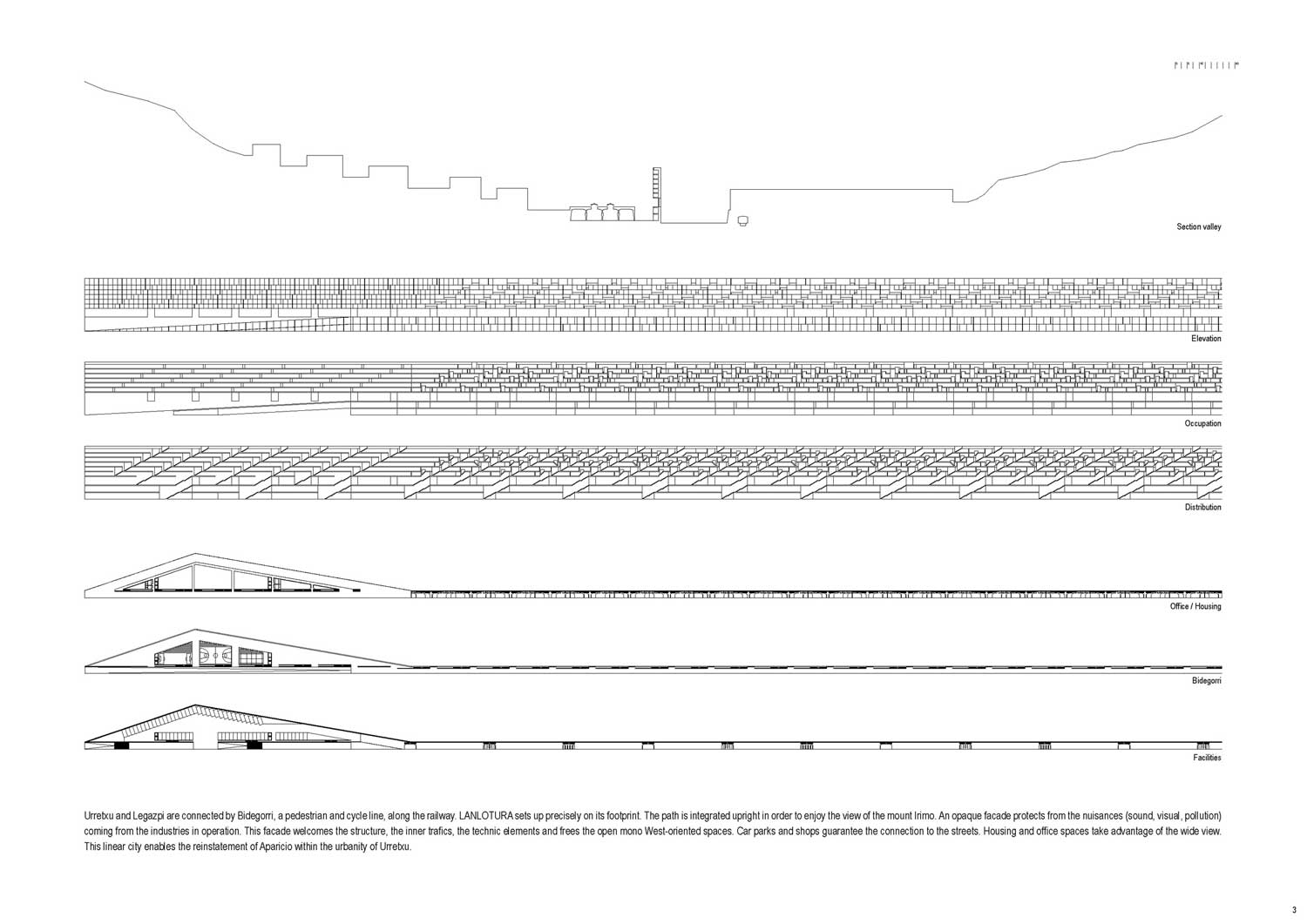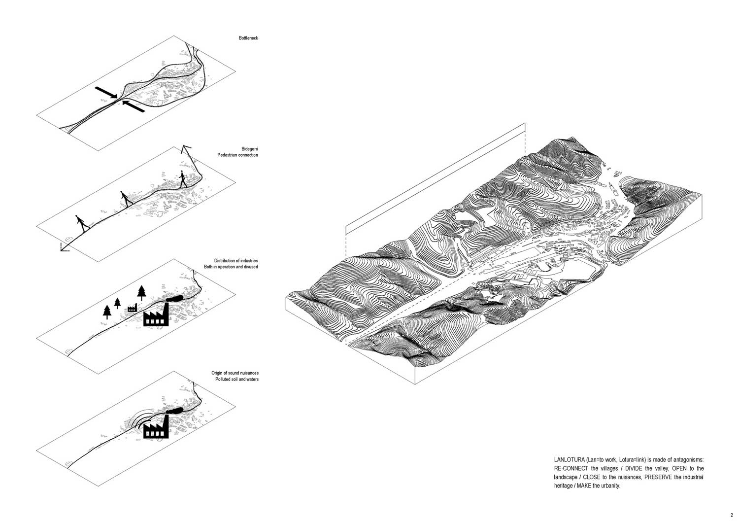 Lanlotura (travailler le lien), est fait d’antagonismes : reconnecter les villages, diviser la vallée, ouvrir le paysage, bloquer les nuisances, conserver les activités industrielles, continuer la ville. Le village d’Urretxu se développe le long d’une vallée industrielle du pays basque, coincée entre montagnes et zones industrielles en amont et en aval. Un seul bâtiment s’implantant sur Bidegorri, chemin piéton et vélo très emprunté relie les quartiers de la ville. Il fait limite entre usine et ville. C’est un bâtiment qui accueille tous les programmes : 2 niveaux bas de stationnements et équipements publics, le cheminement Bidegorri au 3ème niveau, puis 6 niveaux de logements. Un bâtiment comme réponse unique à tous les enjeux. Une réponse à des problématiques de ville et de paysage par l’architecture.