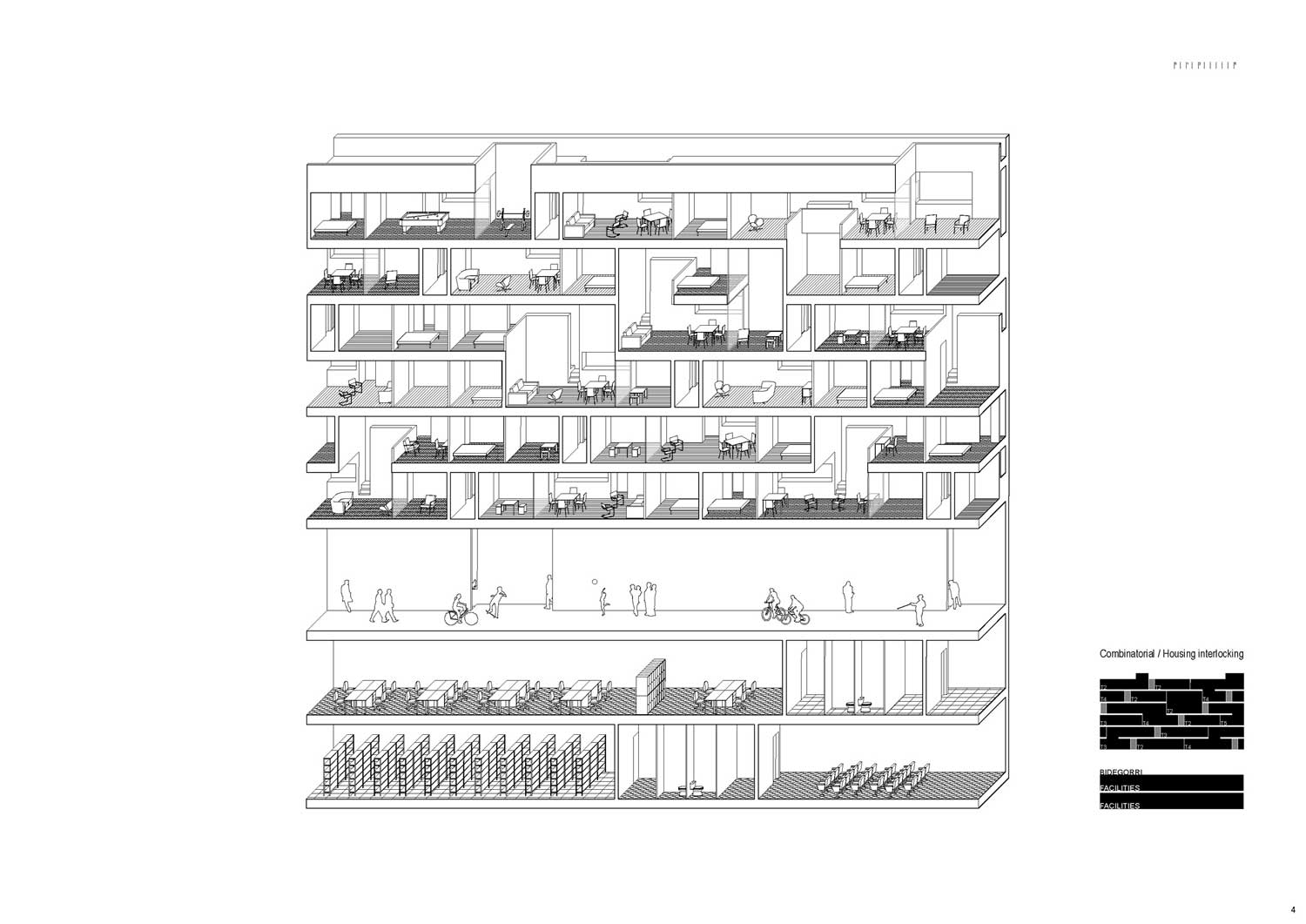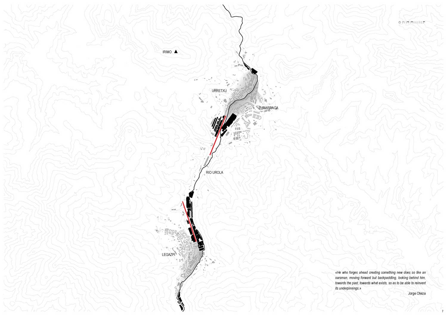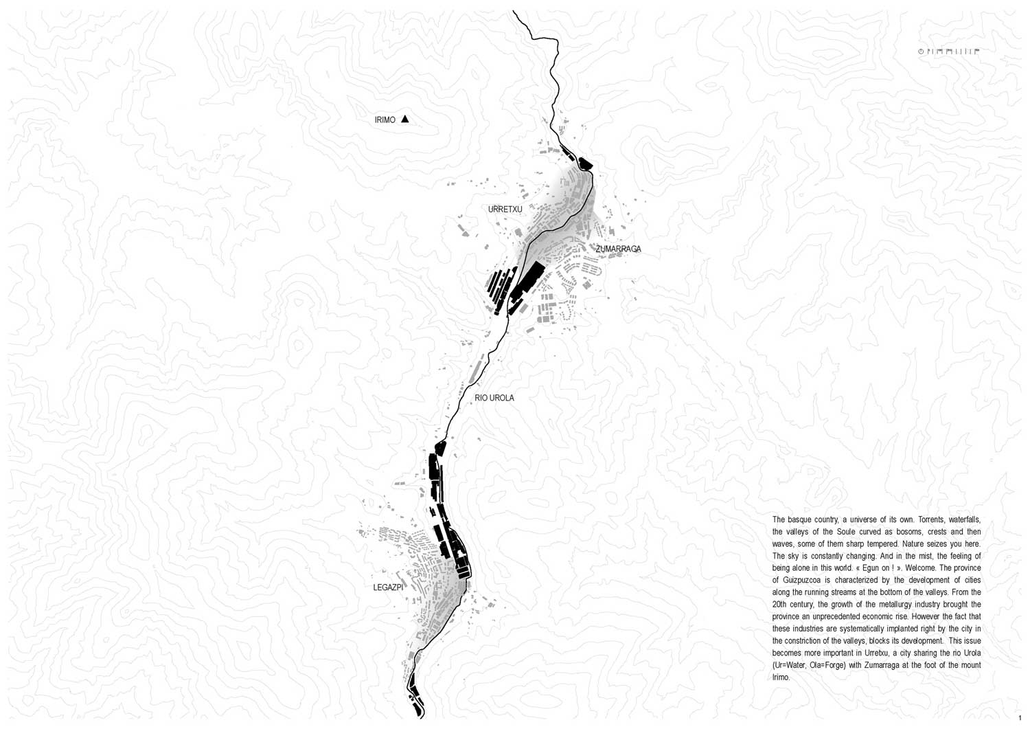 Lanlotura (travailler le lien), est fait d’antagonismes : reconnecter les villages, diviser la vallée, ouvrir le paysage, bloquer les nuisances, conserver les activités industrielles, continuer la ville. Le village d’Urretxu se développe le long d’une vallée industrielle du pays basque, coincée entre montagnes et zones industrielles en amont et en aval. Un seul bâtiment s’implantant sur Bidegorri, chemin piéton et vélo très emprunté relie les quartiers de la ville. Il fait limite entre usine et ville. C’est un bâtiment qui accueille tous les programmes : 2 niveaux bas de stationnements et équipements publics, le cheminement Bidegorri au 3ème niveau, puis 6 niveaux de logements. Un bâtiment comme réponse unique à tous les enjeux. Une réponse à des problématiques de ville et de paysage par l’architecture.