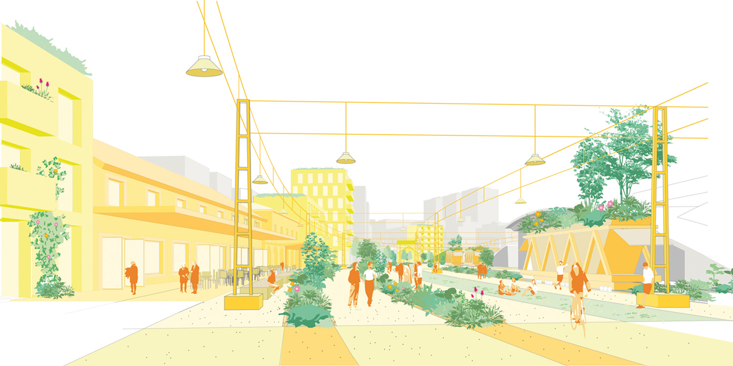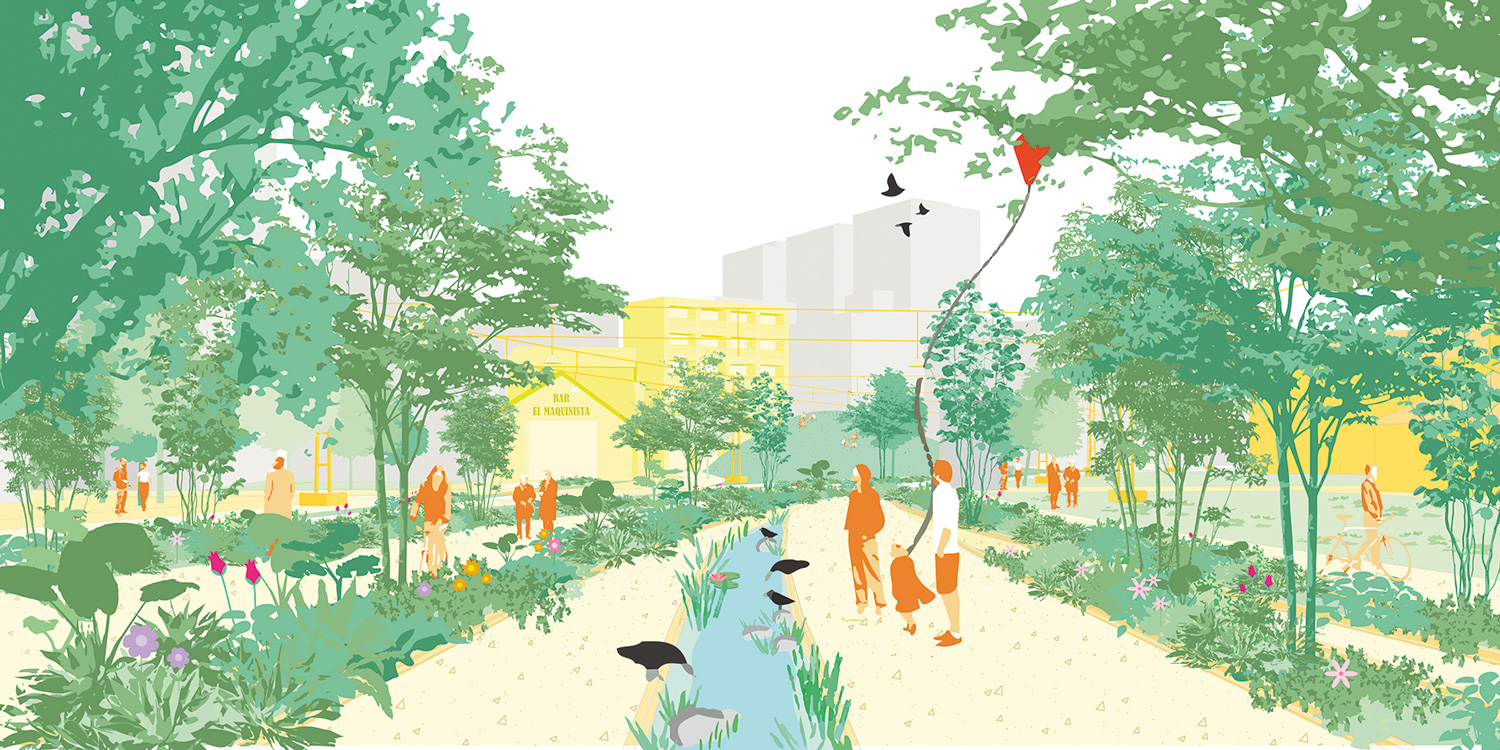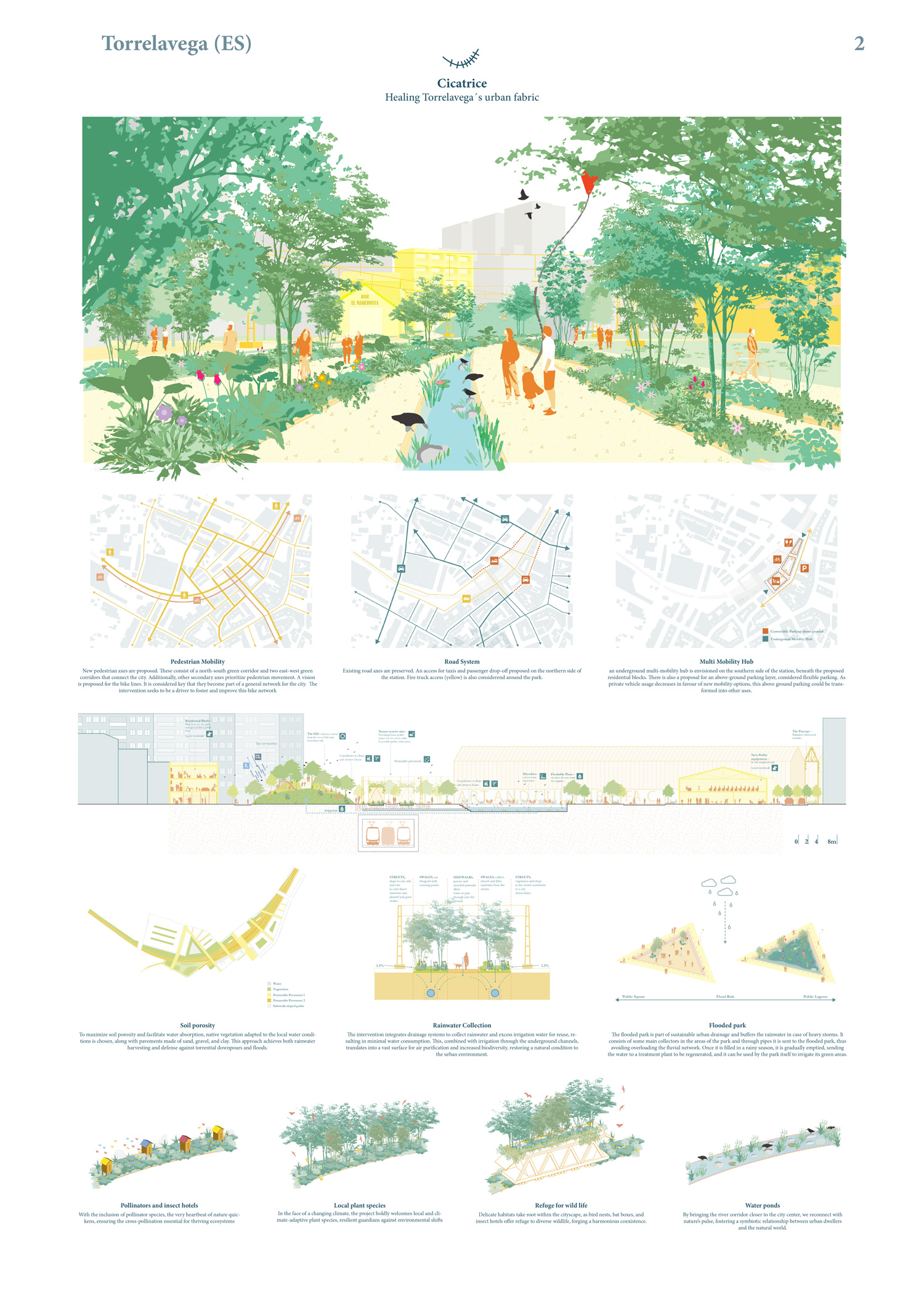 Addressing mobility concerns, existing road axes are preserved, and new green corridors are proposed for pedestrian movement. The project envisions a multi-mobility hub and underground bike lines, with a flexible above-ground parking layer that can adapt to evolving mobility trends. Water management integrates innovative drainage systems, rainwater harvesting, and native vegetation to enhance biodiversity. The project goes beyond a mere urban intervention and emerges as a beacon of hope for biodiversity, incorporating pollinator species, wildlife habitats, and climate-adaptive plant species to establish a harmonious coexistence between urban life and nature.