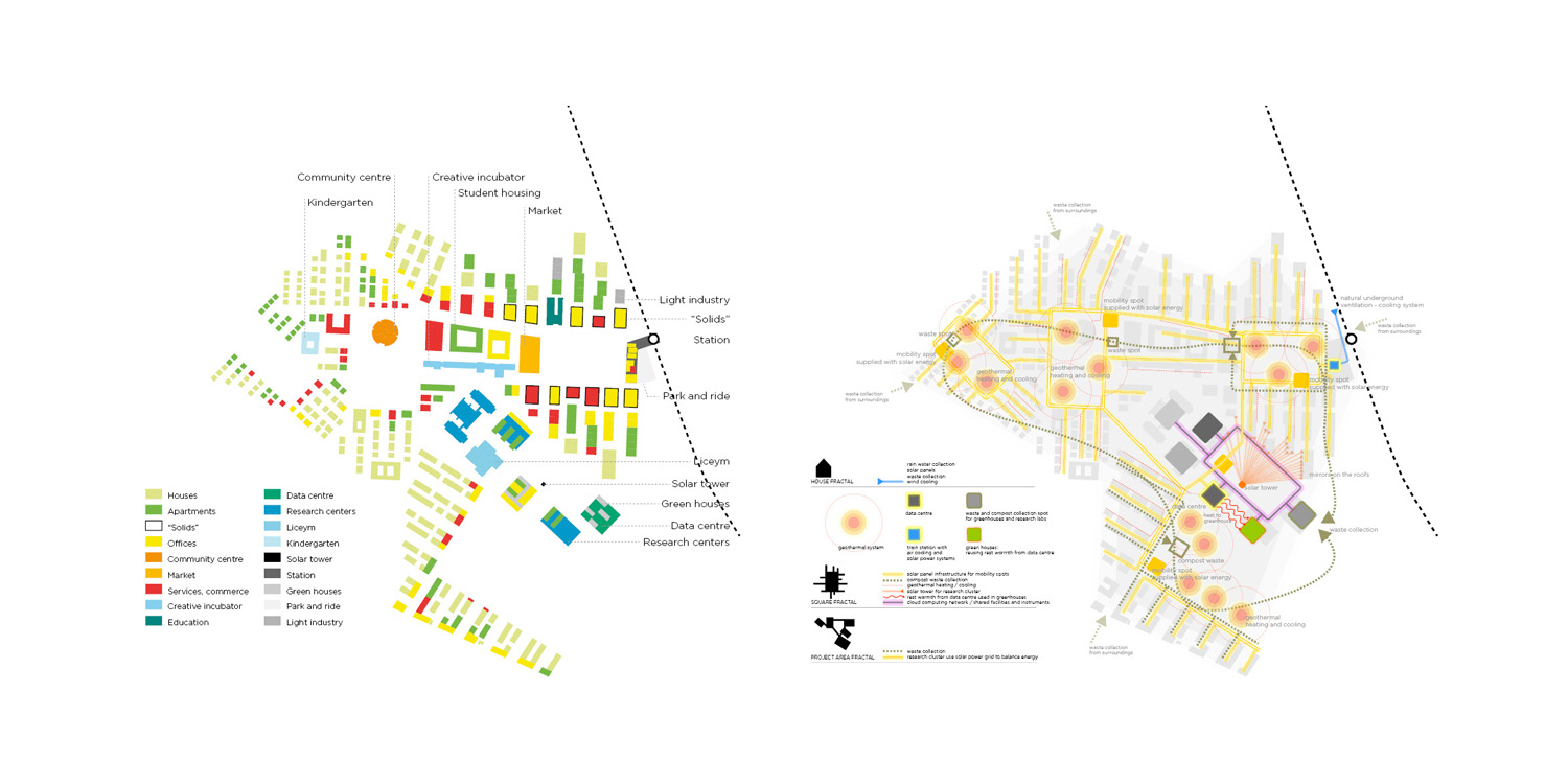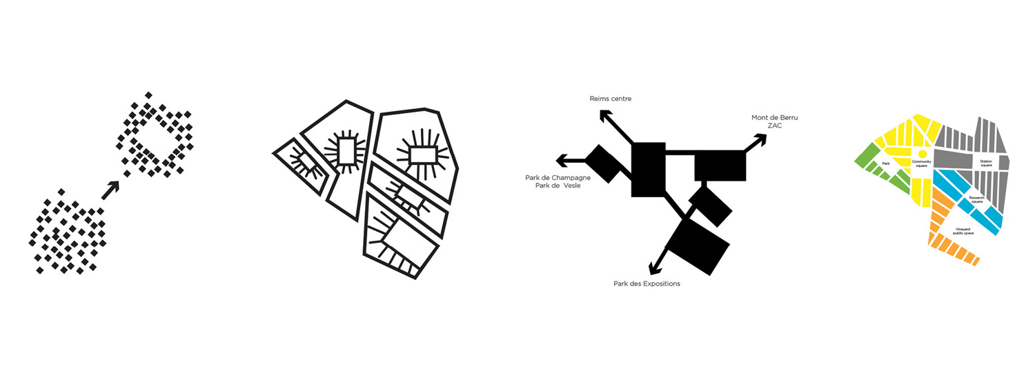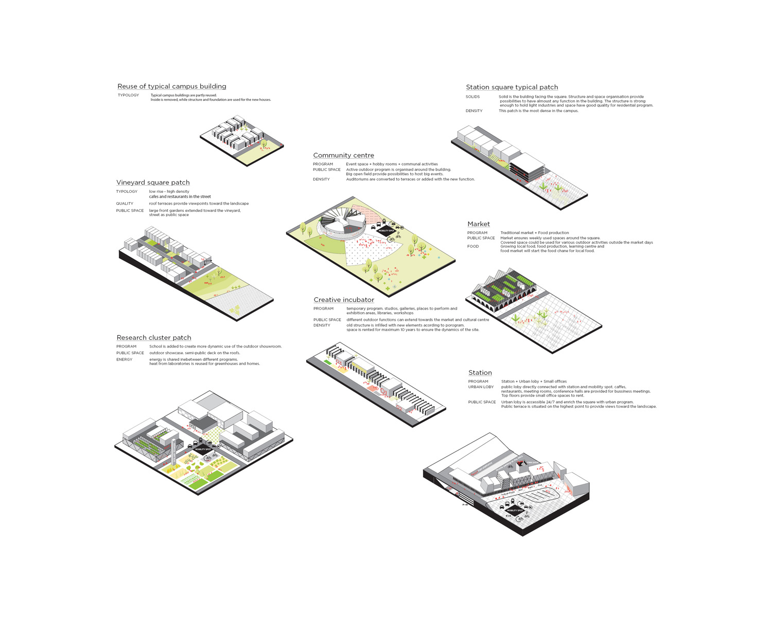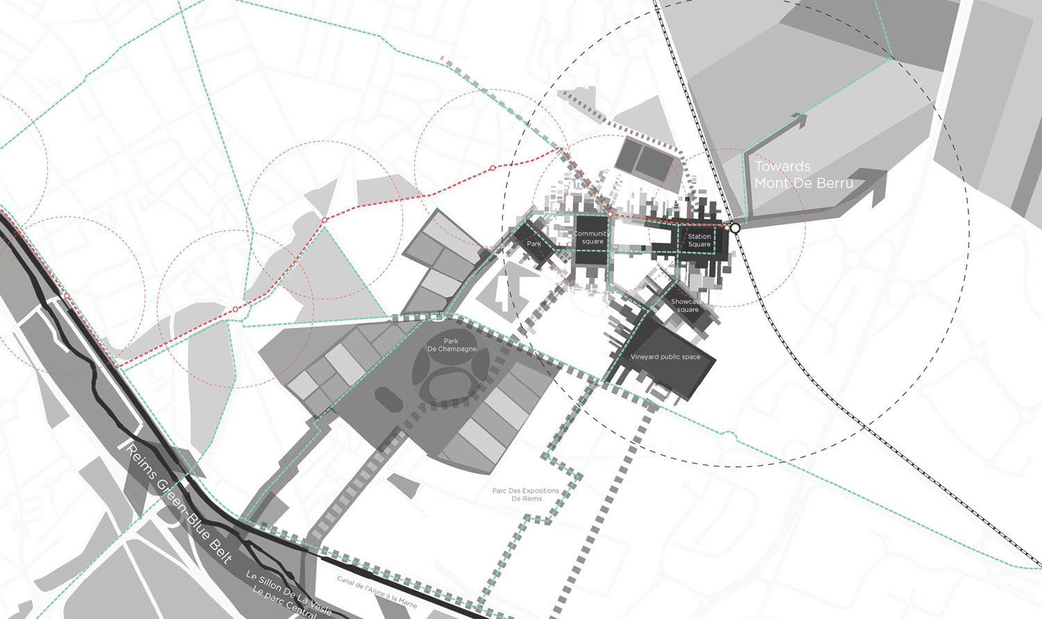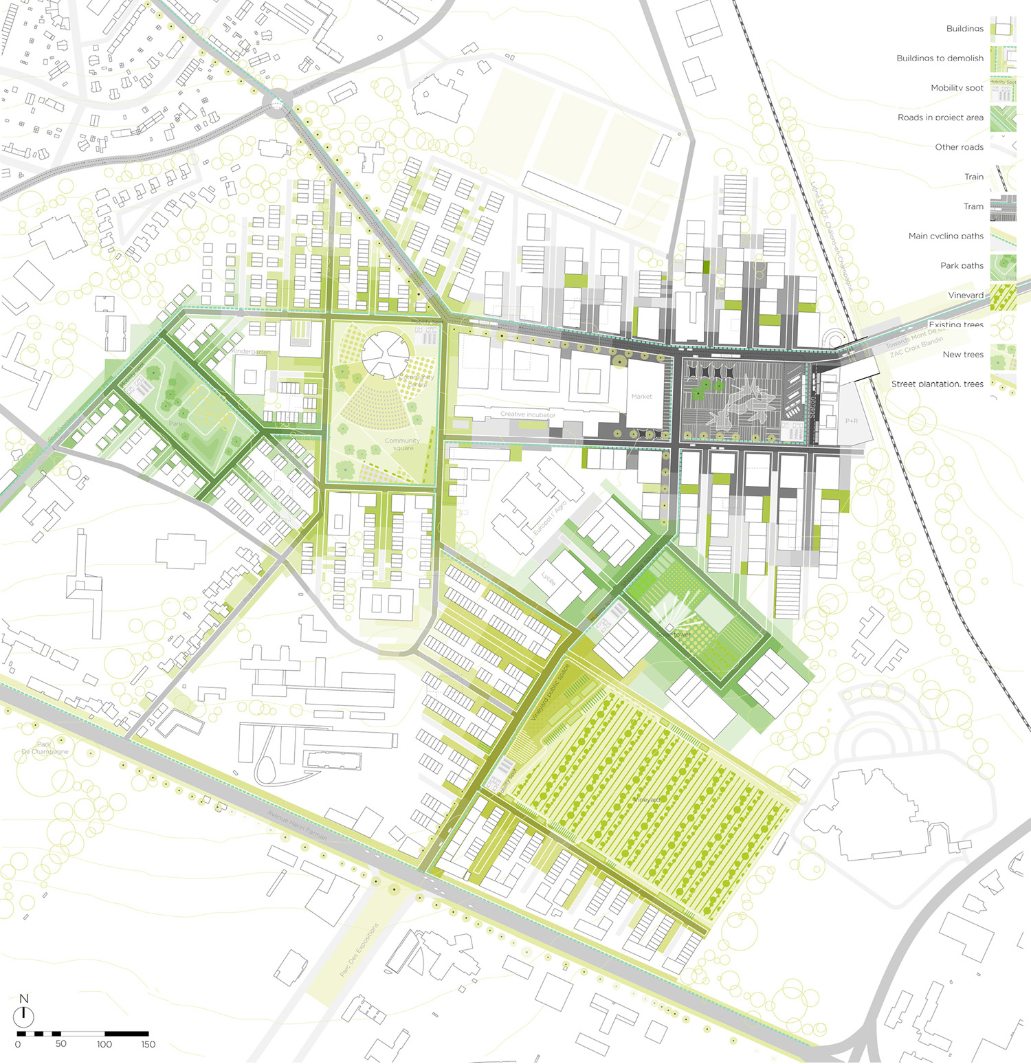 Multitalented city project addresses the issue of creating new identity for old university campus on the edge of Reims city in France. Campus is transformed into a district able to sustain by its own. New district produces and consumes its energy, is flexible and able to adapt to changes – environmental, societal and economic. Backbone of the project is five distinctive squares by routes connected into continuous public space network. Squares create different program clusters filled with typology, scale and function to strengthen character of the square. All these functions are bound by effective mobility system. Creating conditions to use sustainable forms of transport is an important objective of the strategy. Balanced public space structure together with diverse program and efficient mobility create multitalented identity of Moulin de la Housse campus. District becomes a pilot project of a dynamic, flexible and sustainable future city.