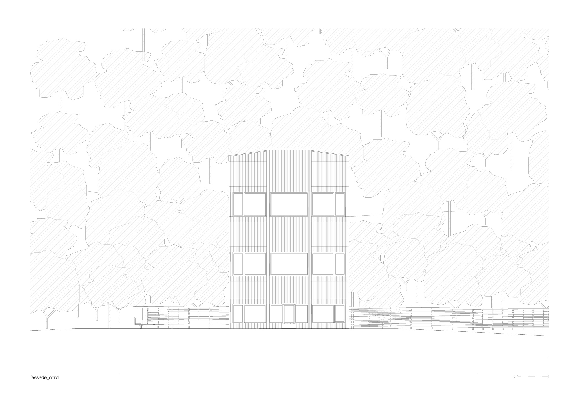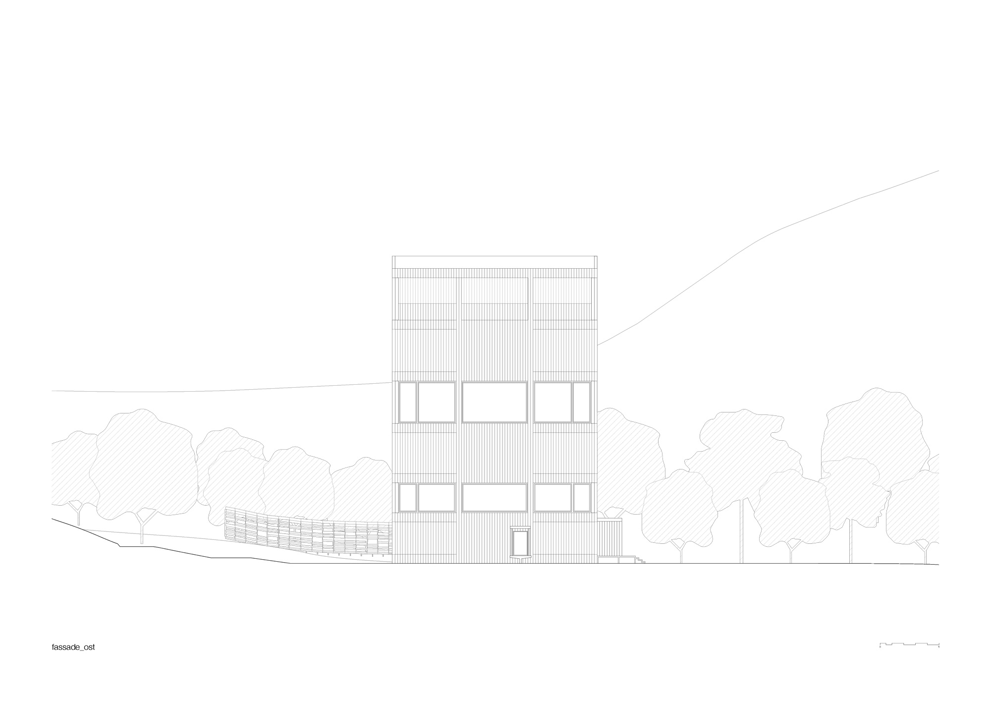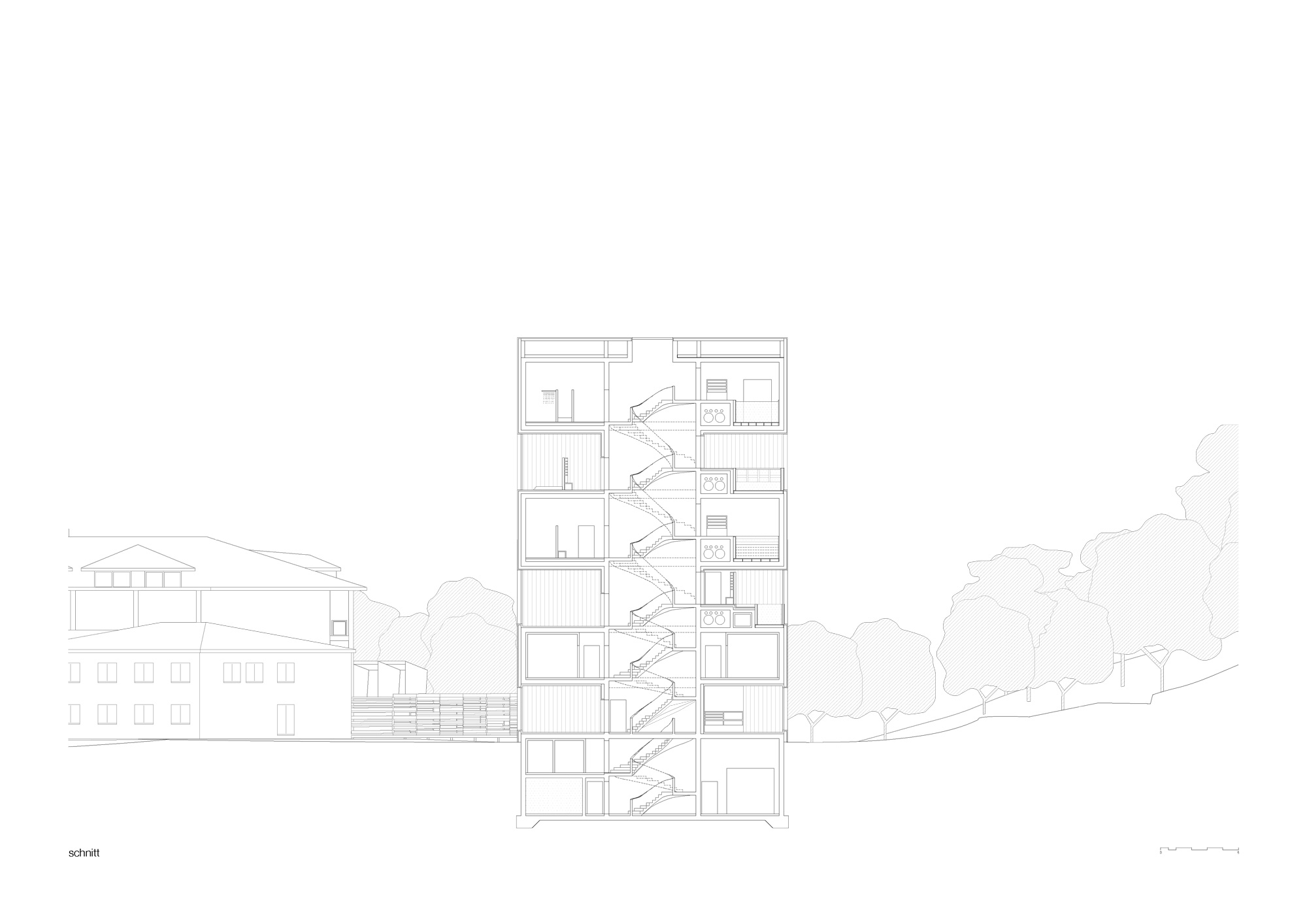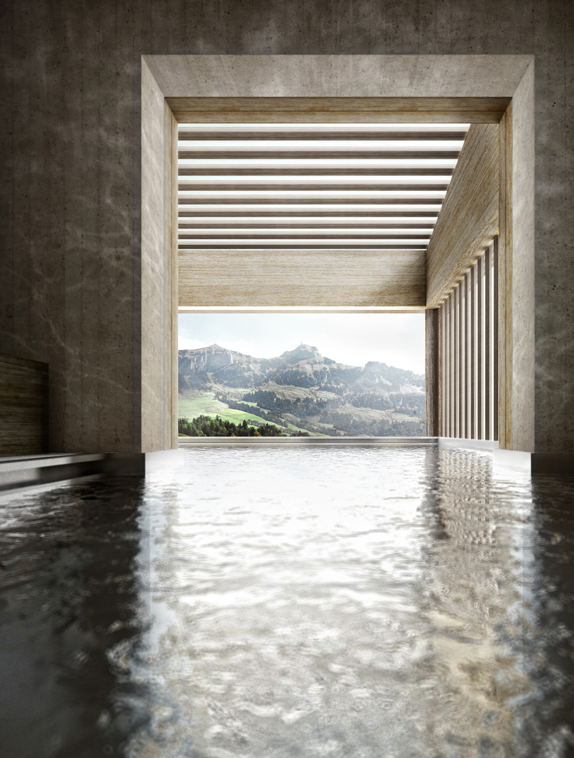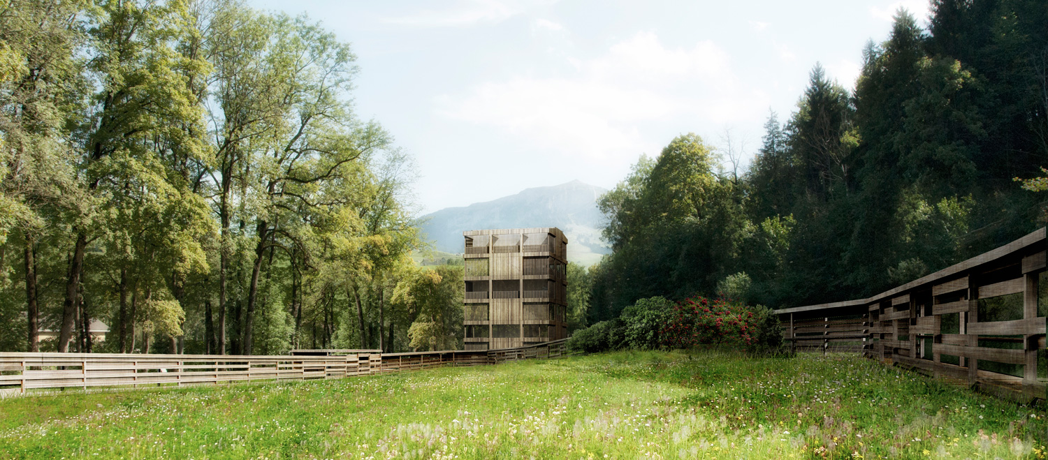 The landscape in which the existing hotel is embedded is hilly and burred with forest area and brooks. On the bottom of the valley a narrow clearance stretches from East to West. This open green space forms the spatial range of the Hotel. The new wellness building is intended to stand on the bottom of this valley. The minimal footprint allows continuing the open green area to both sides of the volume. Through placement of the volume views to the four cardinal points arise. To profit from them to the maximum the functions are organized vertically. To Northwest from the tower the pathway system extends to the landscape of “Glandenstein”. The covered path leads over the remaining landscape as a runway. The static and spatial structure of the volume supports the topic of the characteristic views to the four cardinal points. In the centre of the building is the core with its vertical allotment. Rooms are adjoined to two sides of this core. The three chambers form the inner bearer on which the ceilings rest. The space-containing beam alternates in each of the stories from East to West or North to South and therefore is opening free areas, which are facing the different cardinal points. The inner chambers of the space-containing beam create a withdrawn and secure atmosphere. The curtain-type facade of the new wellness tower is from larch wood. On the first layer it refers to the structural logic of the building. The stapling and rotation of the space-containing beam with each floor become the main topic of the facade.