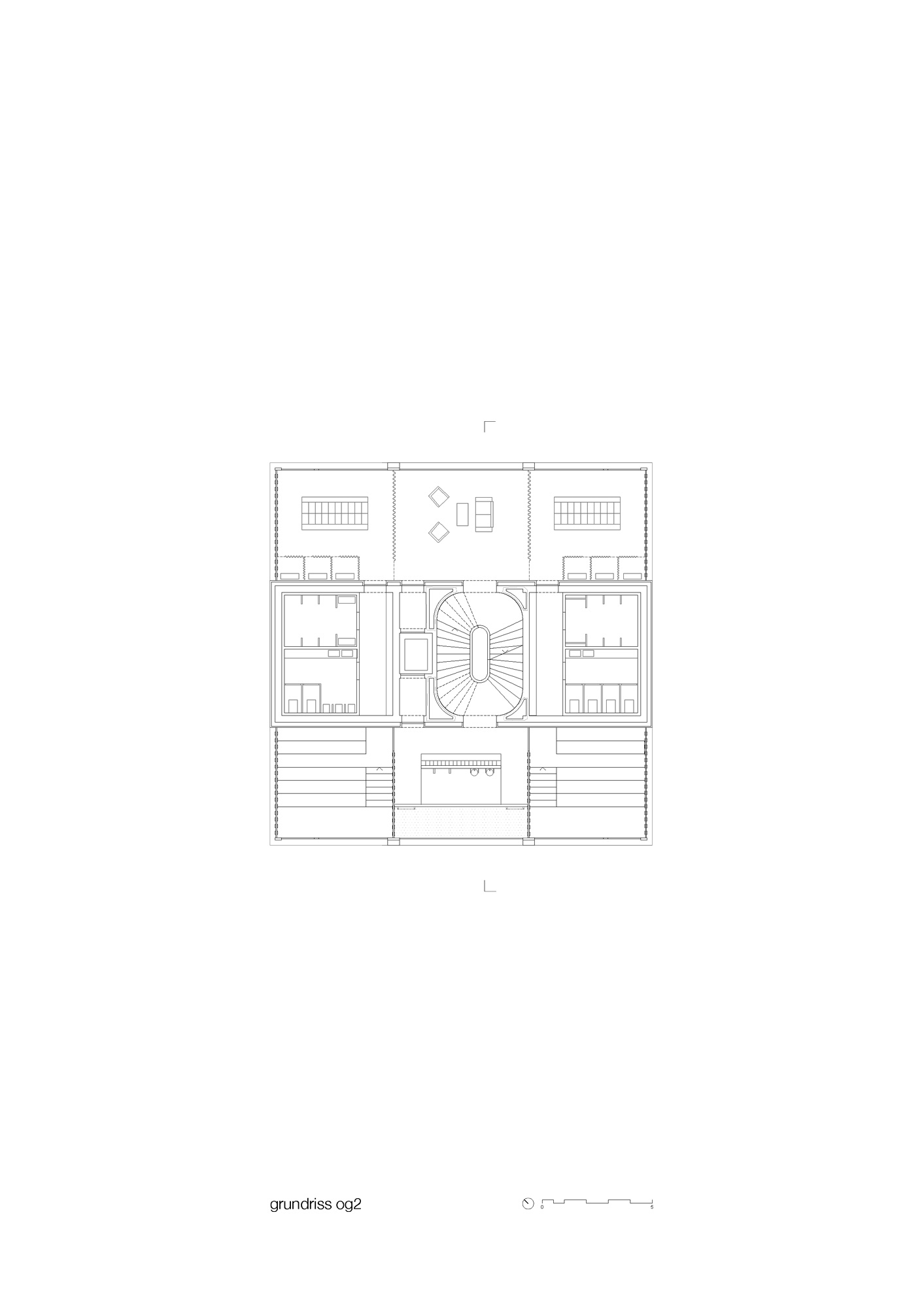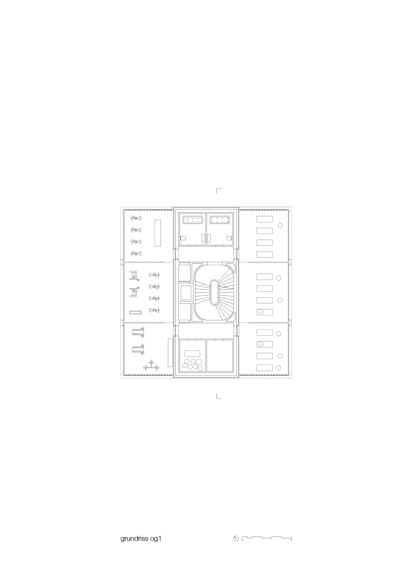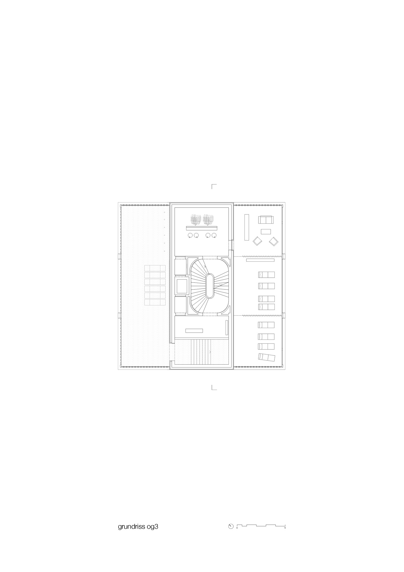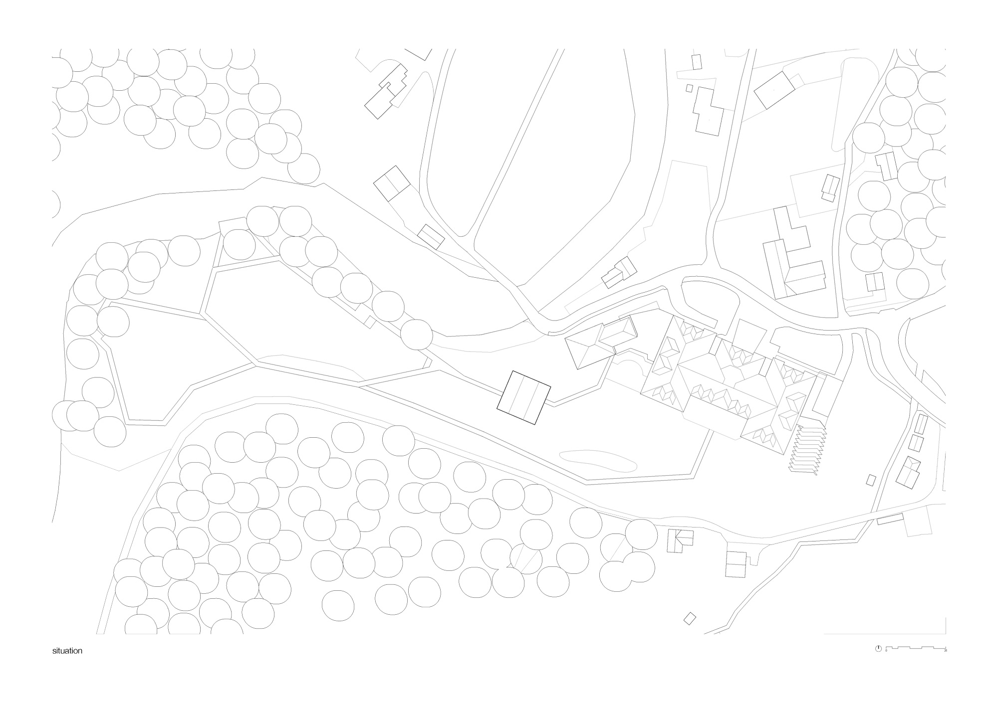 The landscape in which the existing hotel is embedded is hilly and burred with forest area and brooks. On the bottom of the valley a narrow clearance stretches from East to West. This open green space forms the spatial range of the Hotel. The new wellness building is intended to stand on the bottom of this valley. The minimal footprint allows continuing the open green area to both sides of the volume. Through placement of the volume views to the four cardinal points arise. To profit from them to the maximum the functions are organized vertically. To Northwest from the tower the pathway system extends to the landscape of “Glandenstein”. The covered path leads over the remaining landscape as a runway. The static and spatial structure of the volume supports the topic of the characteristic views to the four cardinal points. In the centre of the building is the core with its vertical allotment. Rooms are adjoined to two sides of this core. The three chambers form the inner bearer on which the ceilings rest. The space-containing beam alternates in each of the stories from East to West or North to South and therefore is opening free areas, which are facing the different cardinal points. The inner chambers of the space-containing beam create a withdrawn and secure atmosphere. The curtain-type facade of the new wellness tower is from larch wood. On the first layer it refers to the structural logic of the building. The stapling and rotation of the space-containing beam with each floor become the main topic of the facade.