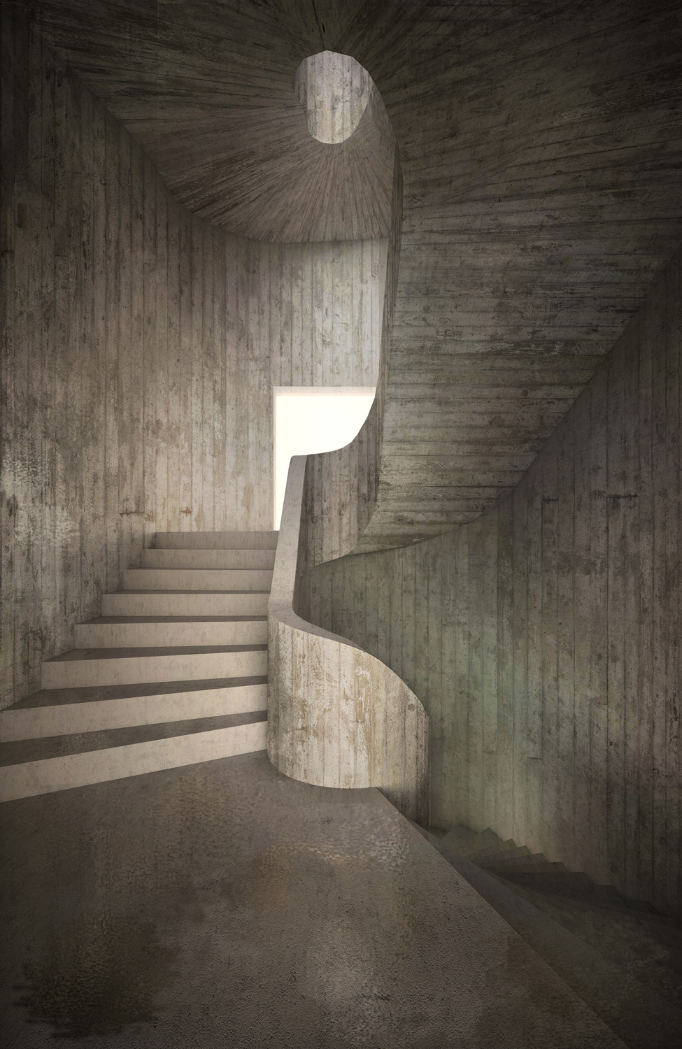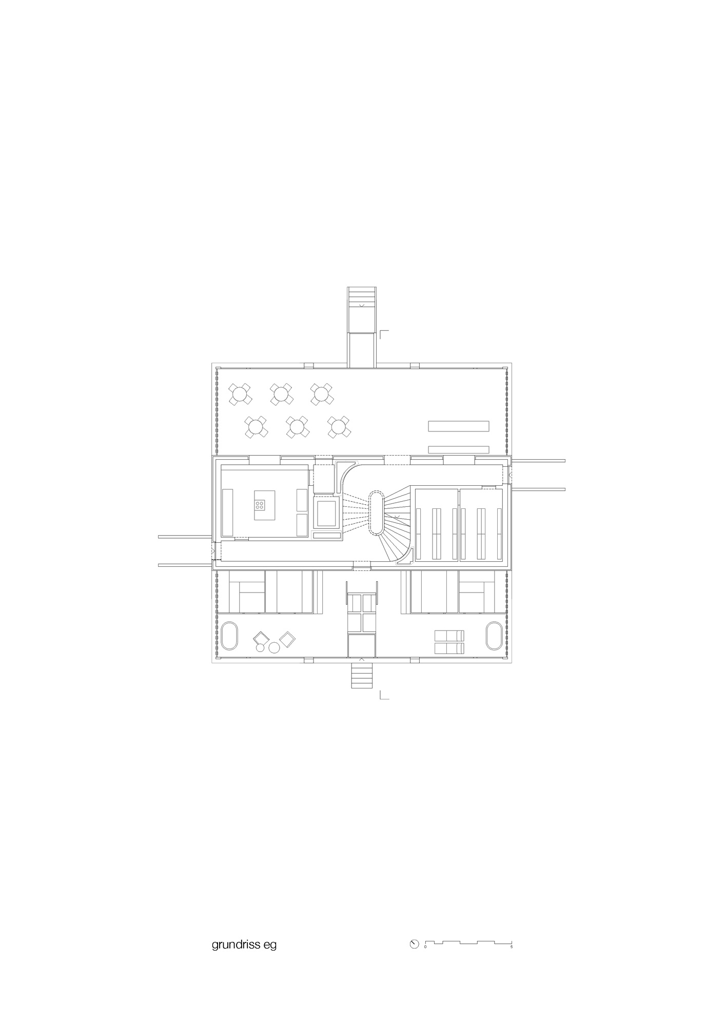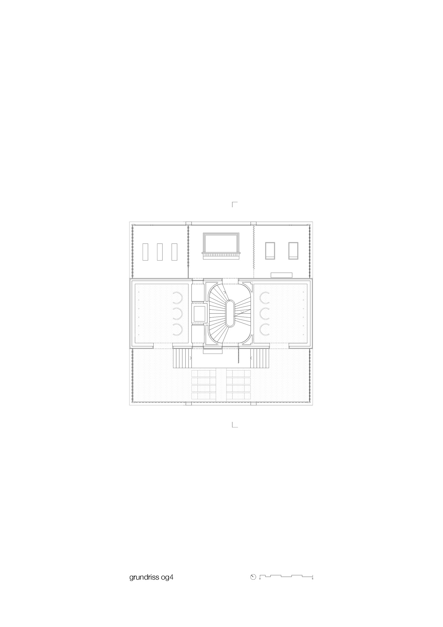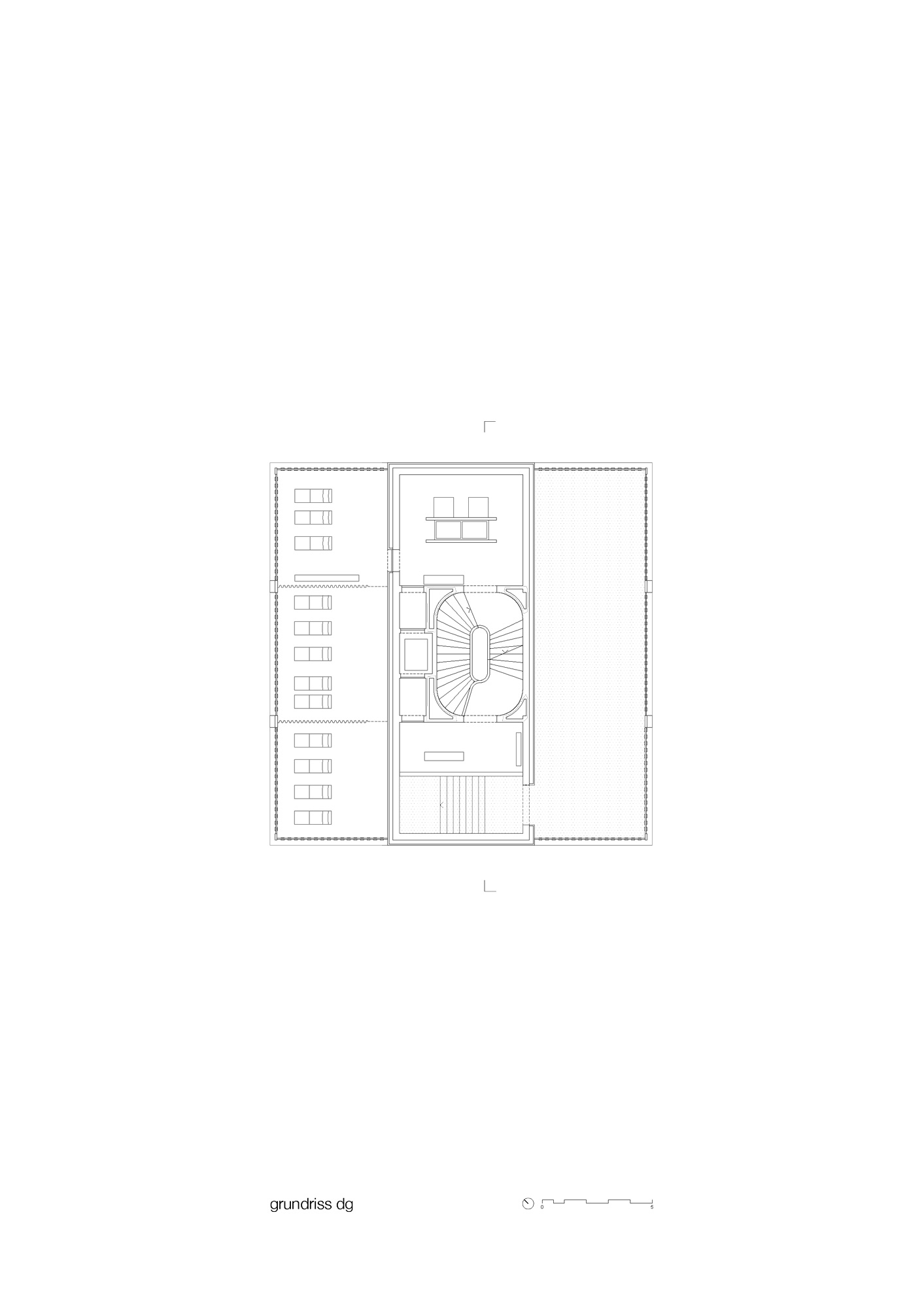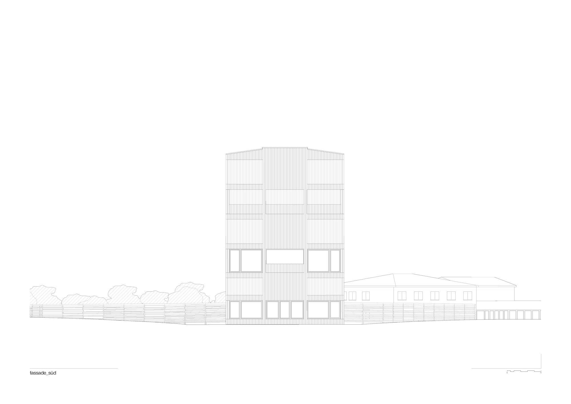 The landscape in which the existing hotel is embedded is hilly and burred with forest area and brooks. On the bottom of the valley a narrow clearance stretches from East to West. This open green space forms the spatial range of the Hotel. The new wellness building is intended to stand on the bottom of this valley. The minimal footprint allows continuing the open green area to both sides of the volume. Through placement of the volume views to the four cardinal points arise. To profit from them to the maximum the functions are organized vertically. To Northwest from the tower the pathway system extends to the landscape of “Glandenstein”. The covered path leads over the remaining landscape as a runway. The static and spatial structure of the volume supports the topic of the characteristic views to the four cardinal points. In the centre of the building is the core with its vertical allotment. Rooms are adjoined to two sides of this core. The three chambers form the inner bearer on which the ceilings rest. The space-containing beam alternates in each of the stories from East to West or North to South and therefore is opening free areas, which are facing the different cardinal points. The inner chambers of the space-containing beam create a withdrawn and secure atmosphere. The curtain-type facade of the new wellness tower is from larch wood. On the first layer it refers to the structural logic of the building. The stapling and rotation of the space-containing beam with each floor become the main topic of the facade.