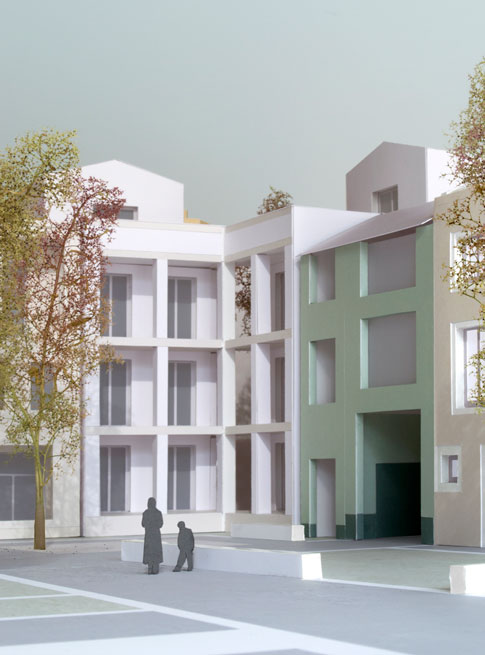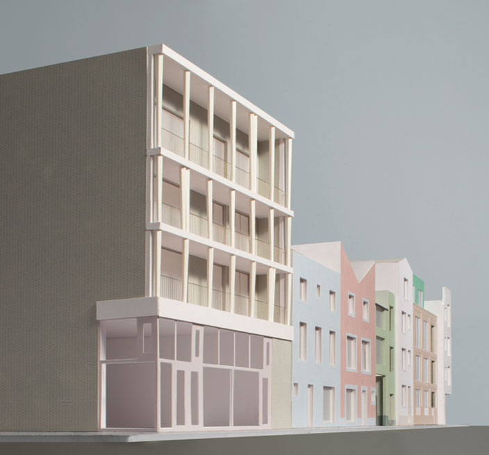 This project for an apartment building in Antwerp, with 36 flats, shops and offices, in a limited competition organised by the City. The L-shaped apartment building designed by Caruso St John is part of a city block with further housing by Flemish architects Bovenbouw and ONO architectuur, and dutch architects Rapp + Rapp. The design is the second phase of a masterplan by Rapp + Rapp to redevelop the site of a formers seamen’s hostel in a dense part of the city near the docks. The developer partner in the competition was CIP, who are building both phases. The different scales of the apartment building and the houses, as well as the different designs made by the architects, is a conscious attempt to make a city block with the enjoyable variety that is found in a typical street or city block. The apartment building and the houses together enclose a quiet courtyard with a garden, which can be entered from the surrounding streets by passages through the buildings. The apartments in the L shaped building have wide balconies facing south and west, overlooking the garden courtyard and a small park to the west. The balconies are designed as loggias held up by figure-like columns of precast concrete. The facades try to avoid the systemisation that is associated with much urban housing of this scale, to make open elevations that have a close association with the spaces that they address. On the ground floor around the courtyard are community functions including a kindergarten, studio spaces and a cafe.