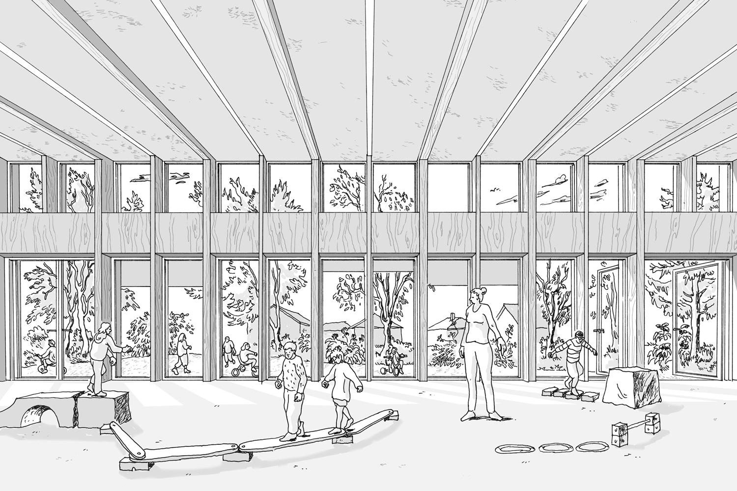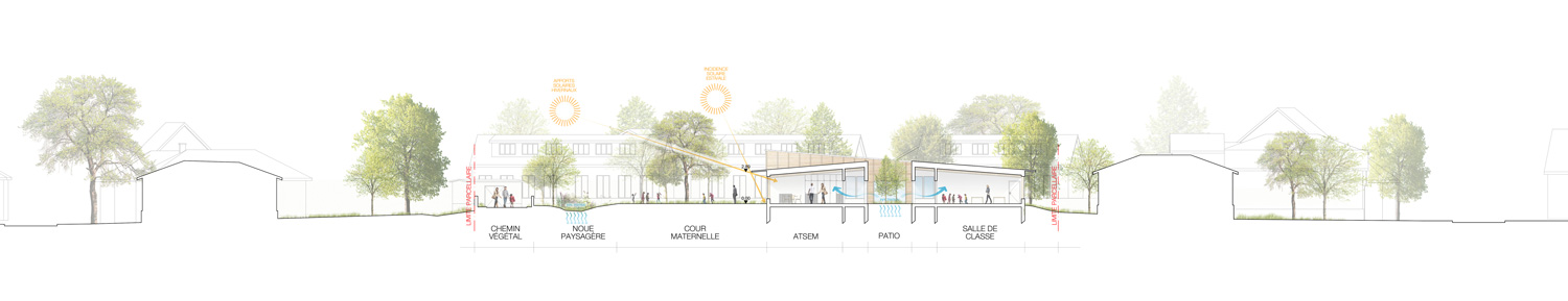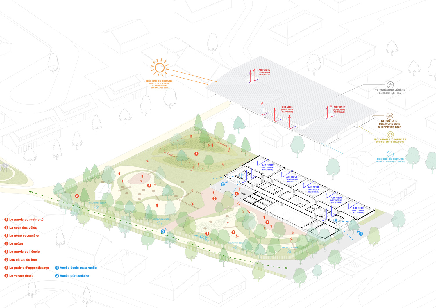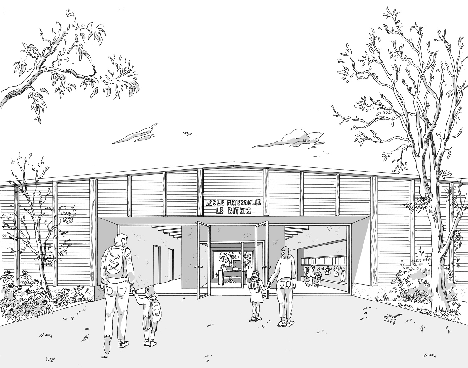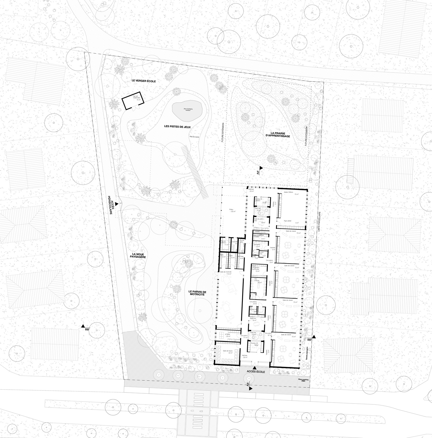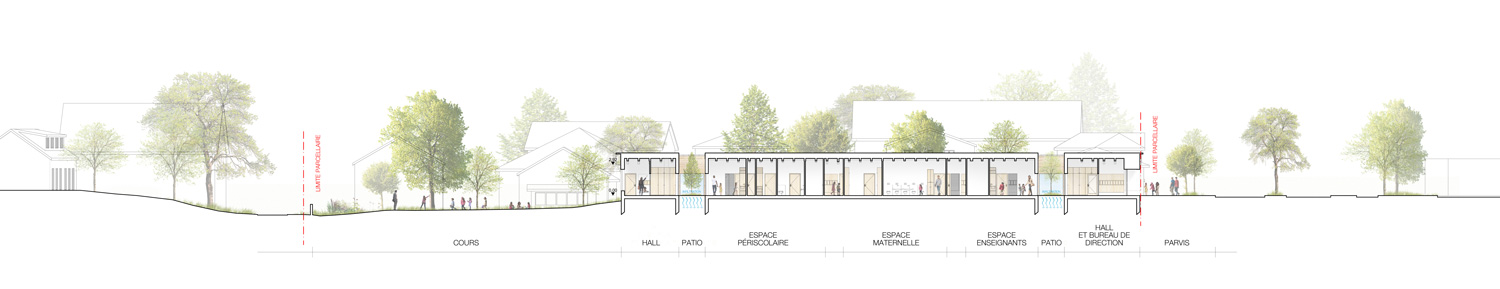 The construction of the new Gambsheim nursery and after-school care centre aims to meet the town’s needs for new childcare facilities. Our approach is to make the school site an interface at the edge of the town, linking the heart of the suburban neighbourhood with the sports field and its facilities on the terrain below. A gentle northsouth crossing of the site enables this transition. The project as a whole has a familiar and reassuring archetypal style, reminiscent of the home, but also of the suburban environment. Our choice of construction system and envelope favours flexibility and modularity of space. It is a simple, rational layout that makes it easy to build an extension within the same volume, hence opening up the possibilities.