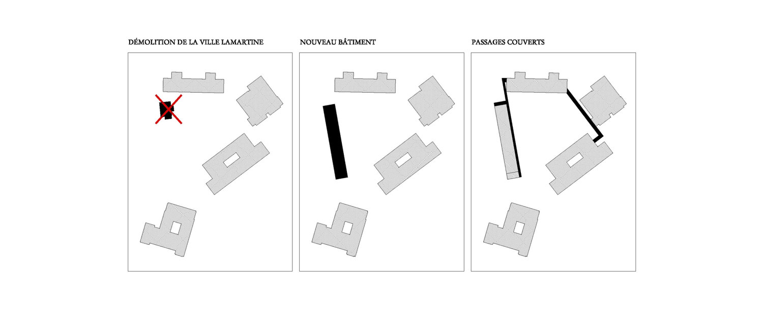 Notre intervention serait de démolir une ancienne maison locative, la Villa Lamartine. Afin d´améliorer sensiblement l´accès par la Rue Faller, et d´établir des conditions de départ appropriées pour la construction d’un bâtiment qui réponde au nouvel usage et s´intègre avec le reste des pavillons. Le nouveau bâtiment est un simple volume de deux étages, qui est situé en direction nord-sud, avec une galerie à portiques qui parcourt toute sa longueur et essaie de créer un nouveau “rideau de fond” pour les activités du parc et du préau. La rangée de colonnes, qui s´intègre dans les promenades du parc, offre un espace protégé et ombragé, renforce et améliore l´accès par la Rue Faller en reliant le nouveau pavillon avec les bâtiments actuels de l´école.