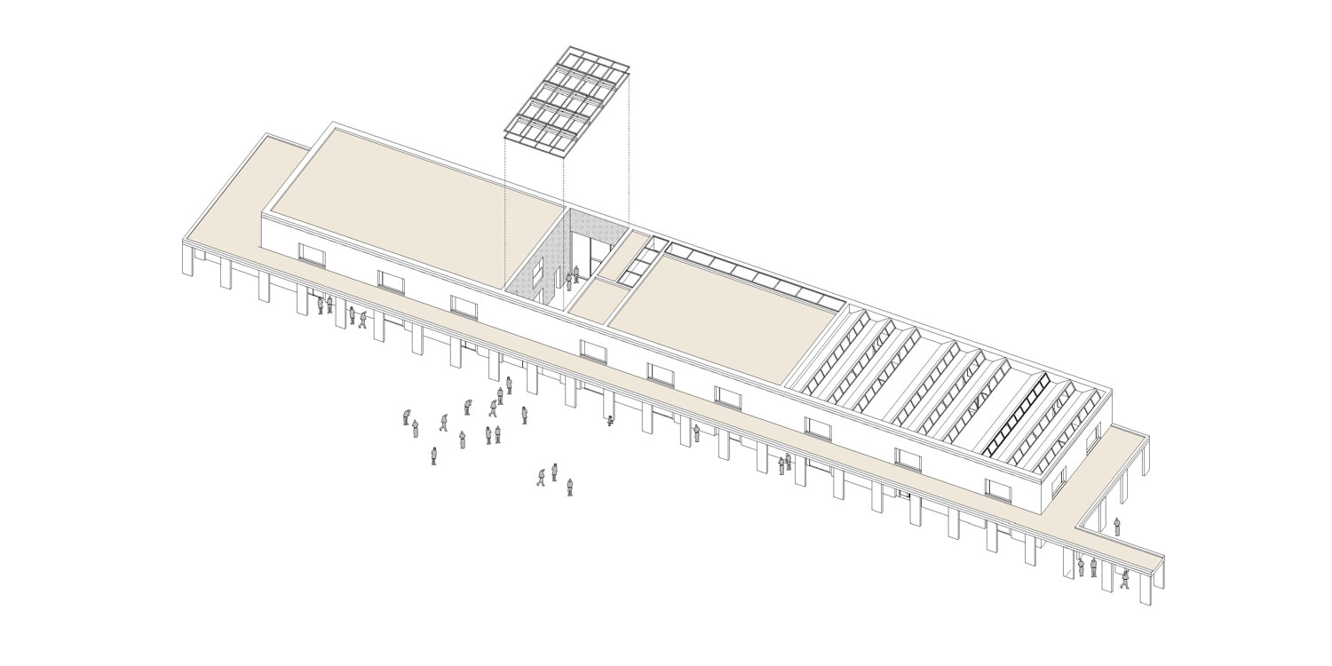 Un grand hall d´entrée de 7 mètres de haut traverse le bâtiment, et le rend perméable aux vues en s´intégrant parfaitement dans l´environnement et les parcours piétonniers. Le programme s’articule d´une manière simple à partir du Hall. Au rez-de-chaussée et à droite: le réfectoire, au rez-de-chaussée et à gauche: les locaux de répétition de musique. La totalité du premier étage est occupée par les locaux parascolaires et des espaces polyvalents. Les locaux des espaces verts se trouvent annexés au bâtiment avec un accès pour les véhicules, tout en s´intégrant au-dessous du toit de la galerie à portiques. Des cloisons pliables cachées dans les murs, permettent de former un seul espace ou des salles différenciées dans les 150m2 de la salle polyvalente et les 280 m2 du réfectoire. Les deux espaces sont dotées d´un éclairage zénithale à travers de lanterneaux.
