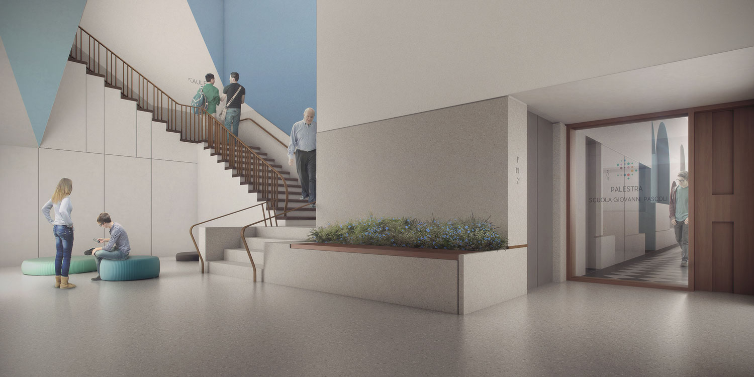 While developing the proposal for the G. Pascoli School, the main goal has been to provide a stronger identity and autonomy to a building which in the current situation looks like the mere result of a functional organisation. In order to implement this process, the project points out the building’s features to reveal its spaces. This is achieved through the improvement of the space perception. The project guideline has been a complementary approach to the building: on one hand, the concept of the permanence, its value and perception with the inclusion of mass elements; on the other hand, the ephemeral, the temporary, emphasised with a strong flexibility among spaces. One of the main aspects of the school of the future is to be a place opened to the city. For this reason the project aims to create a public space as an element according to the urban structure of the city, aiming to produce deeper value than the simple shape of the building itself and its space.