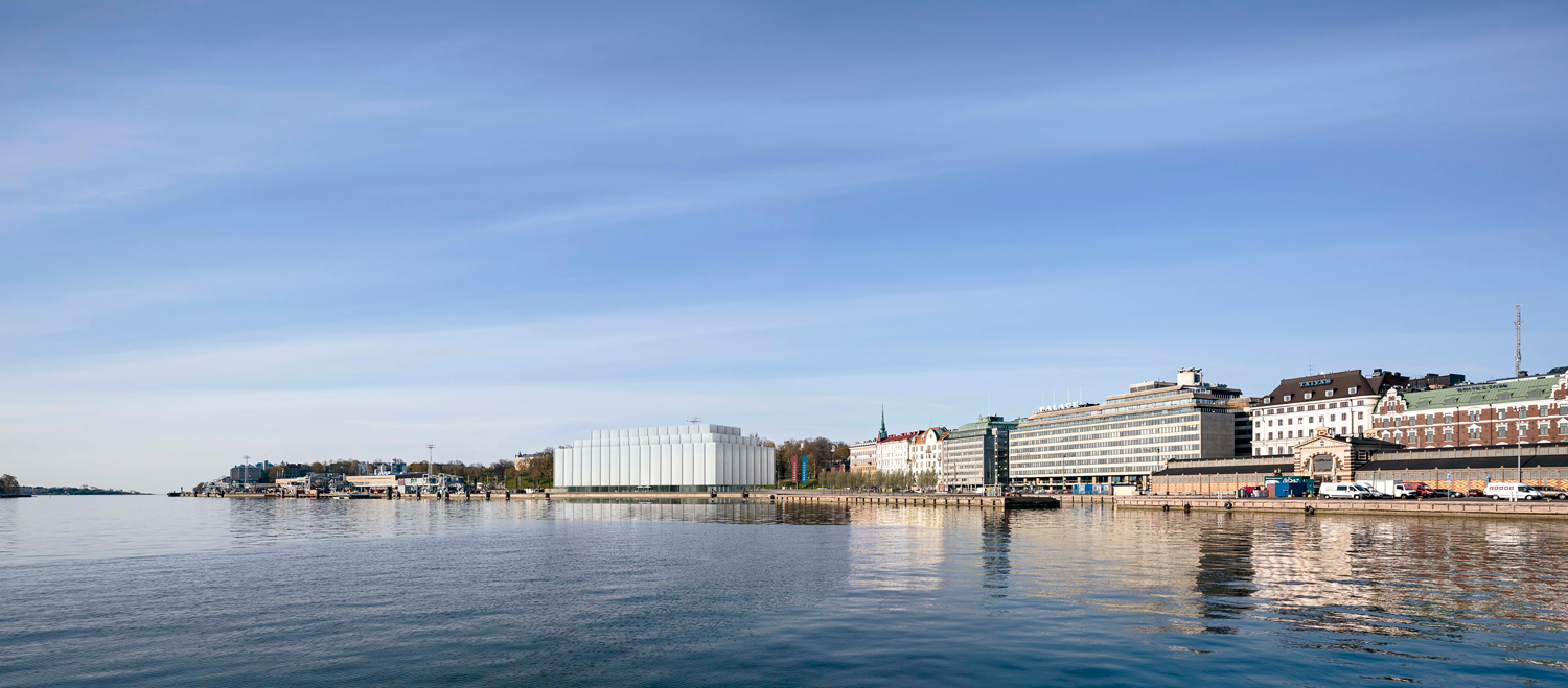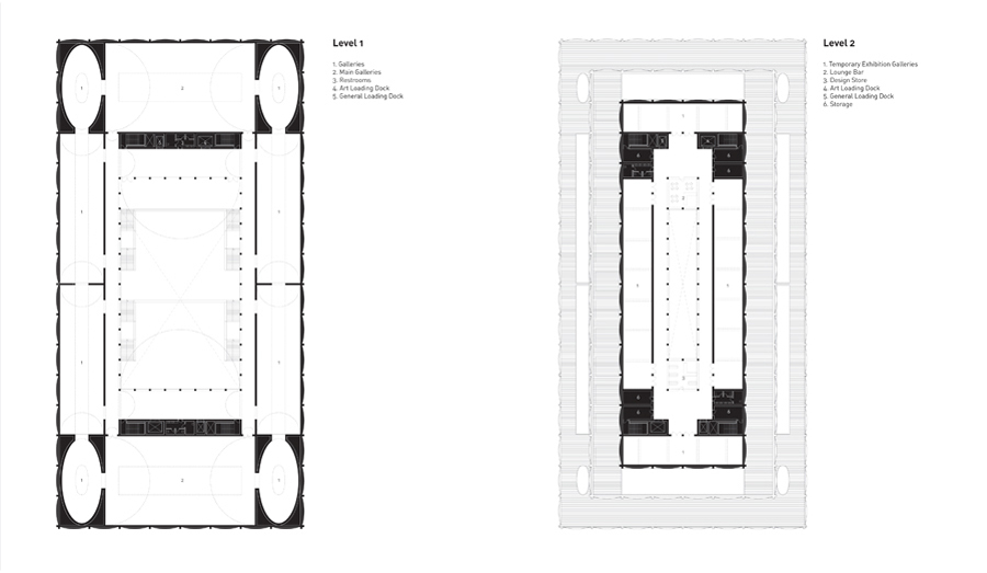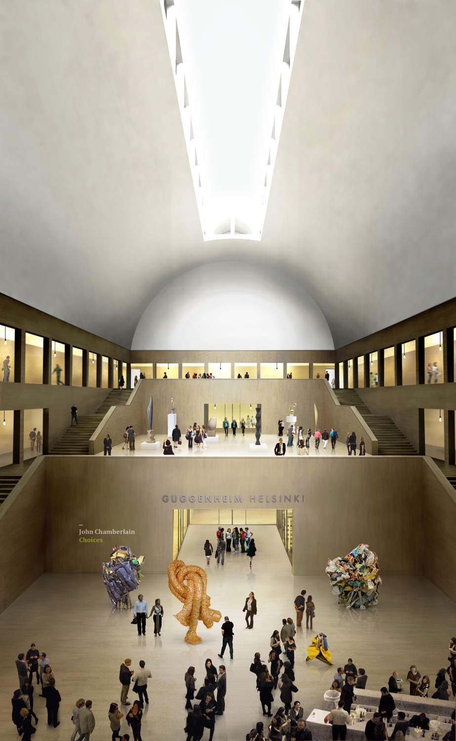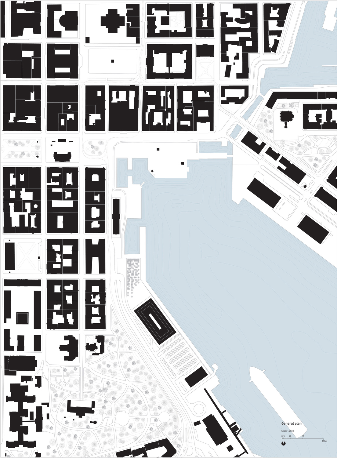 The proposal for the new Guggenheim museum in Helsinki is based on the attempt to act in accordance with the neoclassical grid layout of the historical city. Placed at the intersection of two different grid orientations, the new museum is conceived on one side as a terminal element for the continuous street facades that surround the harbor, and – on the other side – as an urban exception, underlined by its different orientation. The volume of the new museum is based on the dimensions and proportions of the surrounding blocks and – considered its proximity to the port – its scale has to be related to the mass of the gigantic ships floating in front of it. The simple exterior volume mimics the “indifference” of the industrial port buildings, which surround the harbor. The museum is intended to enclose a new public space in front of it: an open stage positioned between the frontal facade of the new Guggenheim, the existing urban blocks along Eteläranta and the waterfront. An artificial urban “forest” is placed at the entrance of this new public space, acting as proscenium that separates the urban space and the “art space”. It is here that the visitor’s journey can begin.