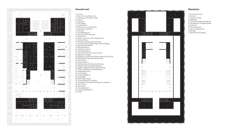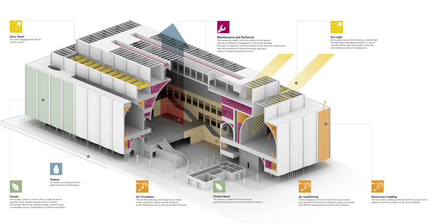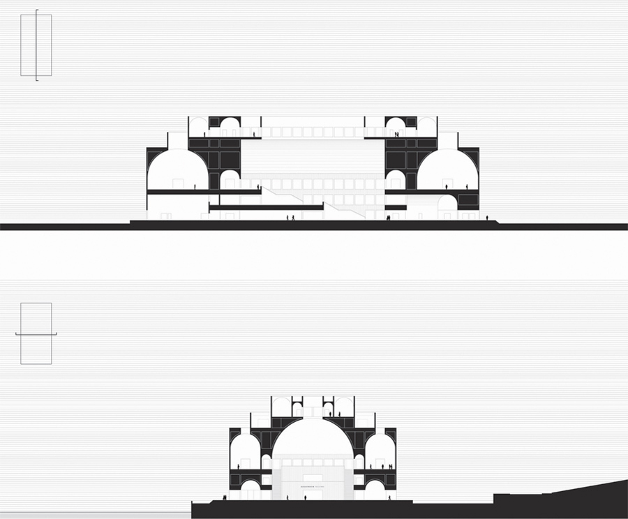 Passing through a lowered and narrow entrance, surrounded by the ticket office office and the other services, the visitor would enter into a generous vaulted atrium conceived as a covered public square illuminated by zenithal light. This internal space, disconnected from the urban life and the external mutable weather, would be always active and lively. Two lateral stairways lead from the ground level, through a mezzanine with the multipurpose space, to the interior arcade, which connects all the exhibition spaces. The intention of the project is to increase the physical and critical distance in the visitor’s access to the exhibited art. The interior atrium, the real heart of the museum, is conceived as a void, a timeless and autonomous space in which the “spectacle” of art can take place. The ambition is to construct a surprising progression in which the visitor, passing through a sequence of spaces and experiences, can finally find an abstract space dedicated to art.