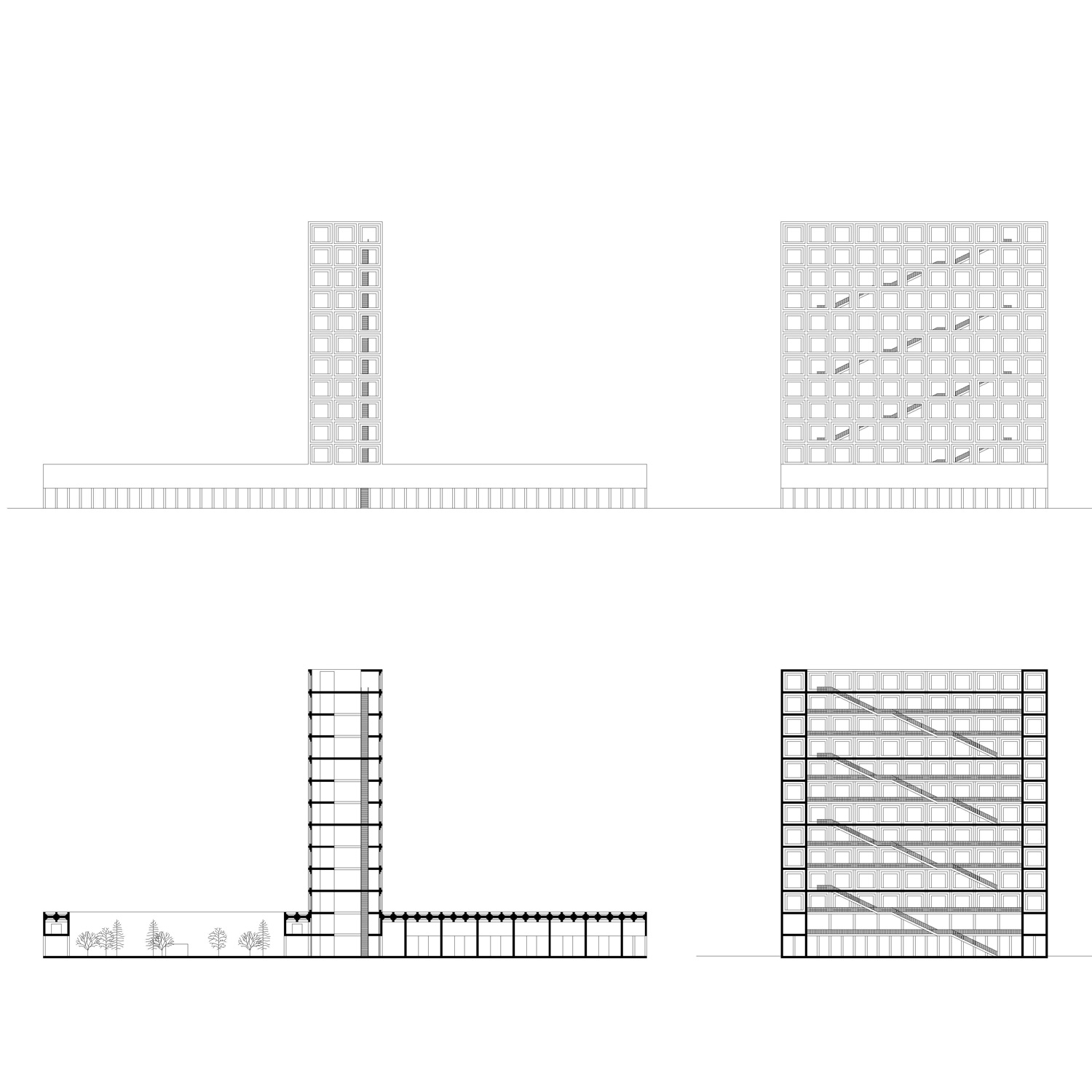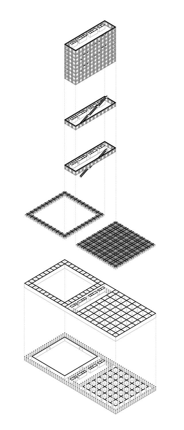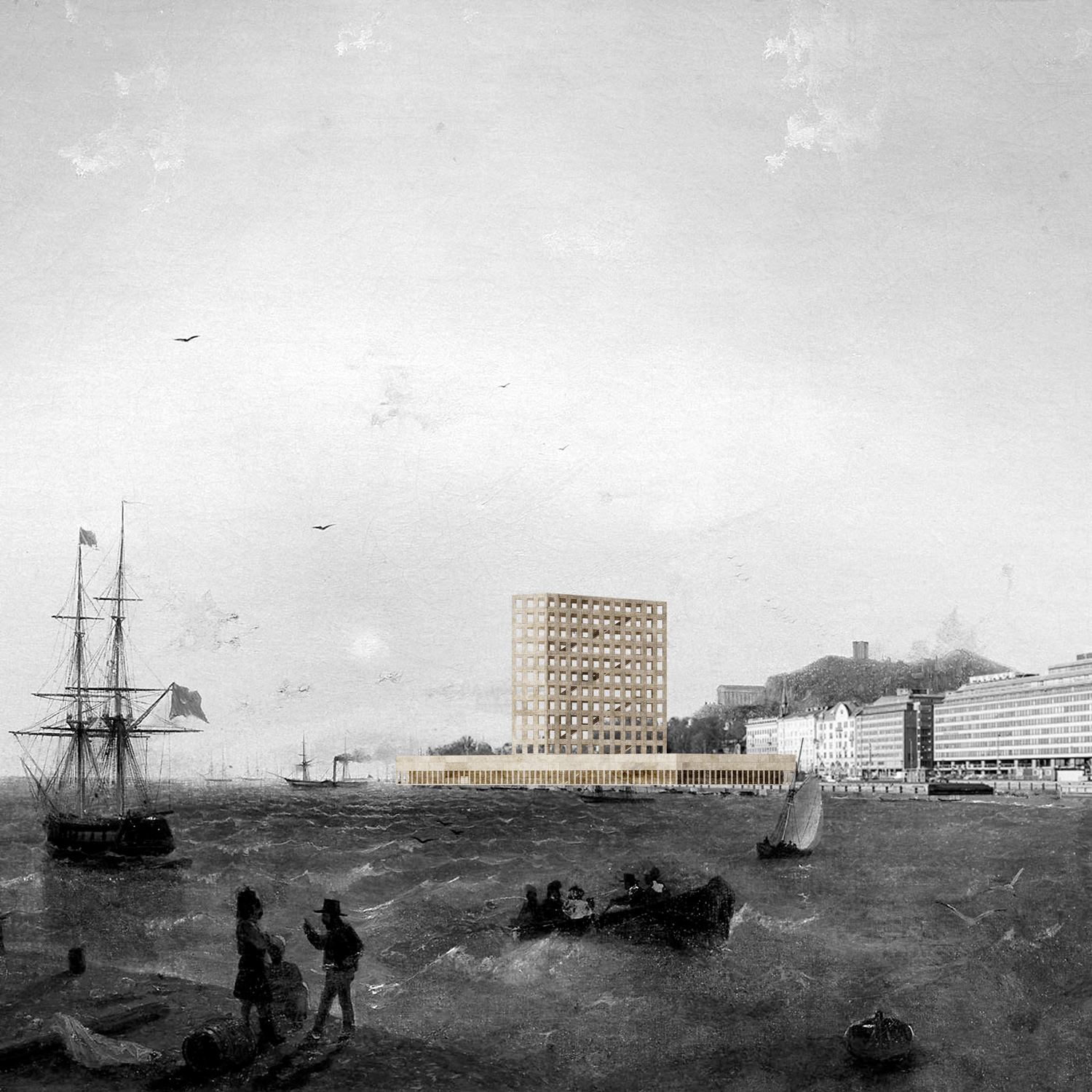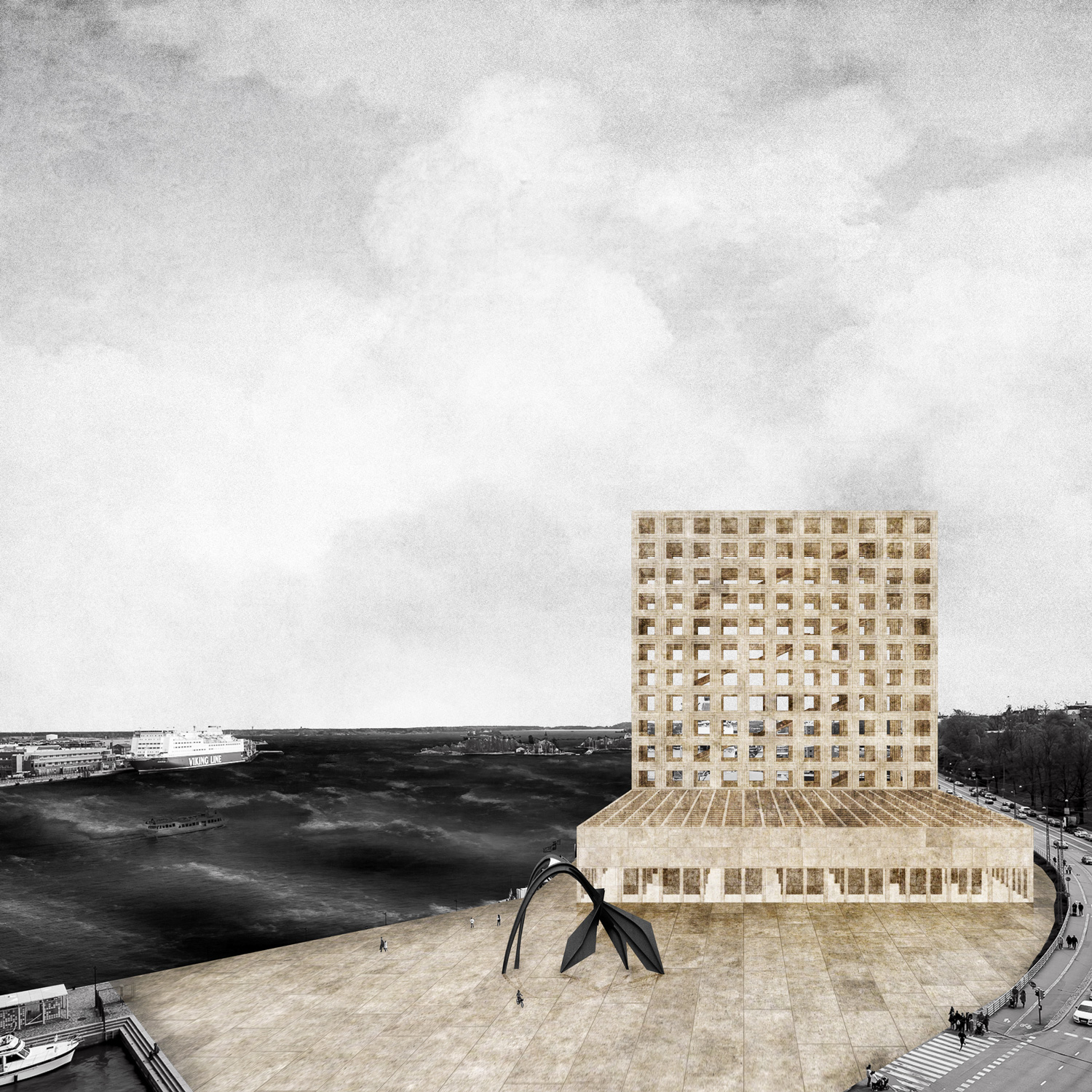 à la premiere partie horizontale du Musée qui fait le lien entre espaces publics, et contenu et performances artistiques, vient s’élever une extension verticale et fine centrée sur la dalle horizontale, à l’intersection de la « grille de chambres » et du jardins interieur. Ces deux éléments perpendiculaires forment une seule entité qui devient un nouveau landmark dans le paysage portuaire, à l’image d’un immense voilier. Dans cette partie haute du Musée on retrouve des espaces d’expositions de grande hauteur, restaurants avec vues panoramiques, boutiques et des espaces de projections. Cette mise en scene verticale de l’Art reflete l’envie d’exposer la richesse et la variété d’un contenu, d’une programmation artististique de manière frontale avec la ville. Le projet ne tendt pas à se fondre dans le paysage mais plutot à revendiquer une présence assumée dans son contexte portuaire et dans le skyline de la ville d’Helsinki, en offrant les outils appropriés et adaptable à l’expression de l’Art et aux changements de société.