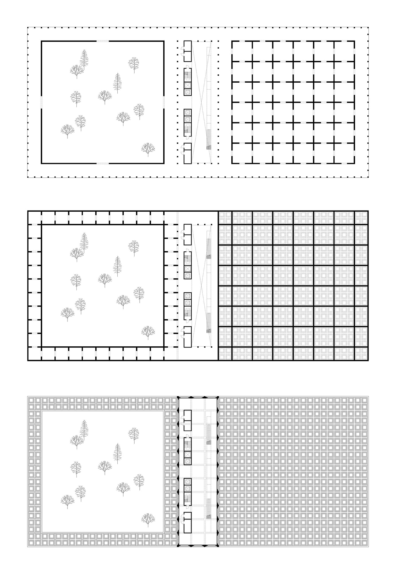 Horizontalement, le nouveau Musée se comporte comme une extension de l’espace public de la ville en proposant la juxtaposition de deux espaces rationnels et géométriques basés sur une declinaisons d’un plan en grille. Il y a d’abord un espace couvert éclairé zénitalement qui propose une succession de « chambres » génériques accolées les unes aux autres sans couloirs. Le choix de l’utilisation d’une grille dans toute sa radicalité offre une disponibilité à l’usage. Mais plus qu’un systeme économique en terme de gestion de l’espace ou d’une flexibilité programmatique, cette configuration tend à valider l’existence meme du contenu muséal et de la variété de ses manifestations. La mise en place en série d’éléments structurels simples comme la poutre, le poteau ou la cloison, ne repondt pas seulement à des fins contructives mais définit également l’expression formelle du Musée, sa materialité propre. Les éléments architectoniques sont dupliqués, agglomérés, épaissis, pour revendiquer l’architecture identitaire du Musée. En complément de cet espace couvert, les performances artistiques peuvent s’exprimer dans un espace ouvert, un jardin interieur délimité par une enceinte de pierre naturelle qui habrite une galerie pour les expositions temporaires et les ateliers.