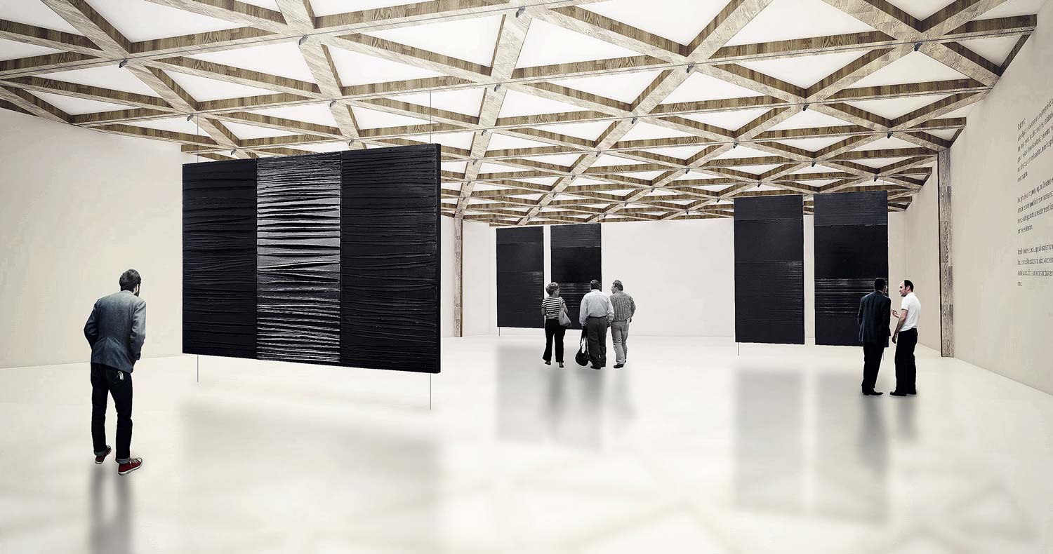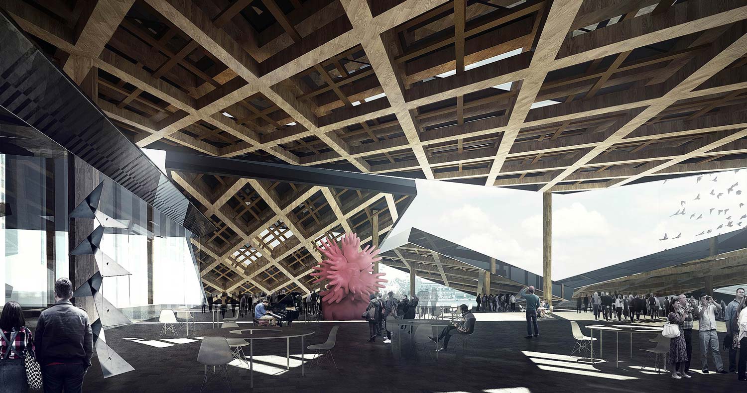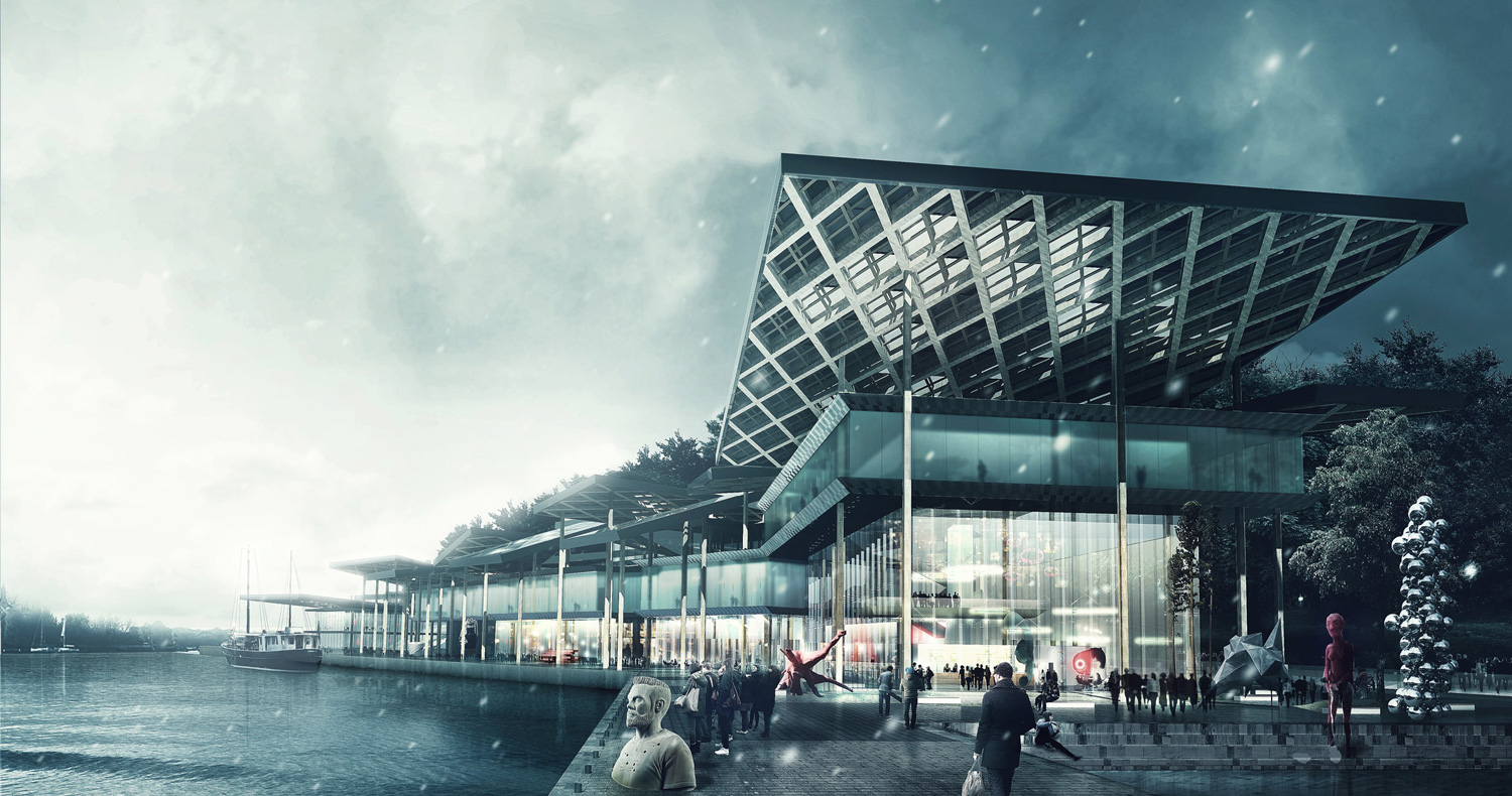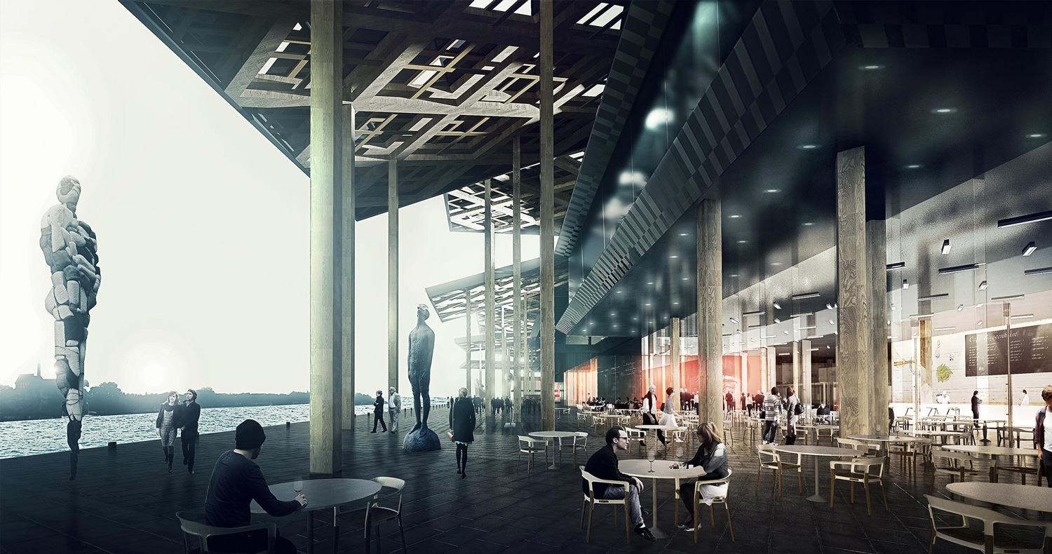 The project is developed on the ground floor along the banks, creating a quality public space between waterfront and Museum activities. An imposing hall marks the main entrance located on the parvis in direct relation to the market in the North. The public space is then developed on either side of the building and meets on the south, focusing flows of different access as well as from the park. The porosity of the base is increased by the introduction of a unique flooring, creating an in-between space, erasing the boundaries on the ground floor. The entrance of the museum distributes a major place of sociability in the project, the multi-purpose area, that acts as the main catalyst flow in the museum. This space is a real articulation between restaurant, workshop and artistic works. Moreover, technology has a ratio of ubiquity particularly present at this level of the buildings as touch screens integrated throughout the course. On the upper levels the Exhibitions rooms are designed as large free plans. This choice allows freedom of interior design and scenography of the exhibition halls. Thanks to the wood ceiling structure. The filter and slightly tinted glass are inclined to set up a serene atmosphere, very different from that which can be found on the ground floor and used or not by scenography. The strength of the project is to succeed in creating a porous relationship between the differents atmospheres, visible from the inside and the outside.