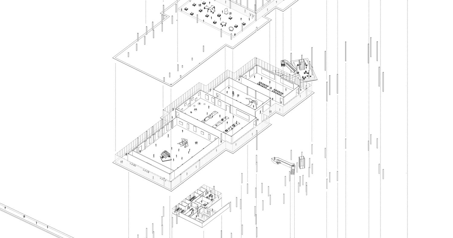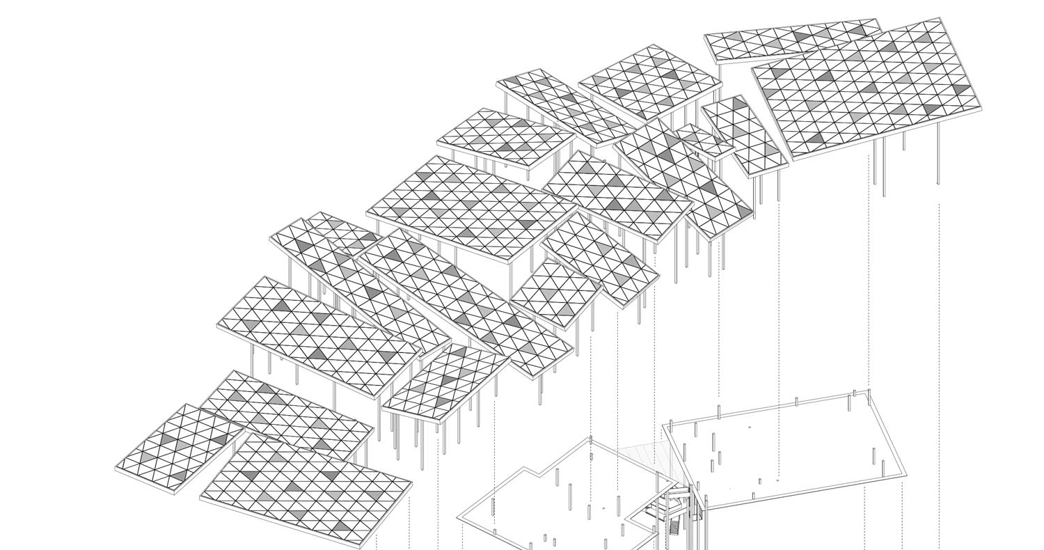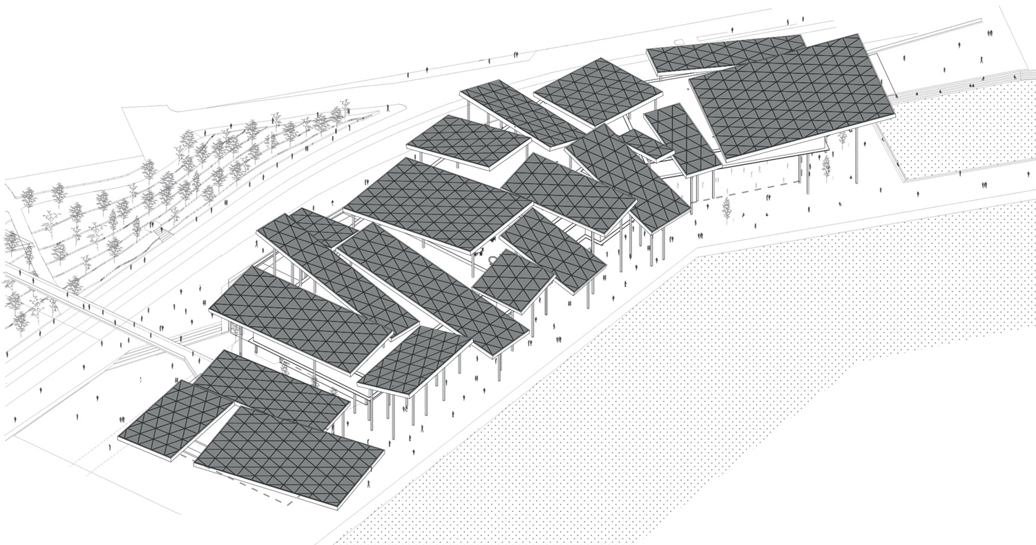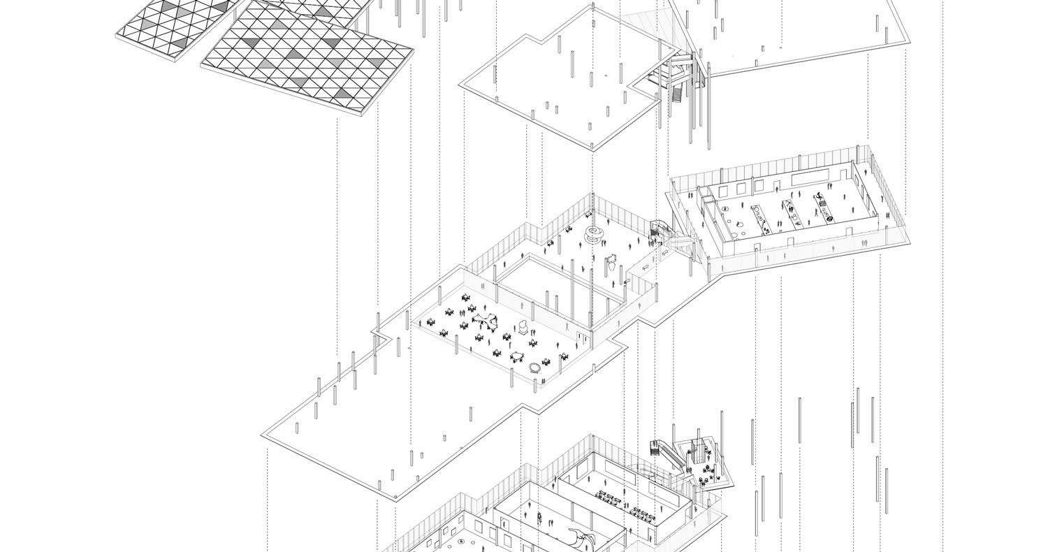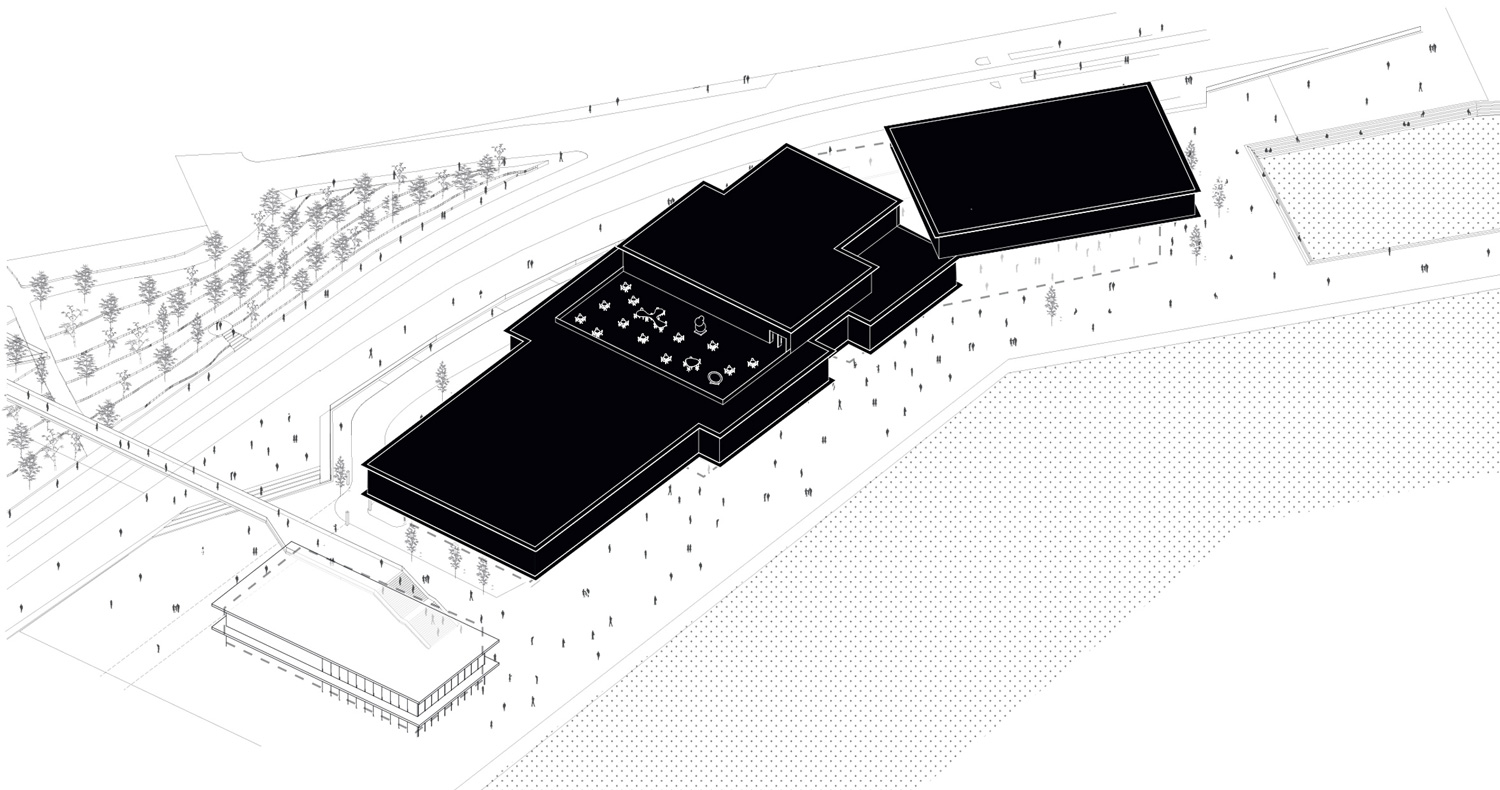 The main concept of our proposition for the New Guggenheim Museum in Helsinki is a reinterpretation of the different characteristics of the city; the port, the park and the roofs. The project is organized around a metaphoric duality between an autonomous semi-public area on the ground floor (the parc) and, on the upper levels, an introspection space dedicated to exhibitions and terrasses (the house). These characteristics offer a wealth of interactions and atmospheres for the programs to which they are affiliated. The building is strongly contextual, it shapes the skyline of Helsinki in a roundabout way. Roofs create a building-landscape supported by a series of posts, as hanger. The roofs serves also as a technical element, it acts as a protection regarding the sun and the Finnish climate, it retrieves rainwater and the photovoltaic panels collect solar energy throughout the day with their multiple orientations. The roofs down to the park, keeping the perspective to the city. It lead the eye towards the horizon while reflecting the sky. This system of roofs is also used for the new terminal and can become a common «vocabulary» for the future development of the port. The use of wood as the main structure promotes the use of local material and helps to create a unique atmosphere. This element supports the establishment of a threshold around the building. Multiple wooden posts that support the building create interactions on the ground floor where people could walk in the same manner as in the woods in a flexible and falsely randomly.