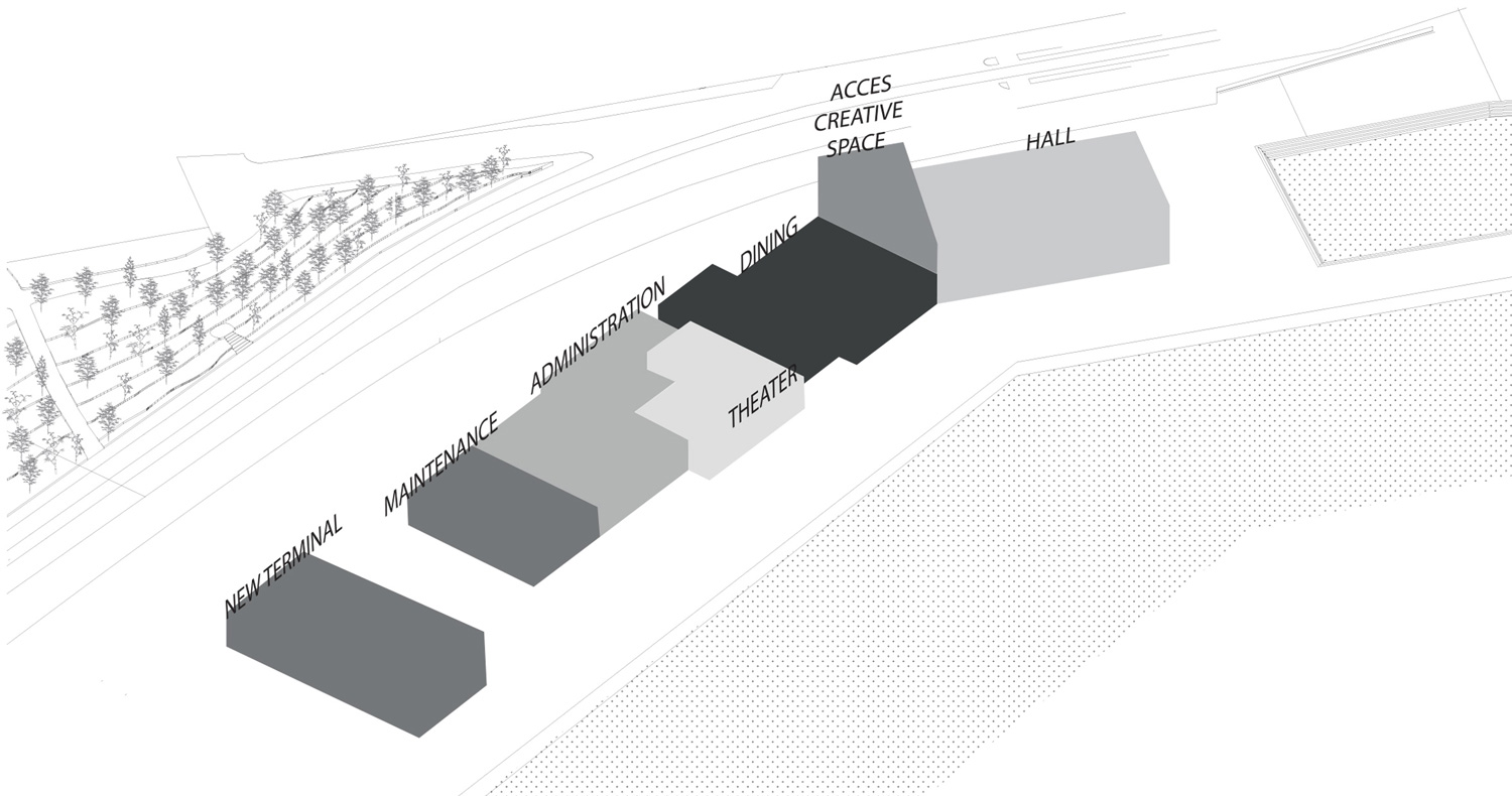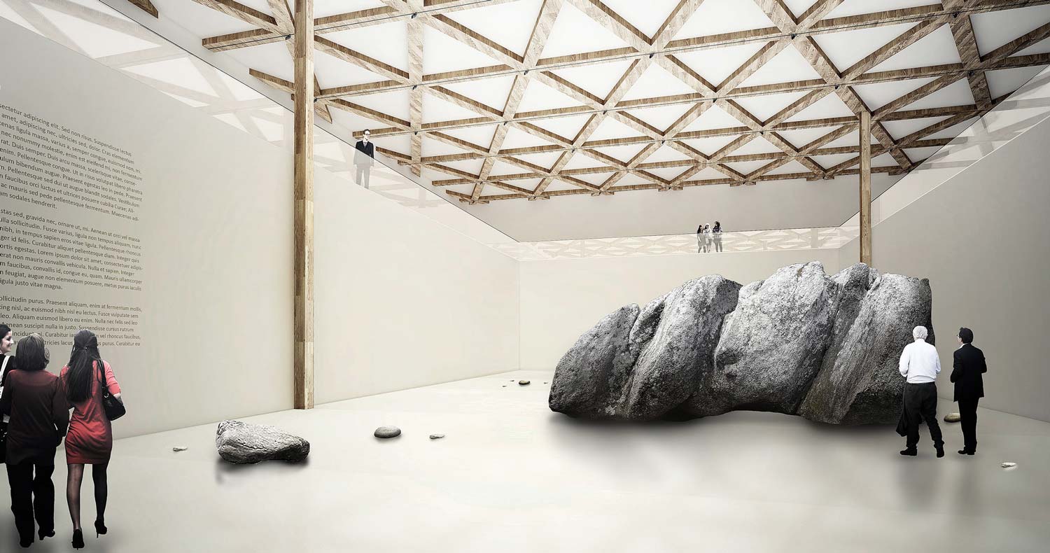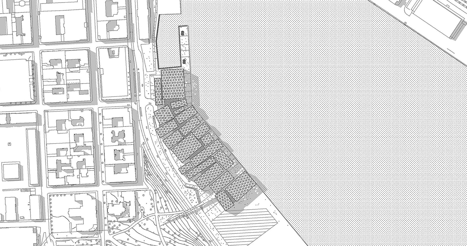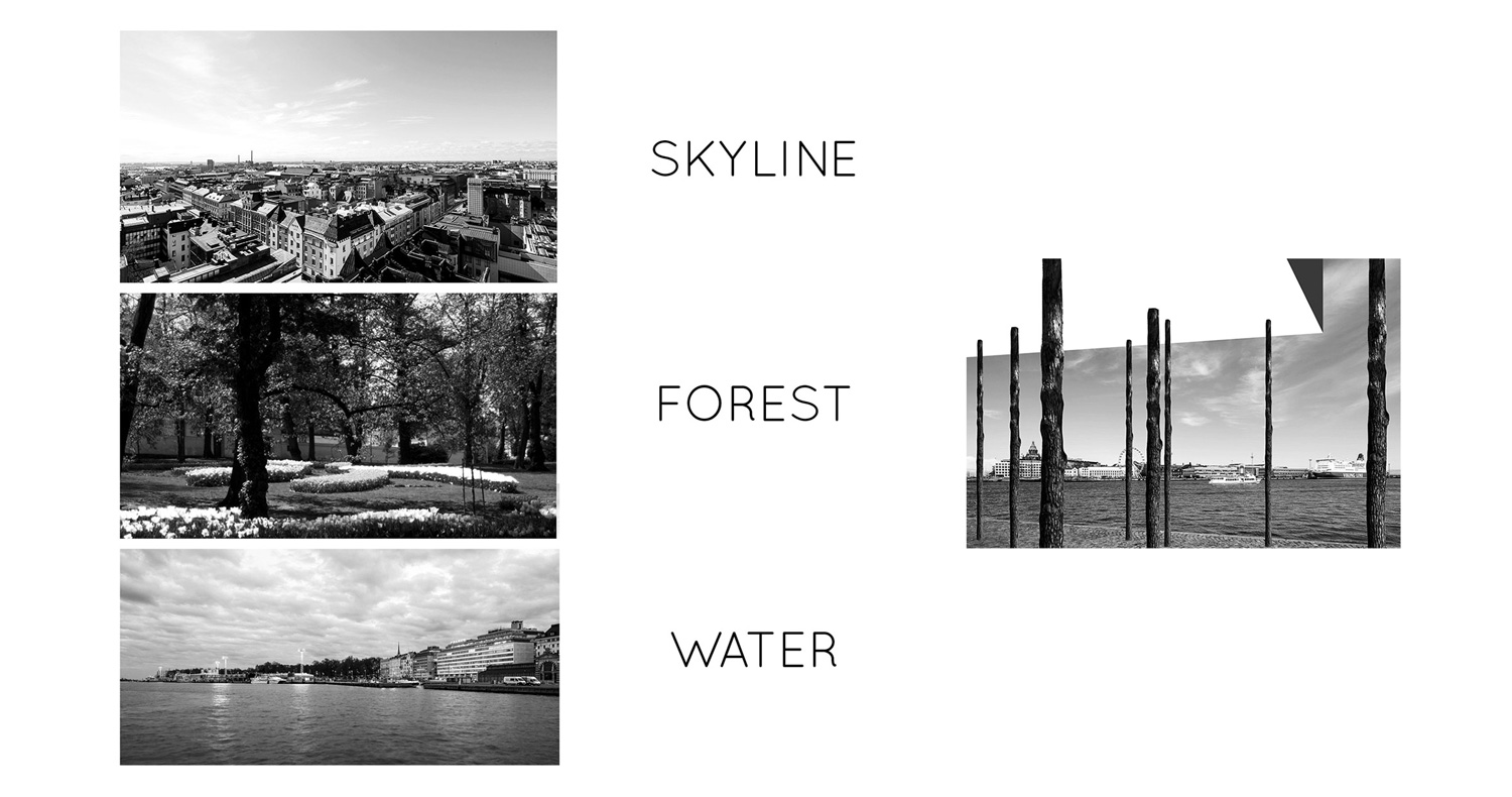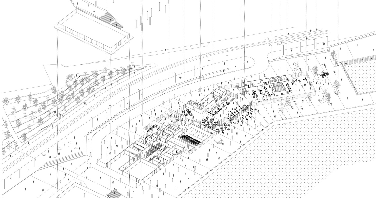 The main concept of our proposition for the New Guggenheim Museum in Helsinki is a reinterpretation of the different characteristics of the city; the port, the park and the roofs. The project is organized around a metaphoric duality between an autonomous semi-public area on the ground floor (the parc) and, on the upper levels, an introspection space dedicated to exhibitions and terrasses (the house). These characteristics offer a wealth of interactions and atmospheres for the programs to which they are affiliated. The building is strongly contextual, it shapes the skyline of Helsinki in a roundabout way. Roofs create a building-landscape supported by a series of posts, as hanger. The roofs serves also as a technical element, it acts as a protection regarding the sun and the Finnish climate, it retrieves rainwater and the photovoltaic panels collect solar energy throughout the day with their multiple orientations. The roofs down to the park, keeping the perspective to the city. It lead the eye towards the horizon while reflecting the sky. This system of roofs is also used for the new terminal and can become a common «vocabulary» for the future development of the port. The use of wood as the main structure promotes the use of local material and helps to create a unique atmosphere. This element supports the establishment of a threshold around the building. Multiple wooden posts that support the building create interactions on the ground floor where people could walk in the same manner as in the woods in a flexible and falsely randomly.