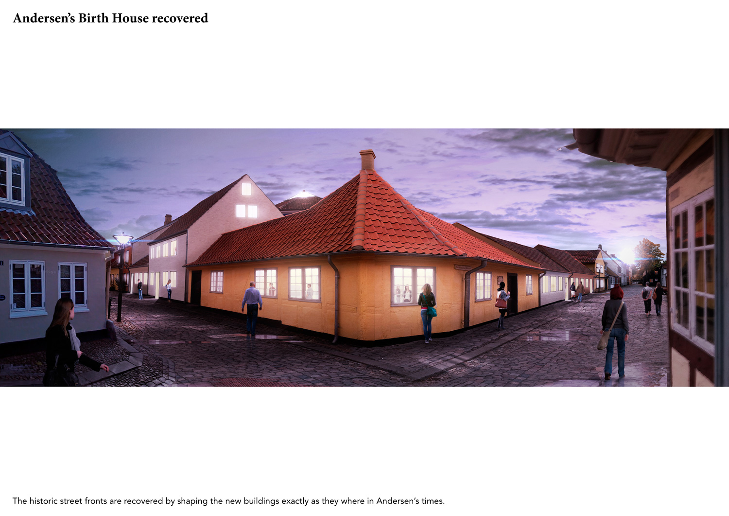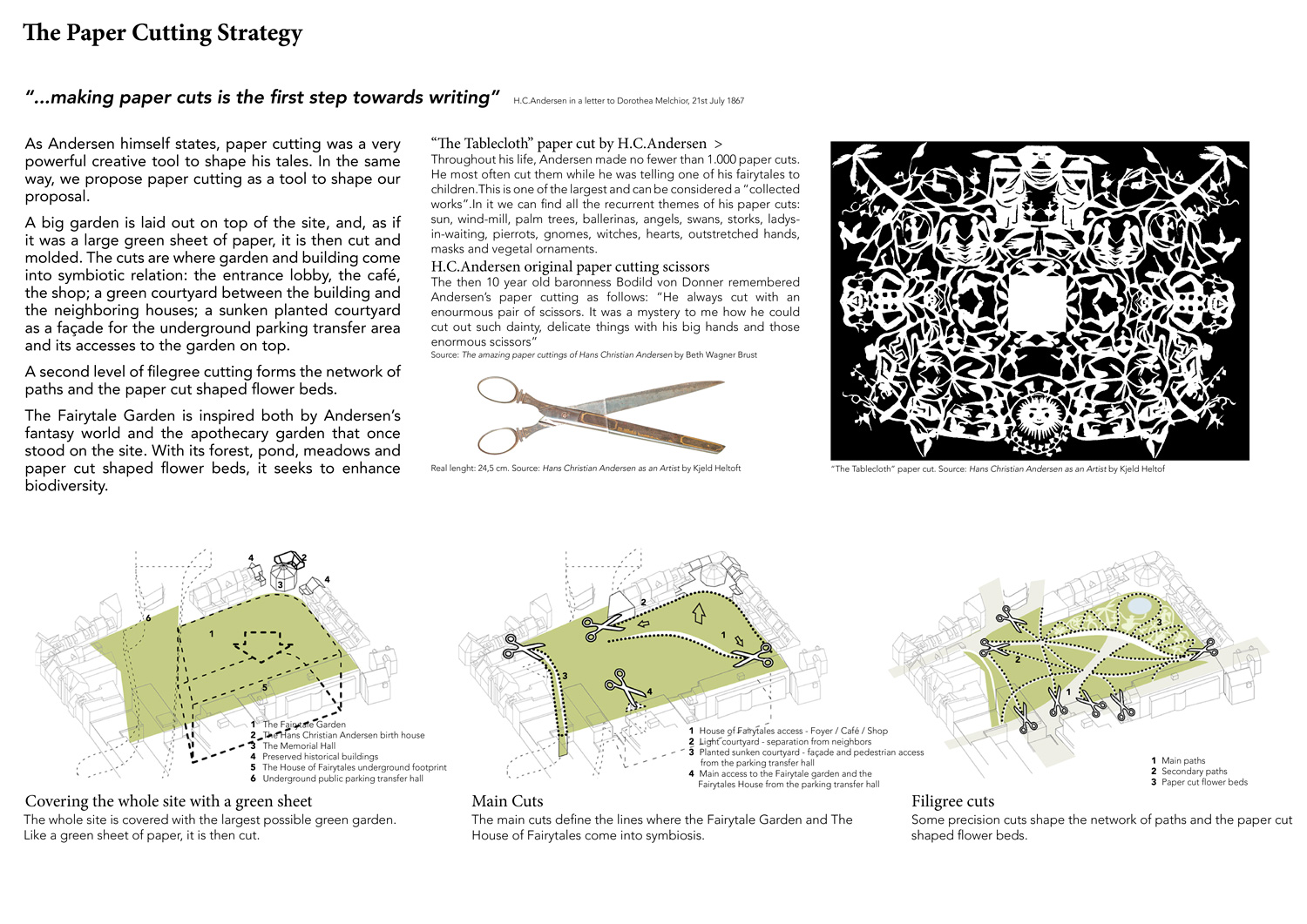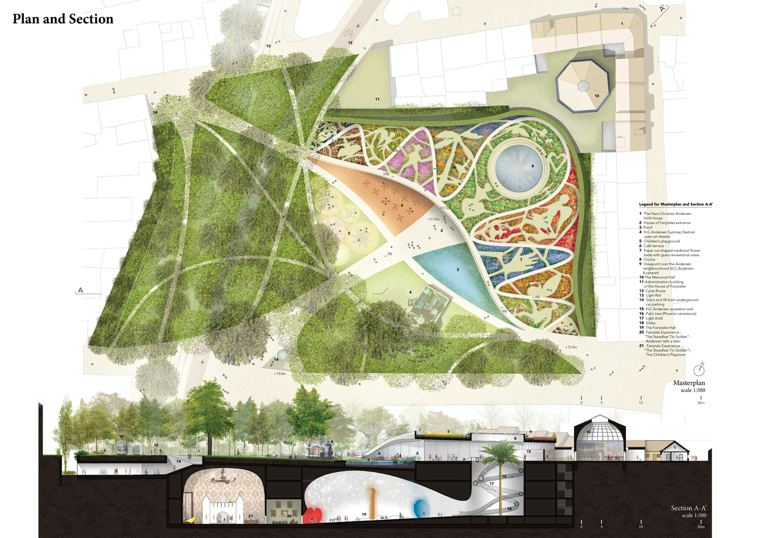 Hans Christian Andersen was born in a charming neighborhood in the historic center of Odense, where his birth house is still preserved. Attached to it, and partly surrounding a public garden, a museum and a cultural center currently present the author’s life and work. The challenging assignment calls for a substantial enlargement of both garden and museum, but on the very same location they now occupy. Our answer is to cover the whole site with a large Fairytale Garden, and to put under it most of the new museum: the House of Fairytales.