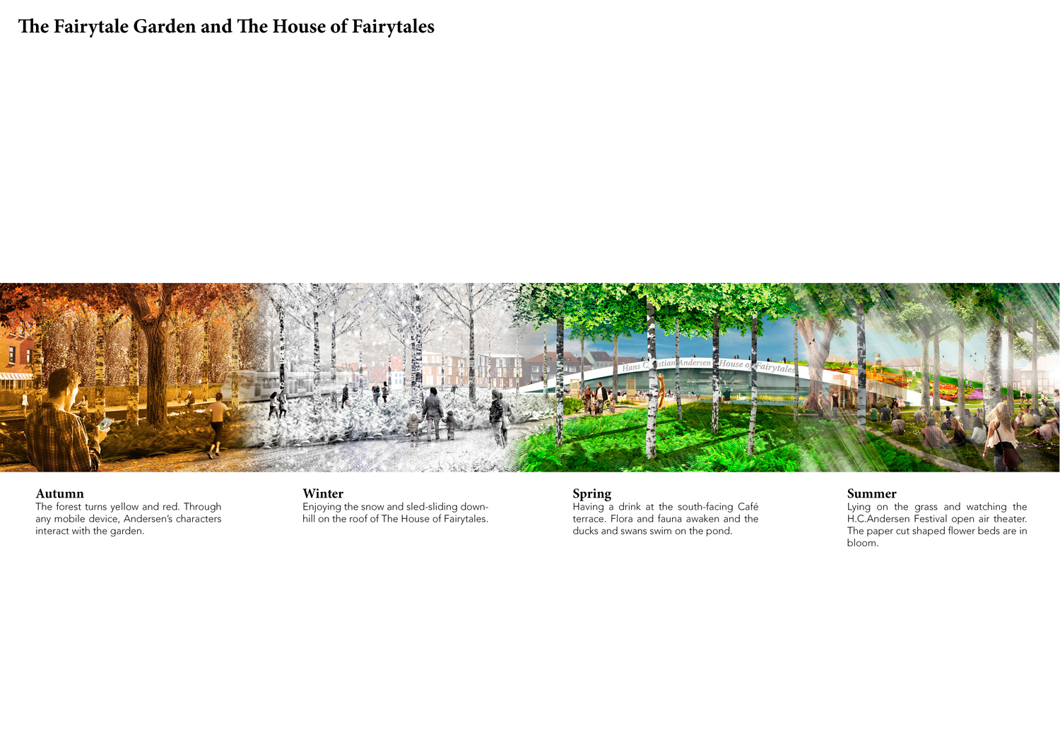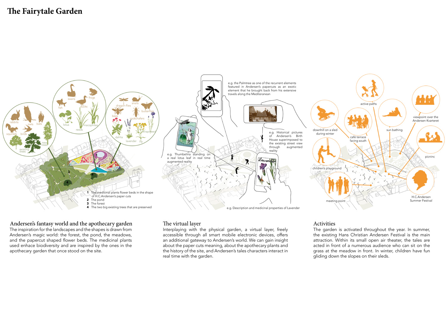 The Fairytale Garden, with its forest, its pond, and its paper cut shaped flower beds, is inspired by Andersen’s fantasy world, while the medicinal plants and trees to be used are drawn from the memory of the site, where an old apothecary garden once stood. Interplaying with the physical garden, a virtual layer, accessible through all smart mobile electronic devices, offers an additional gateway to Andersen’s imaginary world, and to the history and present of the site.