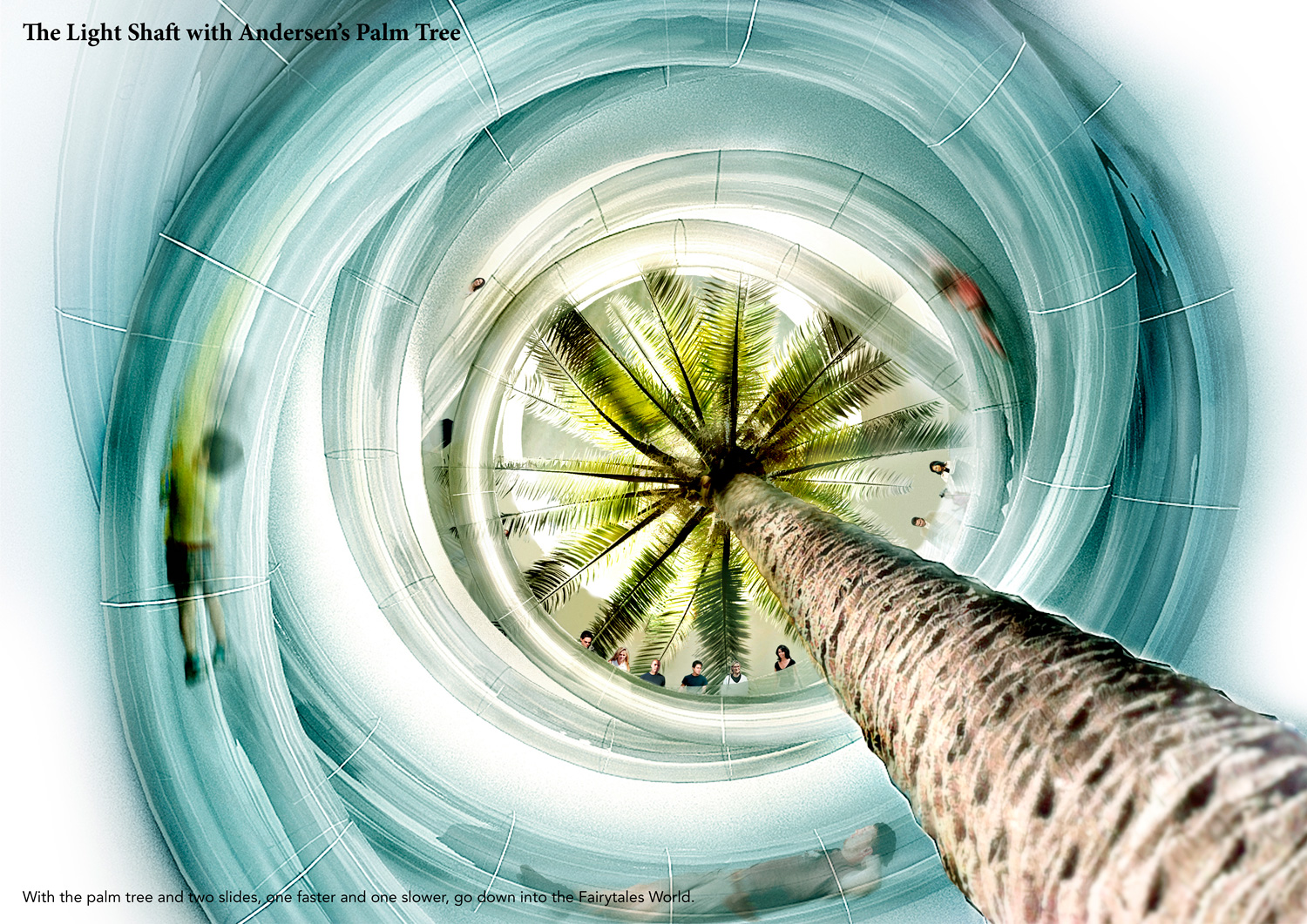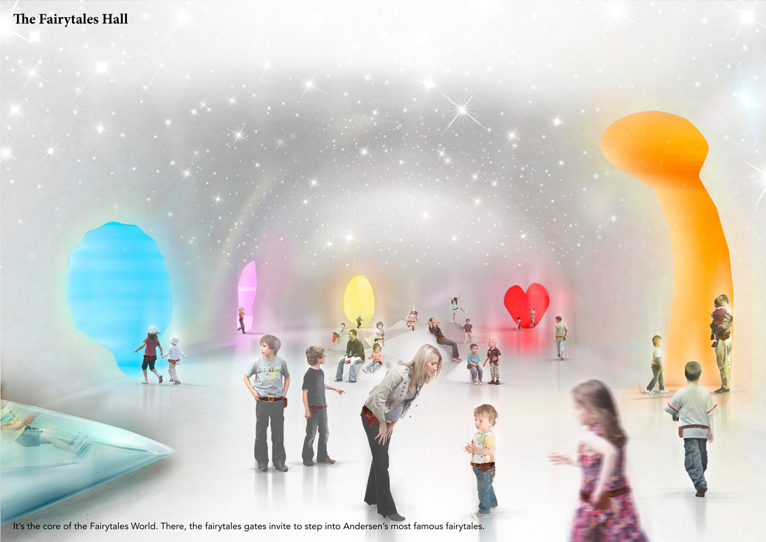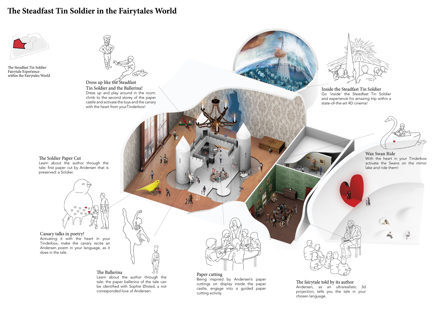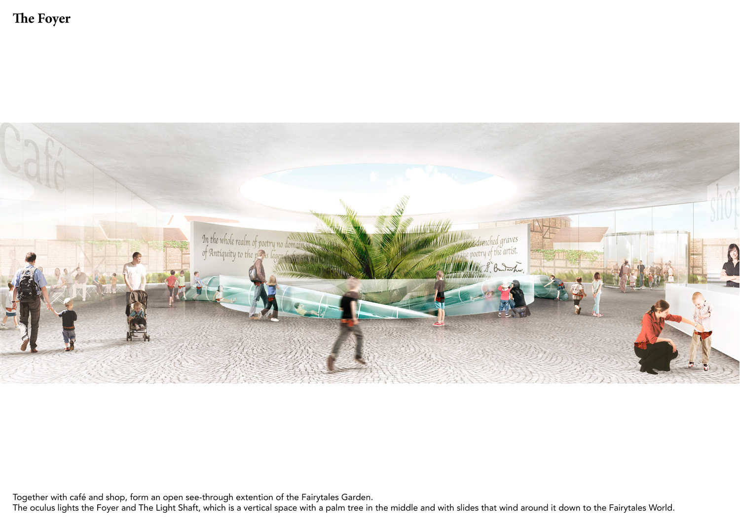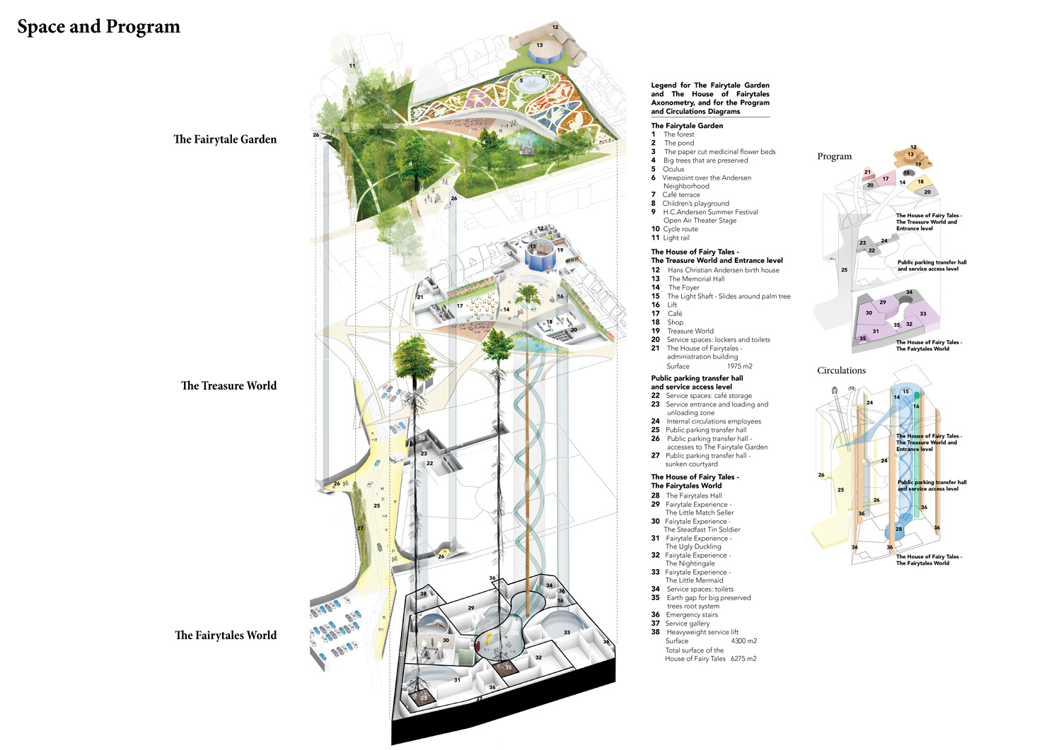 Paper cutting, one of Andersen’s favorite art forms, provides the strategy through which the House of Fairytales and the Fairytale Garden are brought into a symbiotic relation: the ground is cut and molded, and, through the biggest cut, the garden lets us in. Here we find the entrance lobby, the café, and the shop, all broadly opening towards the garden. From the lobby, through a huge light shaft, we take a slide down into the Fairytales World. There, through an immersive, state-of-the-art and didactic experience, we discover the most famous fairytales. From them, we learn about their author’s life and work. A big lift takes us up then, and we enter the Treasure World, where we can get to know Andersen closer, visit his birth house and interactively discover the jewels of his literature and artworks. Together, the House of Fairytales and the Fairytale Garden take us on a wonderful journey into the fantastic and profound universe of Hans Christian Andersen’s imagination.
