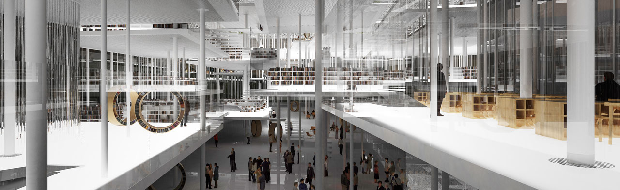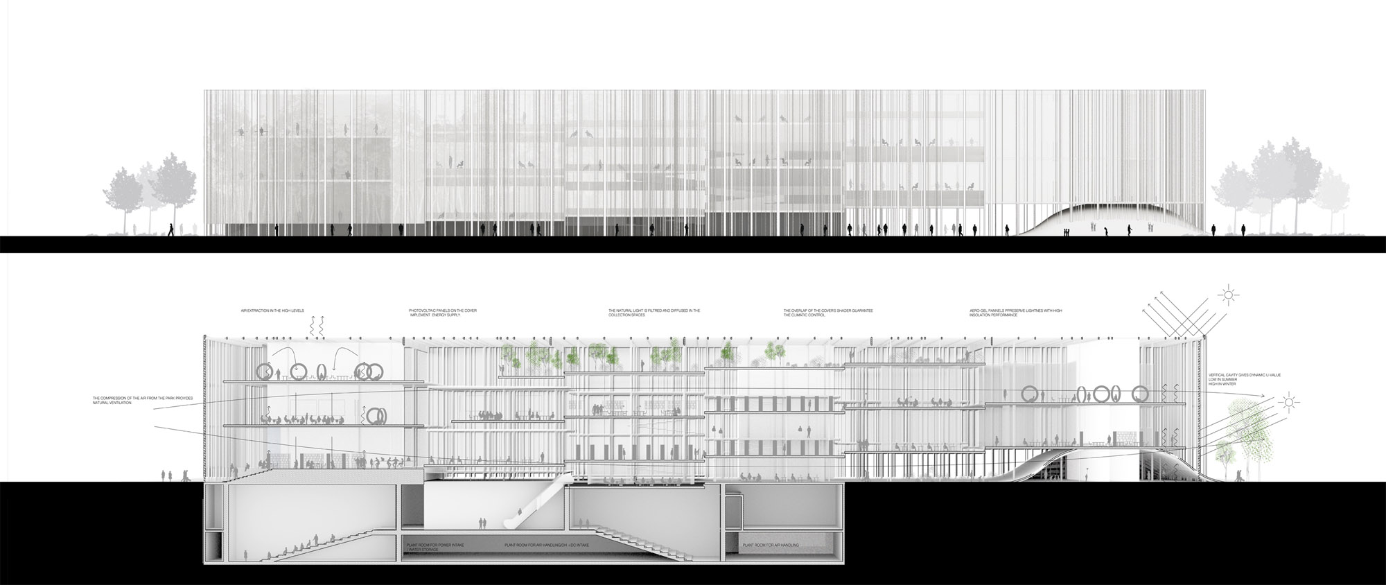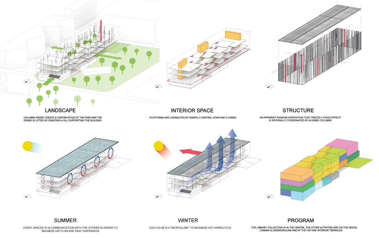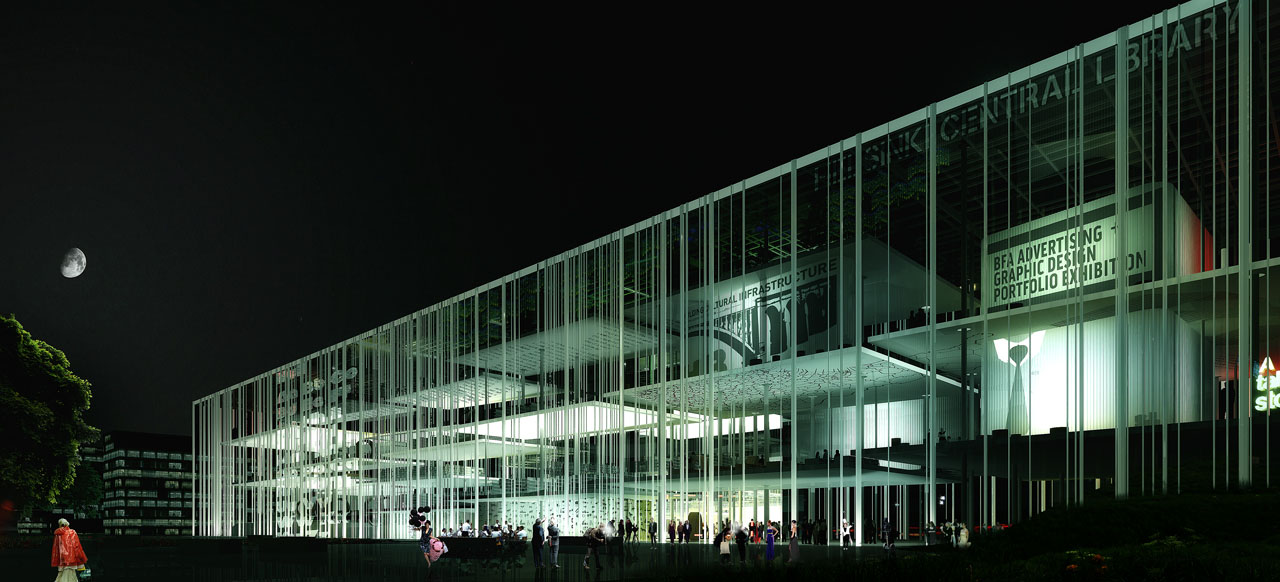 The Helsinki library will be situated in the new green heart of Helsinki. The project will occupy 4.500m² of the site. The intention is to replace the existing green that we subtract to the park in an indoor environment perfectly controlled. We decided to conceive the building as a tree forest enclosed in a climatic box, in which the structure represents the causality of the wood. The natural organization of the pillars is then reproduced on the glazed envelope that creates the link between nature and architecture, between the light and the shadows. The transparent facade gives to the building a high visual permeability, allowing the exterior user to follow the internal events and the client to have a strong link with the nature and the sourrounding. The envelope lifts, allowing the life in and through it and reducing the urban limit between Takatoolo park and Alvar Aallon Katu street.