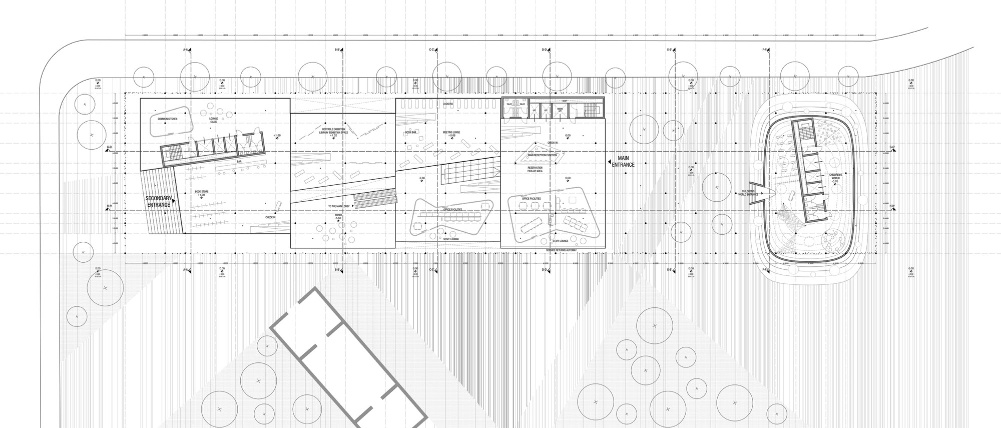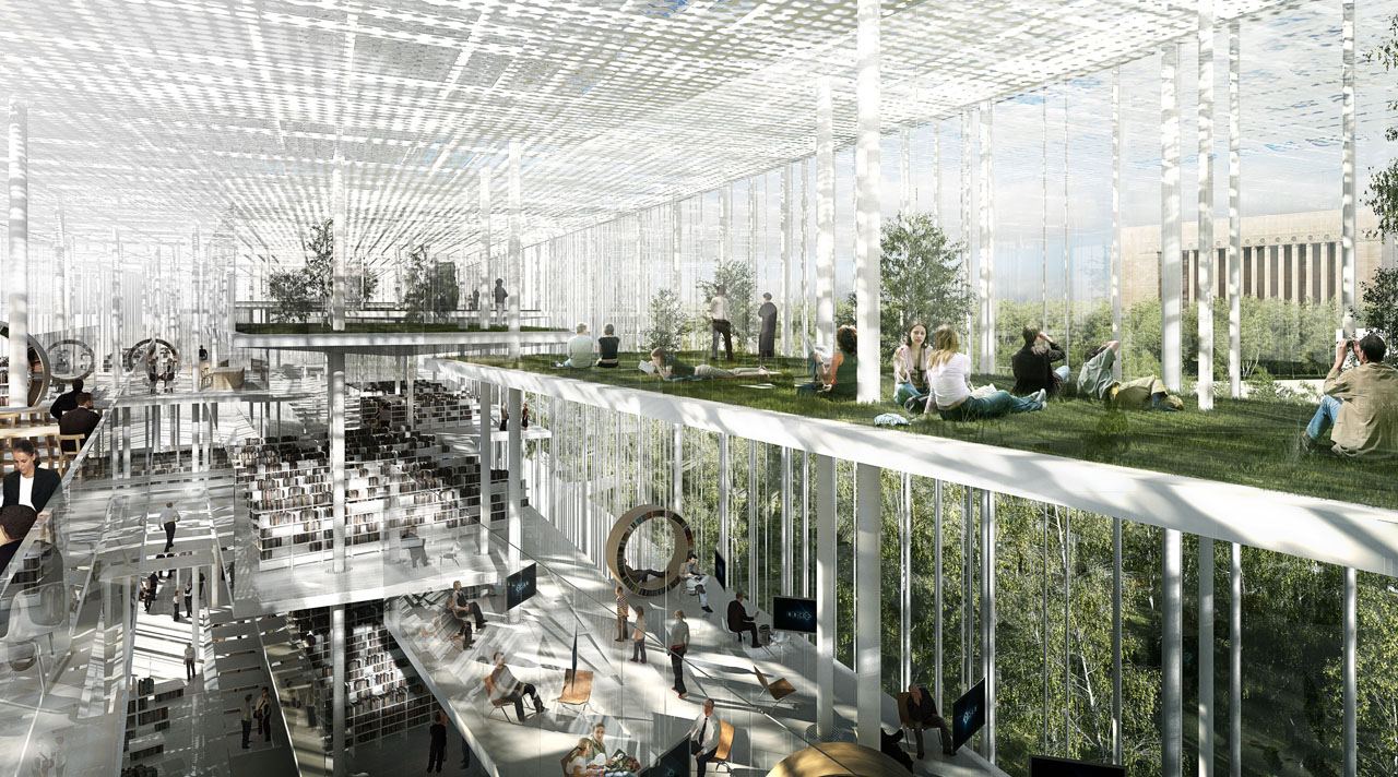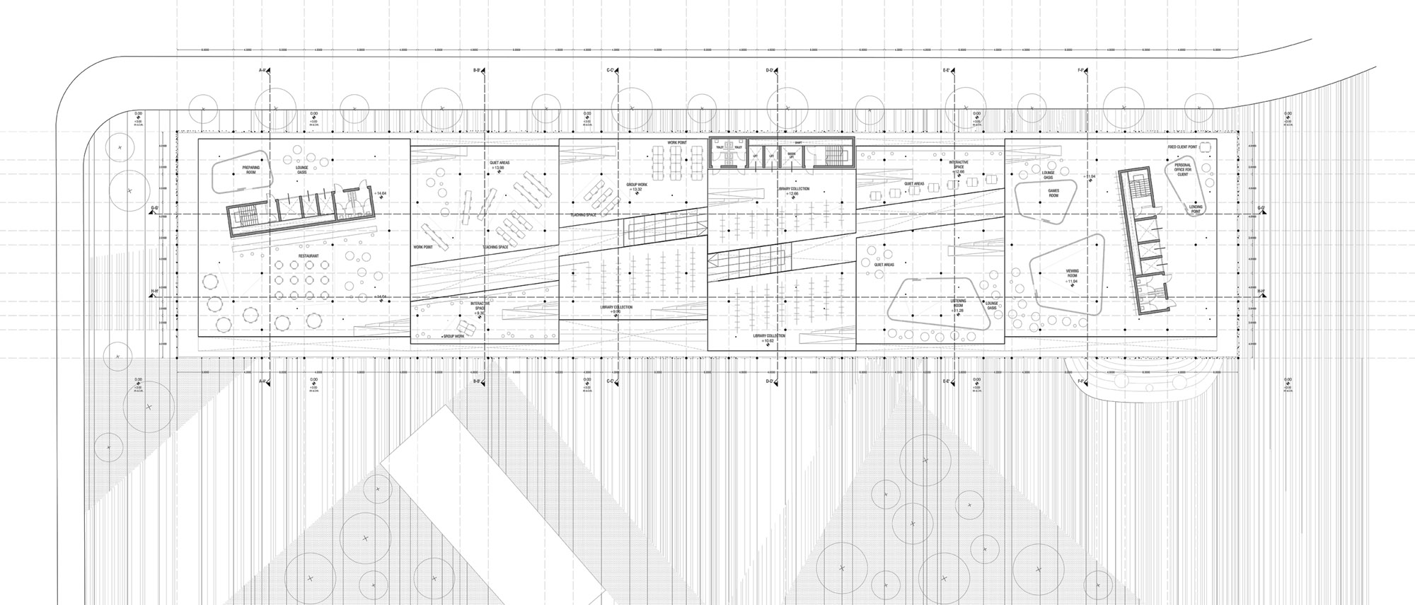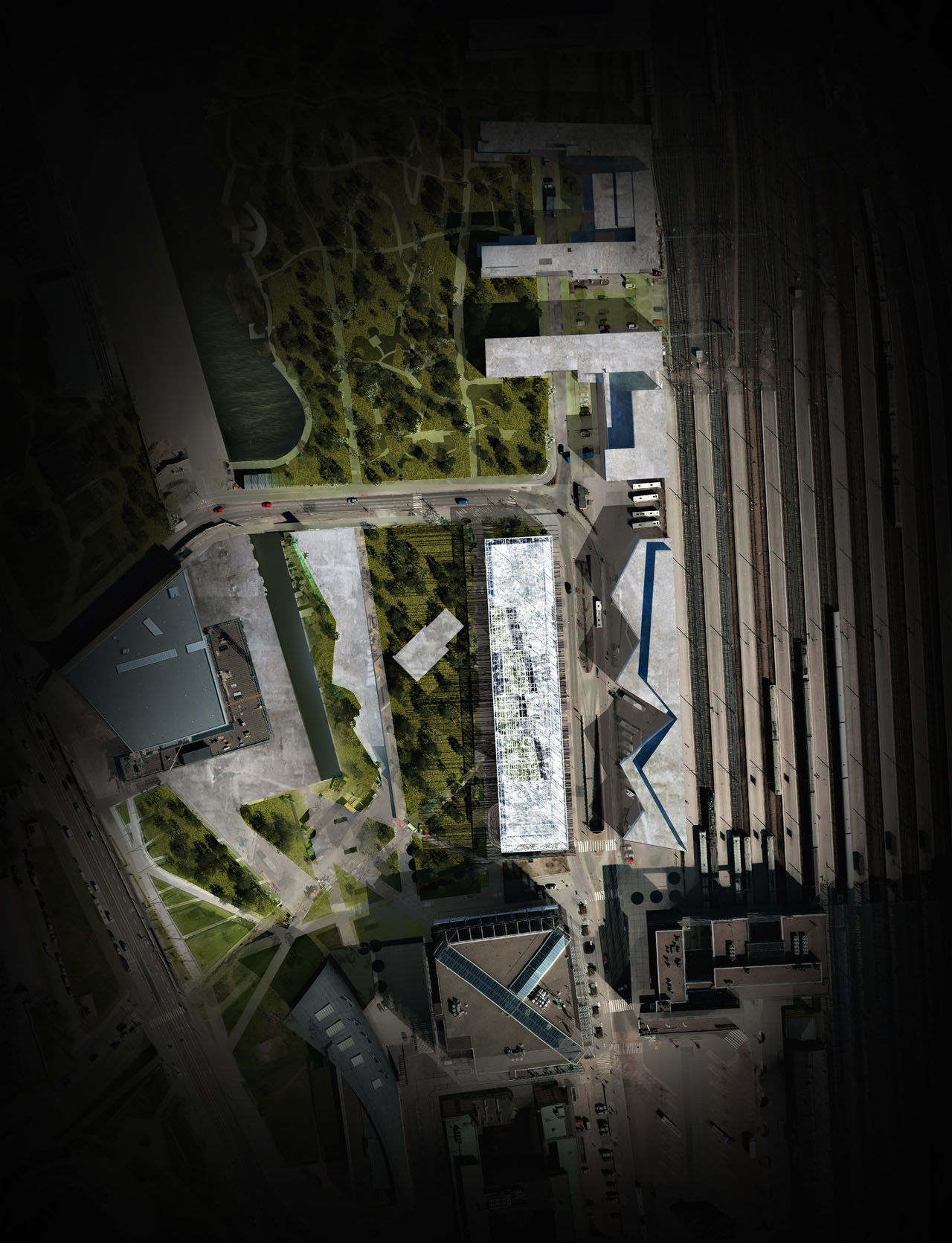 The Helsinki library will be situated in the new green heart of Helsinki. The project will occupy 4.500m² of the site. The intention is to replace the existing green that we subtract to the park in an indoor environment perfectly controlled. We decided to conceive the building as a tree forest enclosed in a climatic box, in which the structure represents the causality of the wood. The natural organization of the pillars is then reproduced on the glazed envelope that creates the link between nature and architecture, between the light and the shadows. The transparent facade gives to the building a high visual permeability, allowing the exterior user to follow the internal events and the client to have a strong link with the nature and the sourrounding. The envelope lifts, allowing the life in and through it and reducing the urban limit between Takatoolo park and Alvar Aallon Katu street.