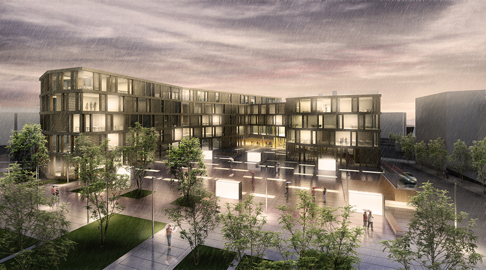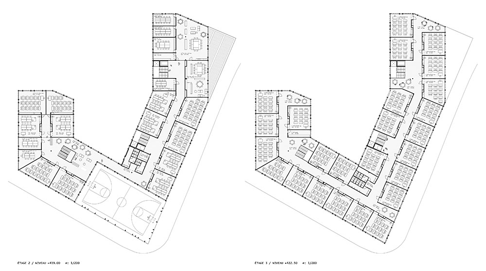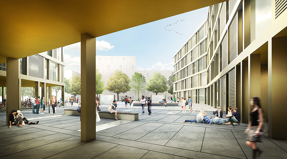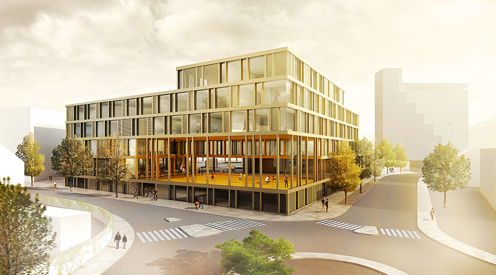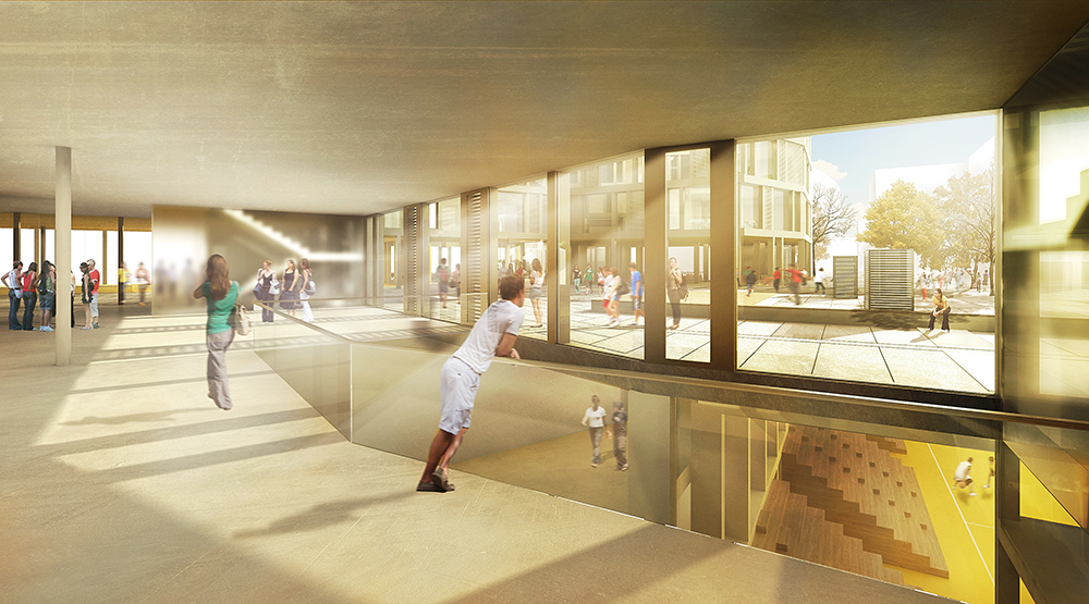 ☉ High School Renens is a fourth prize proposal by 2+2 architecture designed in 2012. It is located in Renens Switzerland in an urban setting. Its scale is large with a surface of 15.000 sqm. Play-Time collaborated as visualizer. Concepts such as u shape broken volume void and plaza are explored.