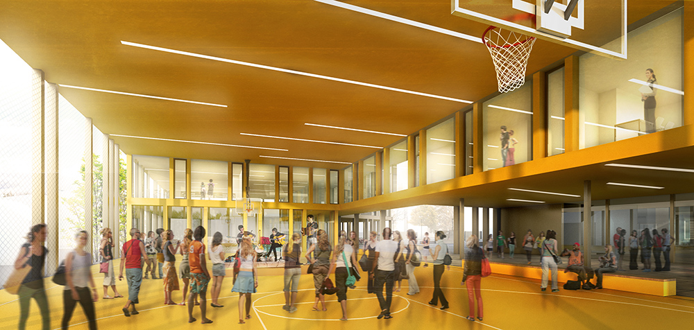 La rue piétonne comme axe principal du quartier devient un espace social à l’échelle de la ville. L’importance structurante de cet espace est renforcée par le dessin de la zone publique de ce projet du CEOL. La place du quartier est un espace public urbain à l’échelle du quartier. Il s’agit ici d’un espace minéral pour accueillir les événements des voisins du quartier. Cette place du gymnase se montre ouverte mais une certaine intimité est offerte par le bâtiment, qui fonctionne comme un portique avec l’entrée couverte. L’espace public situé dans le bâtiment est par contre dédié exclusivement aux élèves. Cette place sportive est l’espace le plus représentatif du bâtiment, avec la salle couverte et l’espace d’entrée. Cet espace de grande dimension, orienté au sud, placé parmi les zones publics de la cafétéria et du hall-bibliothèque offre un espace polyvalent destiné aux utilisations complémentaires : expositions, fêtes, concerts, cinéma, etc.