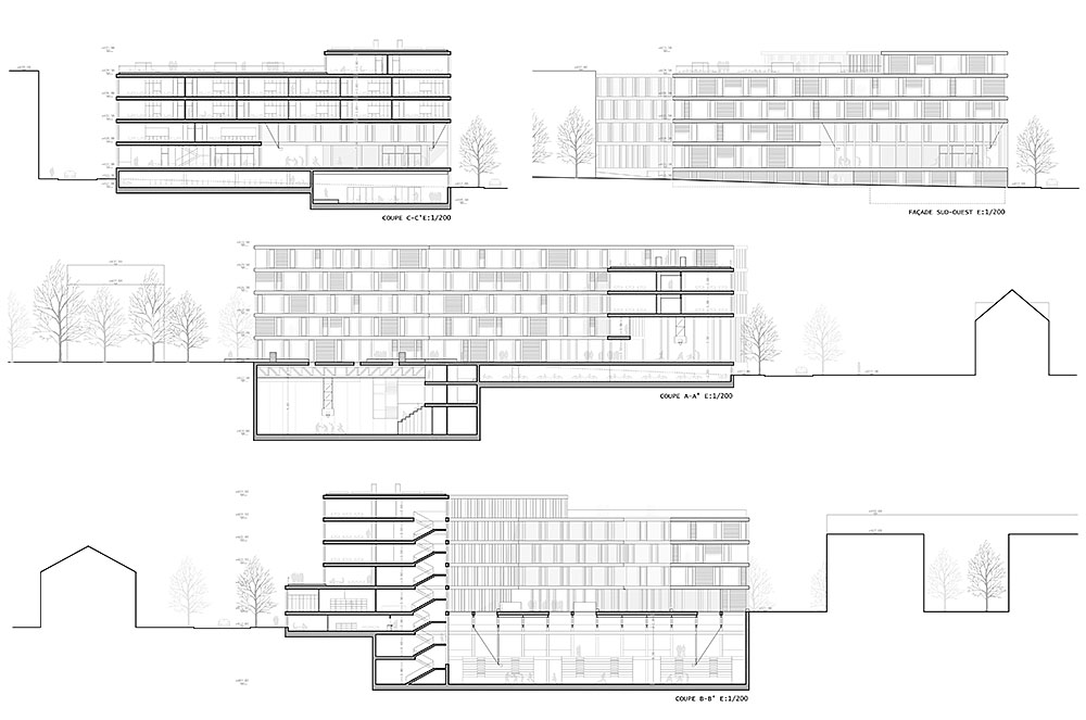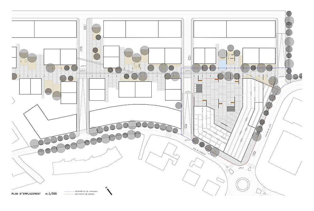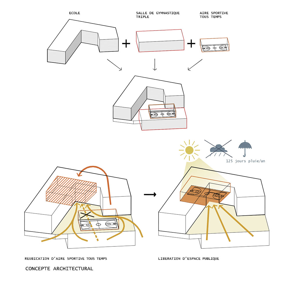 C’est également un plus pour les activités extérieures, Renens ayant une moyenne de 125 jours pluie/an. La forme et la position du bâtiment invoque la volonté de faire partie activement de la vie publique du quartier. Le volume bâti est groupé sur le côté Est de la parcelle (Rez + 4) et évite trop de hauteur du côté Ouest (Rez + 3) afin d’augmenter l’ensoleillement de la place. Le but de ce projet est aussi de créer une invitation pour les utilisateurs à prendre le temps, attendre, se reposer, passer en vitesse… La forme du bâtiment évoque des bras ouverts qui poussent notre curiosité à entrer et à le découvrir. Arbres et végétation sont placés tout le long de la façade Sud, Rue de Simplon & Avenue du Silo pour détacher le bâtiment du terrain et protéger du trafic visuellement / acoustiquement les espaces de la cafétéria et de la bibliothèque du rez. Cette ligne végétale est interrompue par la présence du grand espace de la salle sportive tout temps et de l’aula semi-enterrée, pour mieux souligner cet angle urbain singulier.