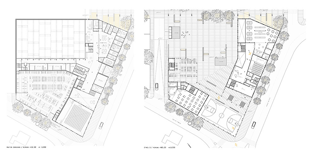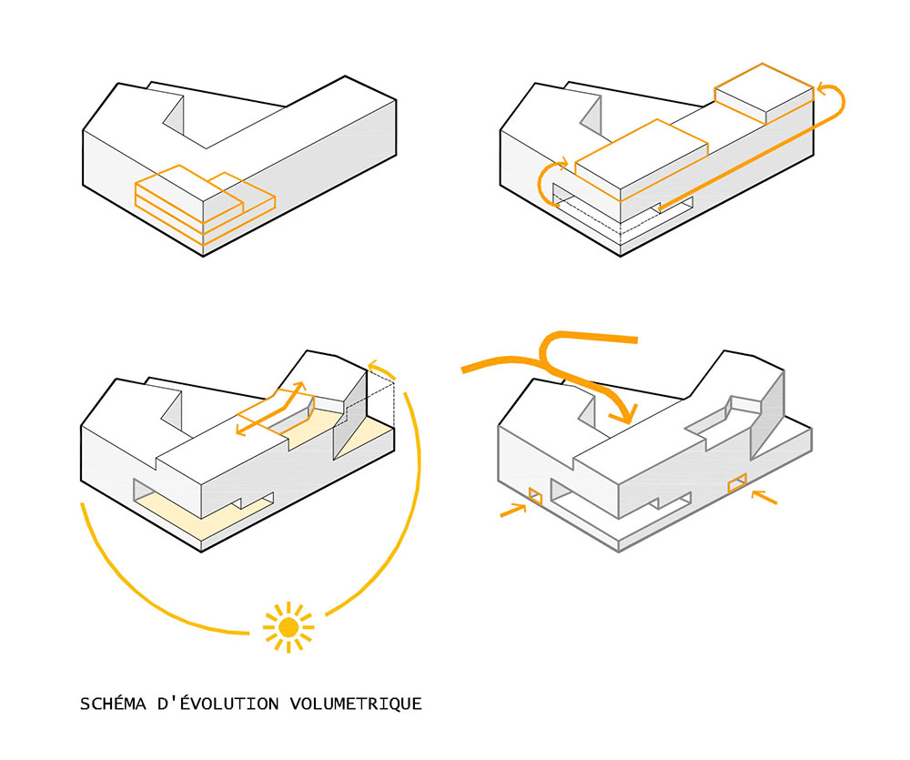 Ce projet CEOL se présente comme la pièce finale du nouveau quartier. Il est la « tête » visible du nouveau aménagement de la zone avec l’intention de respecter la continuité volumétrique (PLQ – front bâti) mais avec l’introduction d’une rupture très claire sur l’angle sud de la parcelle (giratoire), en correspondance avec la salle sportive tout temps. Cet angle du bâtiment, telle la proue d’un bateau, devient la partie la plus significative du projet, et prend, sur le plan formel, un rôle principal : Le vide proposé rend l’angle plus subtil et son esthétique avec un espace de couleur jaune contraste avec le reste de la façade, il est aussi fonctionnel puisque il abrite la salle sportive extérieure couverte à utilisation polyvalente. Cette césure volumétrique créée par ce nouvel espace (entrée principale du bâtiment) ouvre une diagonale à travers la parcelle du nord au sud. Ce choix permet de relier une série d’espaces publiques : la rue piétonne du quartier, la place publique sur la salle sportive triple au sous-sol, le portique d’entrée au gymnase et la salle sportive couverte. Ceci opère une gradation des espaces public-privé: