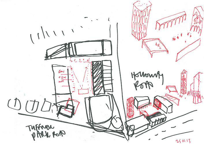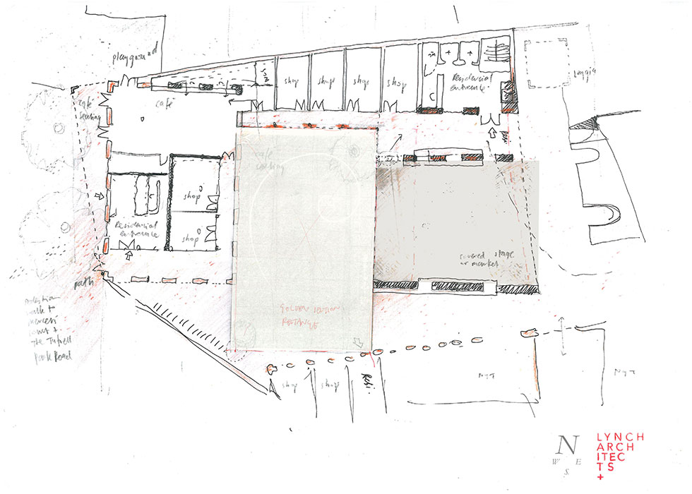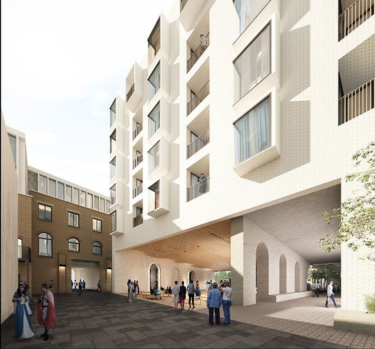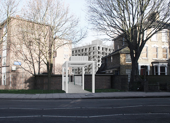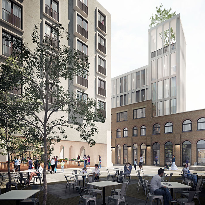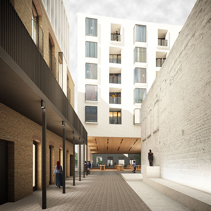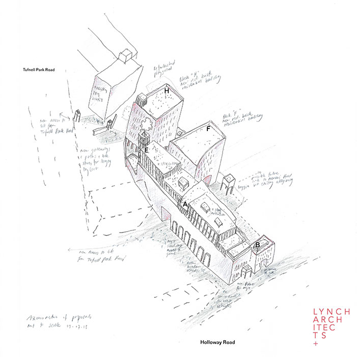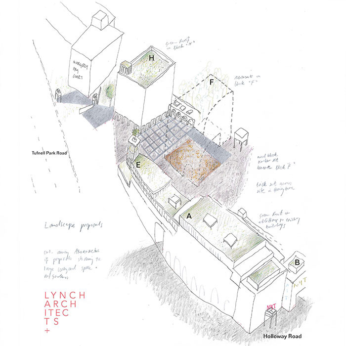 Our project connects the Tufnell Park Road and Holloway Road, via a series of courtyards around which are composed some new and refurbished brick blocks housing flats above, with a series of workshops and small shops at ground floor. The site is the home of the National Youth Theatre. We are providing NYT with new and improved accommodation as well as making their presence on the site more visible and accessible to the public. A number of existing artisanal workshops and studios will be re-housed in new or refurbished accommodation. We see the new buildings as versions of the Victorian Warehouses and Palazzo types that currently exist there, and have tried to find an appropriate architectural character for a deep city block that can mediate between ‘high street’ and the domestic hinterland of the site. Currently the site is occupied by light industrial buildings that are under-used, and it is landlocked and mostly surrounded by tall walls. Our aim is to make the site porous for pedestrians, and in doing so to solve some of the problems of anti-social behaviour that exist in the ill-defined territory around the modernist housing blocks neighbouring the site. We are attempting to heal the rifts in the urban fabric caused by twentieth century planning policy, and to create in its place a mixed neighbourhood capable of supporting daily life and being transformed by theatrical use – a proper city quarter.
