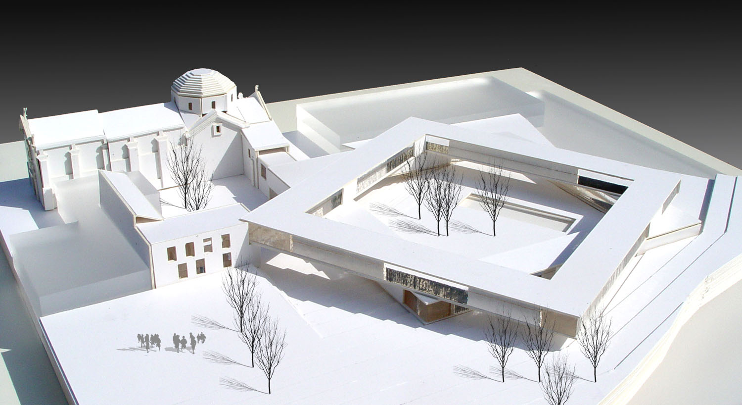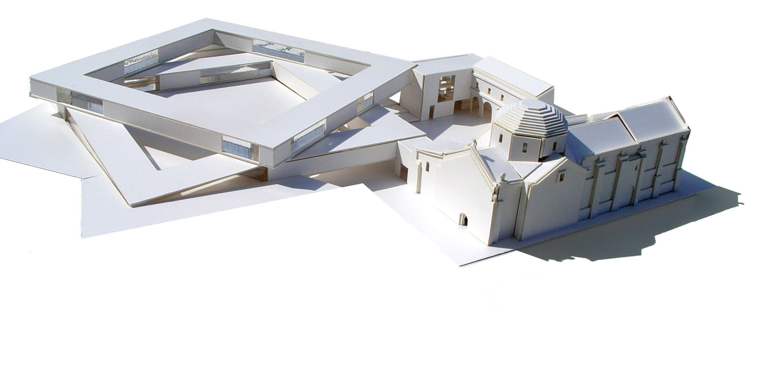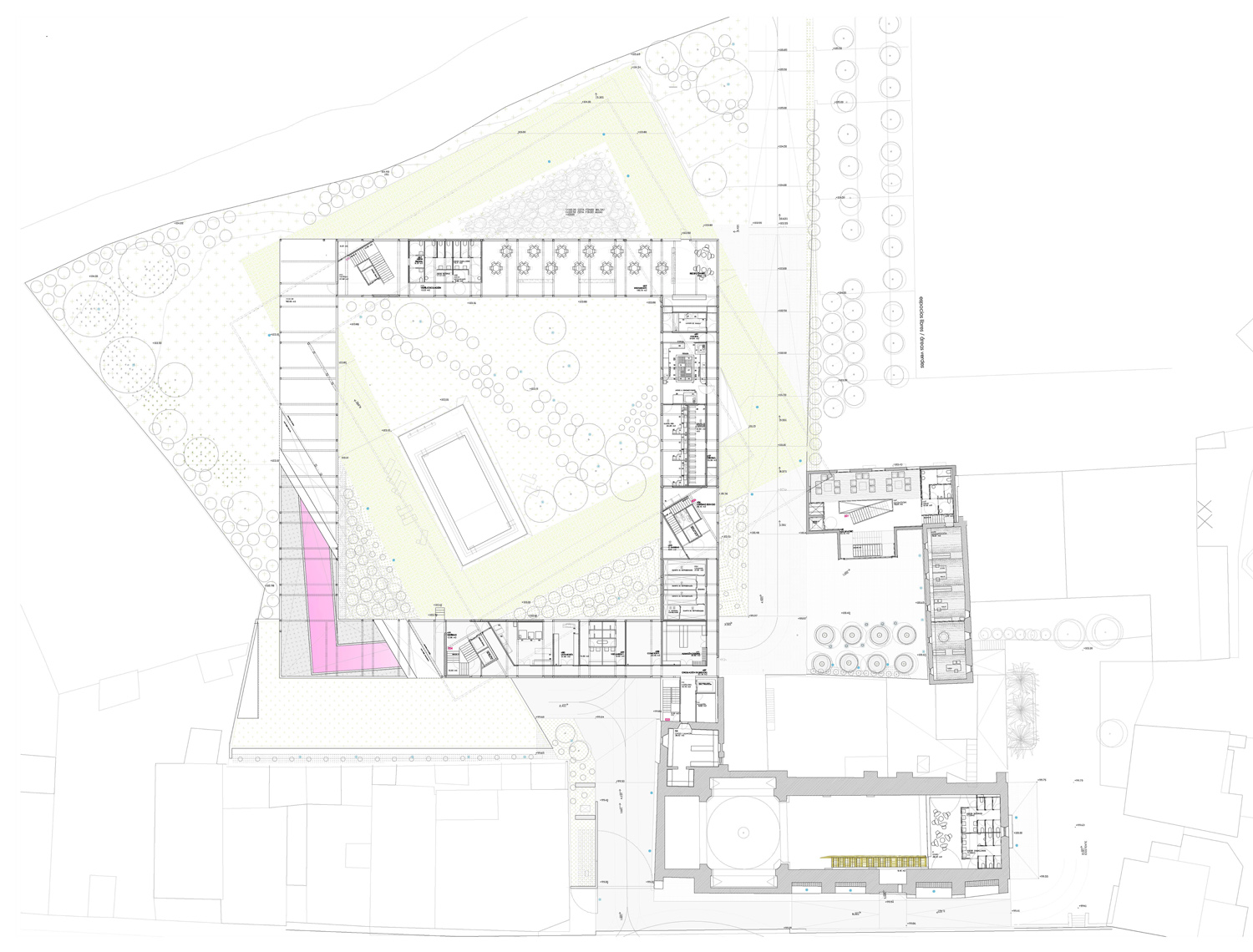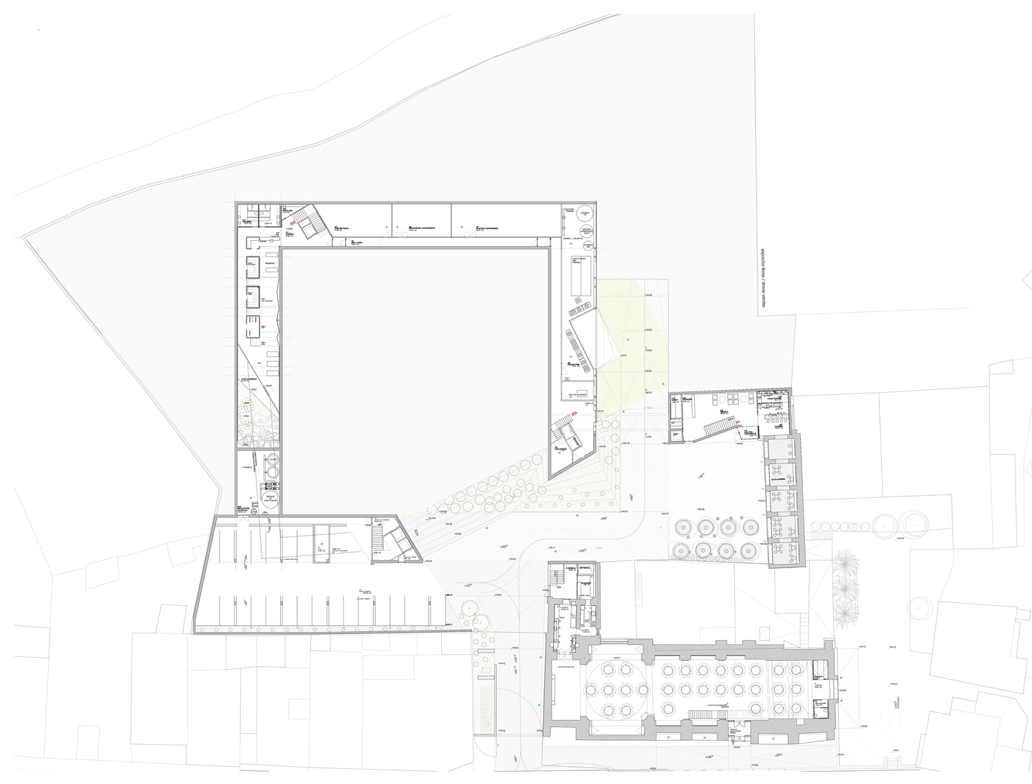Este gesto busca reforzar el espacio tipológico original, resuelve las nuevas relaciones surgidas por la implantación del nuevo programa y con su tratamiento diferenciado permite una lectura inmediata del alcance de la intervención preservando el estrato original del edificio y sus relaciones urbanas. La ampliación en torno al claustro se concibe como un solo elemento con tratamiento homogéneo. Revestimientos continuos hacen resaltar el conjunto transmitiendo calidad y sencillez constructiva. Se busca el contraste intencionadamente, sobre todo en los puntos de superposición como estrategia de preservación.
