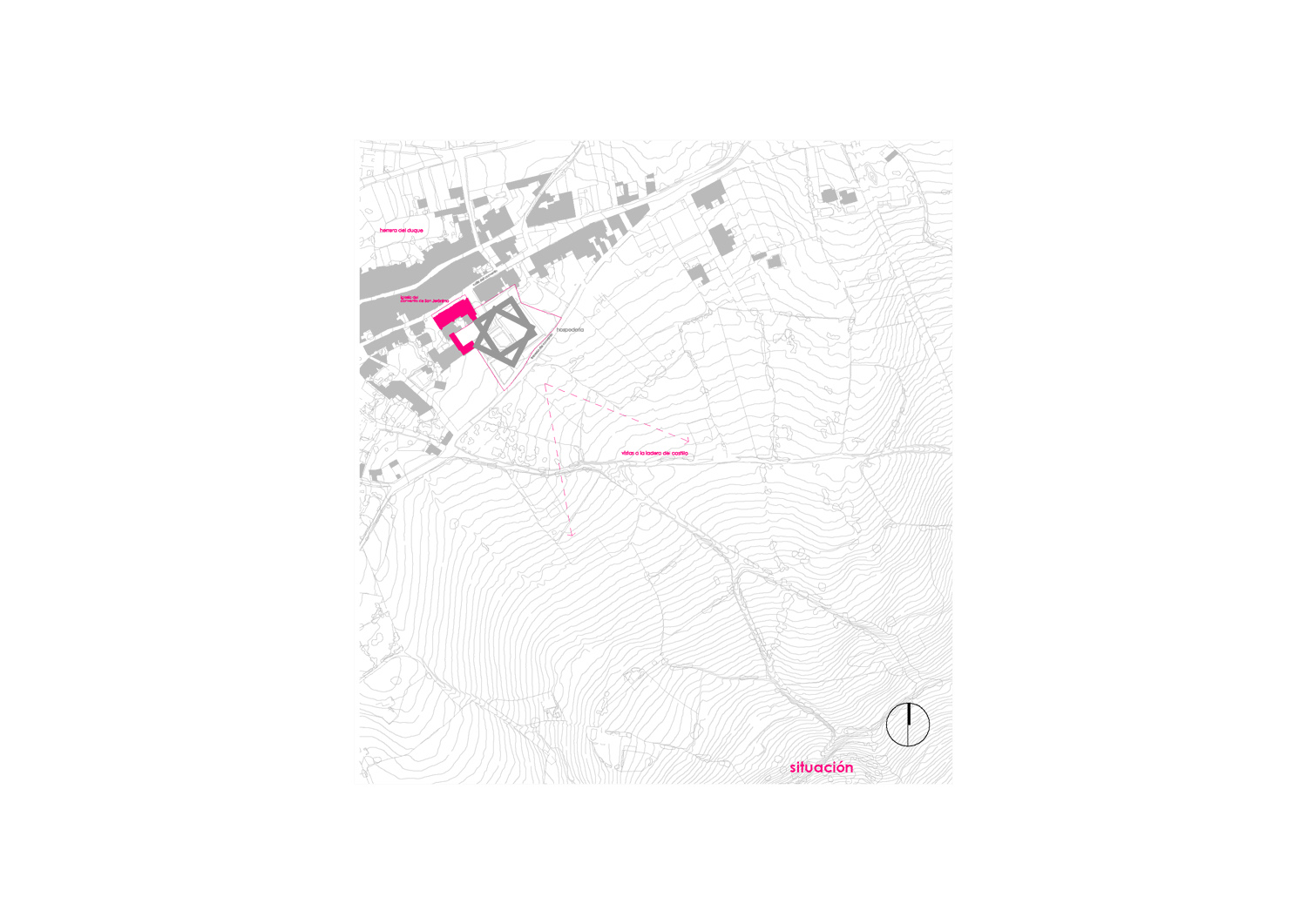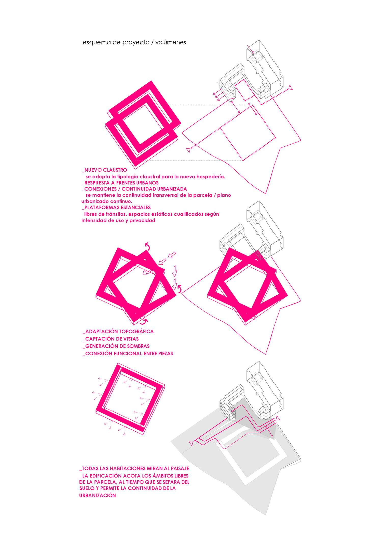 El convento está situado en el extremo sureste de la localidad de Herrera del Duque. El convento, por el transcurso del tiempo y diversos avatares, sobre todo por la desamortización de Mendizábal [1836] año a partir del que el convento deja de estar habitado y pasa de unas manos privadas a otras, ha llegado hasta nuestros días, desdibujado y en un estado de deterioro considerable. La parcela con pendiente ascendente hacia el sur, una diferencia de cotas de 6m aproximadamente entre alineaciones opuestas, tiene vistas hacia las ruinas del castillo que domina Herrera. Proponemos un nuevo claustro de planta cuadrada, de 36×36 m de dimensiones interiores, que alberga el grueso del programa residencial hotelero. De manera que las piezas renacentistas originales quedan libres para acoger los componentes más sociales del programa. La disposición del nuevo claustro respeta libre la plataforma del claustro original (hoy desaparecido). Ésta se conecta transversalmente con la calle y el eje de las traseras del convento, y se convierte en el espacio de bienvenida del hotel, tanto para clientes alojados como para visitas. La Propiedad plantea como condición que desde todas las habitaciones se vea el castillo. Giramos la planta superior. Ordenamos las habitaciones en línea en cada brazo y hacemos gravitar los pasillos de circulación siempre hacia el noroeste, de forma que todas las habitaciones tienen visuales al castillo. El asiento a una cota intermedia de parcela, permite la continuidad del tránsito desde la calle al la plaza interior (claustro original) y acota un jardín central para el disfrute de clientes alojados.