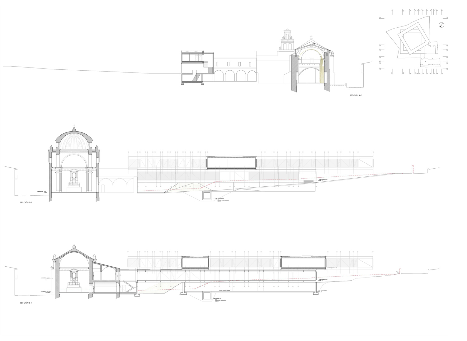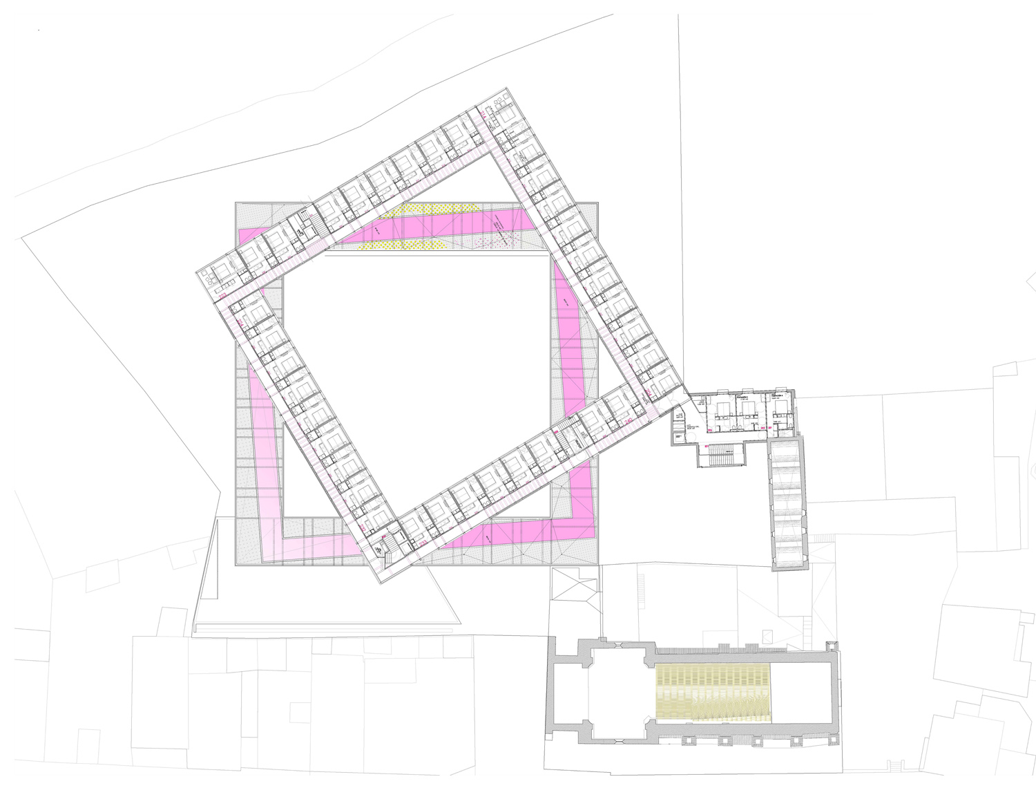 La hospedería integra tres unidades de programa con conexiones oportunas que resuelven los aspectos funcionales. La iglesia alberga el salón de celebraciones, el antiguo convento el acceso principal a la hospedería y sus espacios de apoyo, y la ampliación el programa habitacional y de servicios generales de la hospedería. La ampliación de planta cuadrada con claustro central se adapta a la topografía levemente ascendente, de manera que se separa de la cota inferior de acceso desde la calle del Convento. Este gesto permite cualificar los espacios libres de la parcela al preservar el jardín central de las circulaciones transversales. Se genera un ámbito estático de contemplación interior y un área perimetral que resuelve las conexiones entre los frentes opuestos de la parcela y que permite el tránsito rodado privado y el tránsito peatonal público. El jardín central queda abierto en su ángulo noroeste a la antesala del antiguo convento a través de un plano plegado que resuelve la diferencia de cotas y preserva su intimidad.