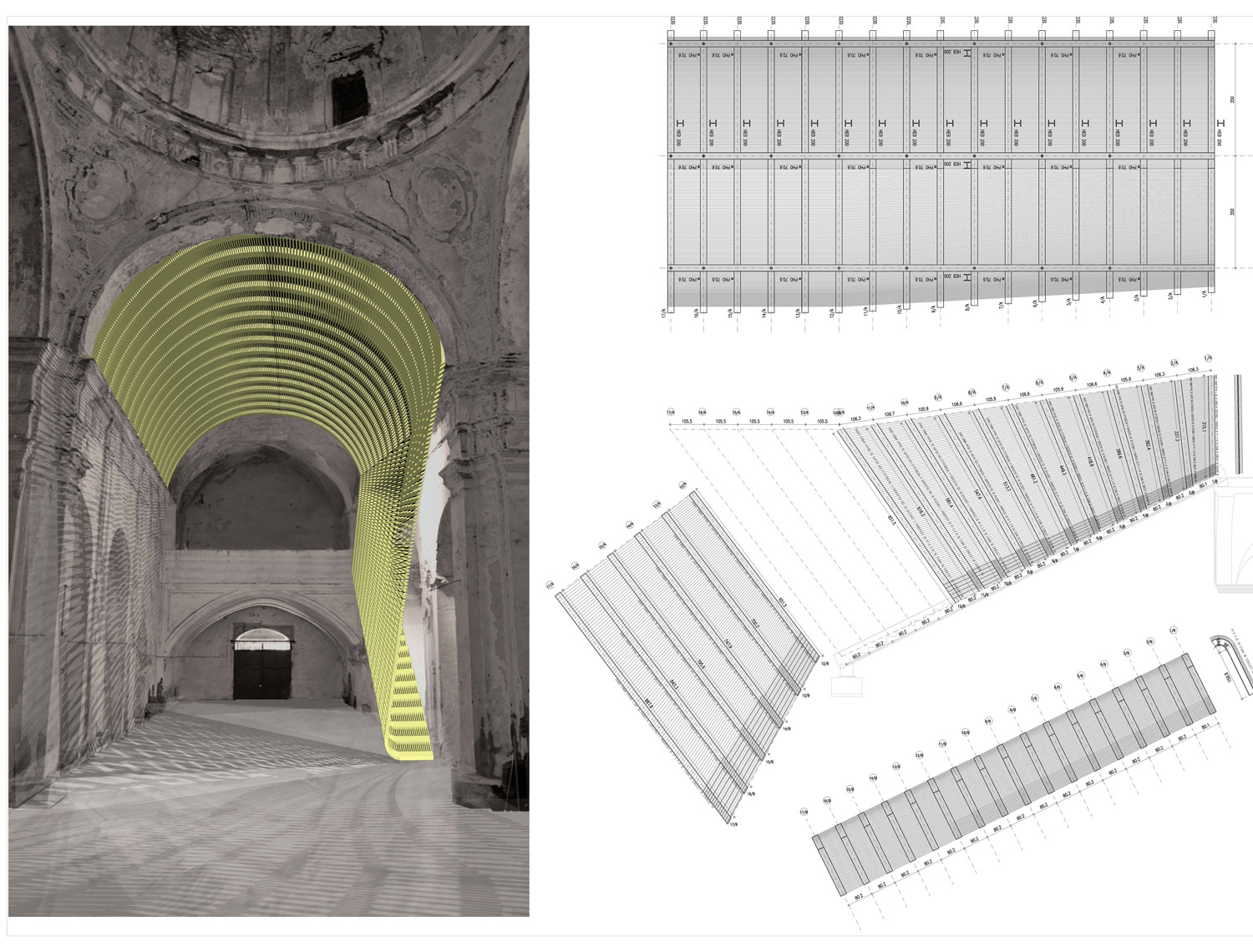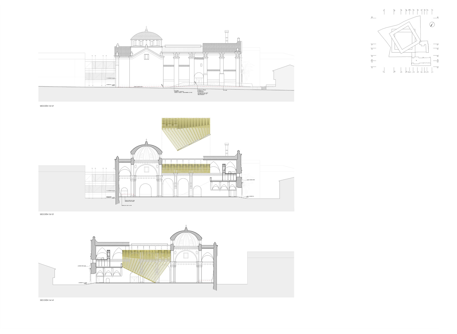 La iglesia, pieza singular de las preexistencias, se destina también al elemento singular del programa que es el salón de celebraciones. La iglesia en el estado actual tiene dos carencias principales: ha perdido la cubrición de medio punto de los tres tramos centrales de nave y ha perdido el acceso al coro. La escalera ha quedado inscrita en las dependencias vivienda particular anexa. Proponemos con la misma estrategia de lenguaje sintético y de contraste solucionar estas dos carencias con un único gesto. Proponemos insertar una celosía colgada que reproduce la geometría de medio punto y se extiende en uno de los laterales hasta recoger la escalera. La celosía filtra la luz que a través del lucernario continuo en la cubierta ilumina toda la nave. Mantiene así su independencia funcional y acceso independiente como pieza singular del conjunto. Se proyectan los elementos de apoyo y servicios bajo el coro, manteniendo la unidad espacial de la nave y el coro alto. Los oficios de cocina se ubican en la sacristía en dos plantas de manera que son directamente accesibles desde el exterior y desde la cocina principal en la planta alta.