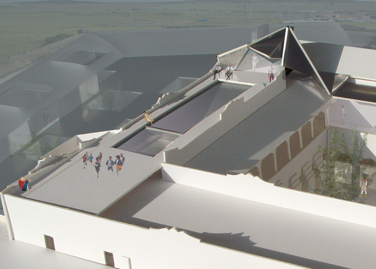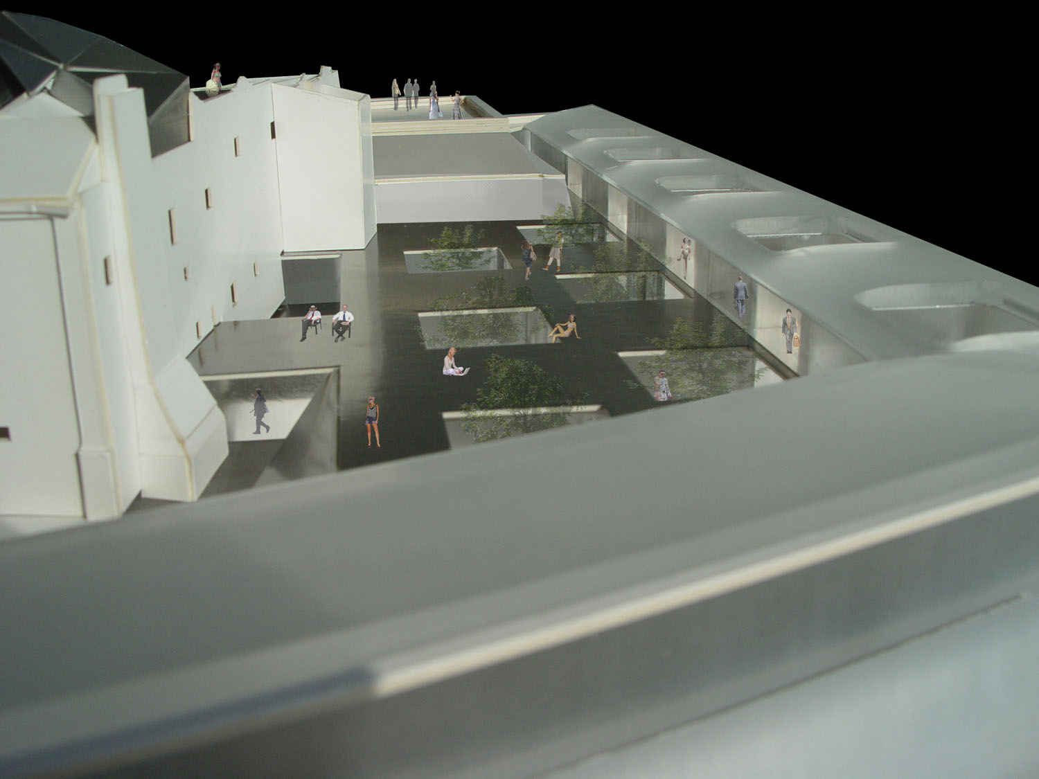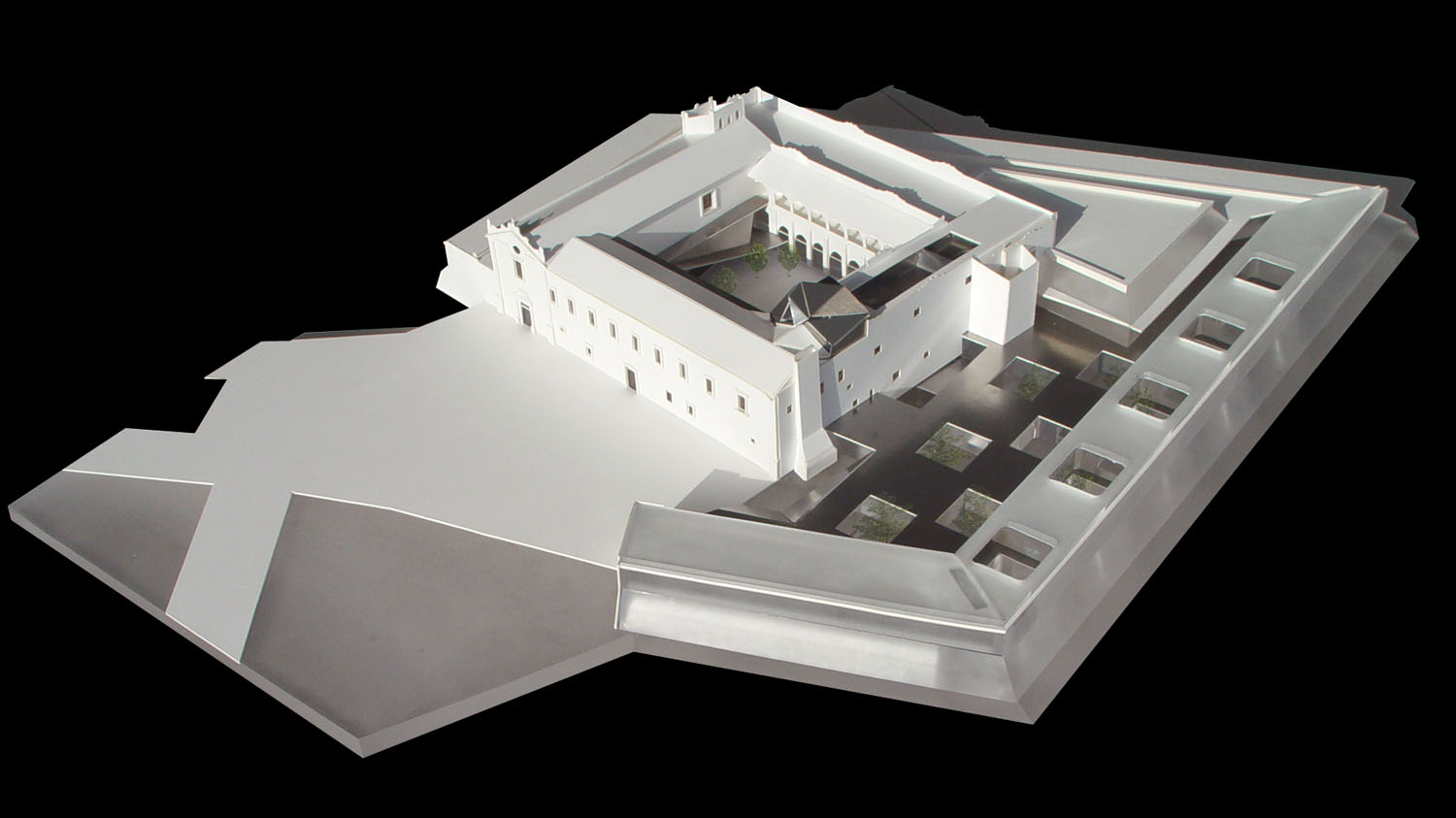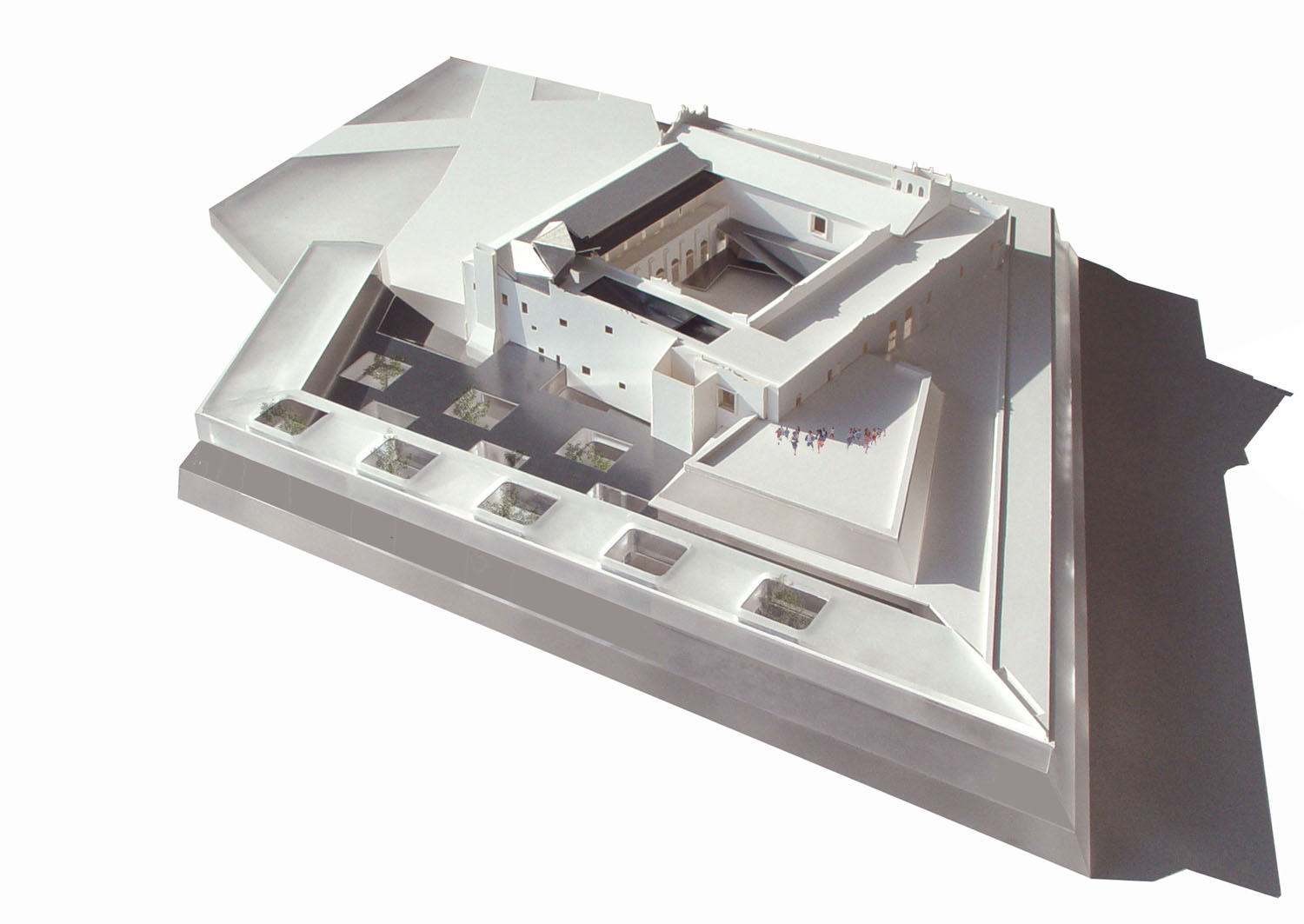 El proyecto conserva el edificio conventual con su disposición tipológica original y superpone una trama abstracta de llenos y vacíos bajo la cota del terraplén del baluarte. Esta trama de geometrías simples regulares se fusiona y pierde sus límites bajo la construcción fortificada, de forma que desde extramuros su presencia no es perceptible. Su cubierta es prolongación de las plataformas ajardinadas del baluarte. La nueva trama superpuesta sólo se deja ver en el frente a la plaza San Juan de Dios donde resuelve el límite del baluarte desde su flanco trasero este hasta la articulación con el Convento. La nueva fachada que asoma a la plaza se pliega y permite la conexión de la cubierta-baluarte con la plaza con lo que restituye la relación existente mediante las rampas actuales que se eliminan. Sobre este nuevo frente se ubican los accesos a garaje y de servicio.