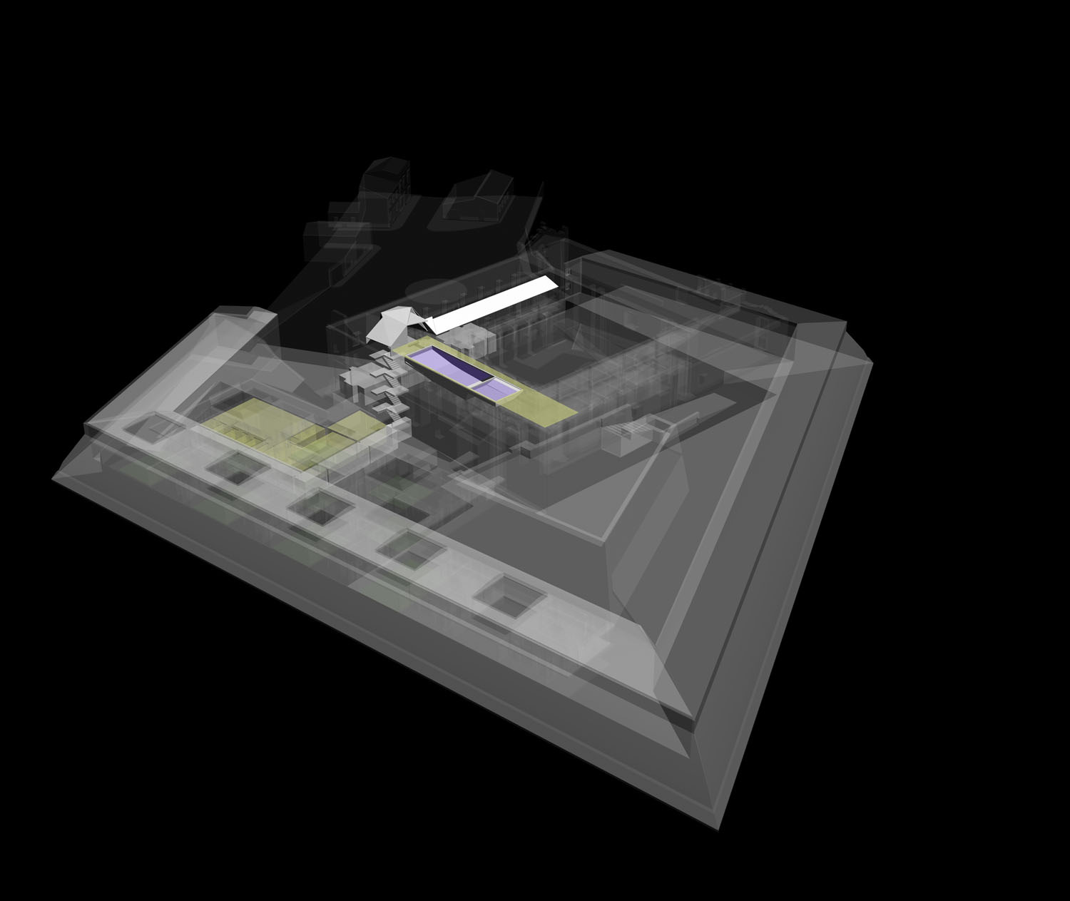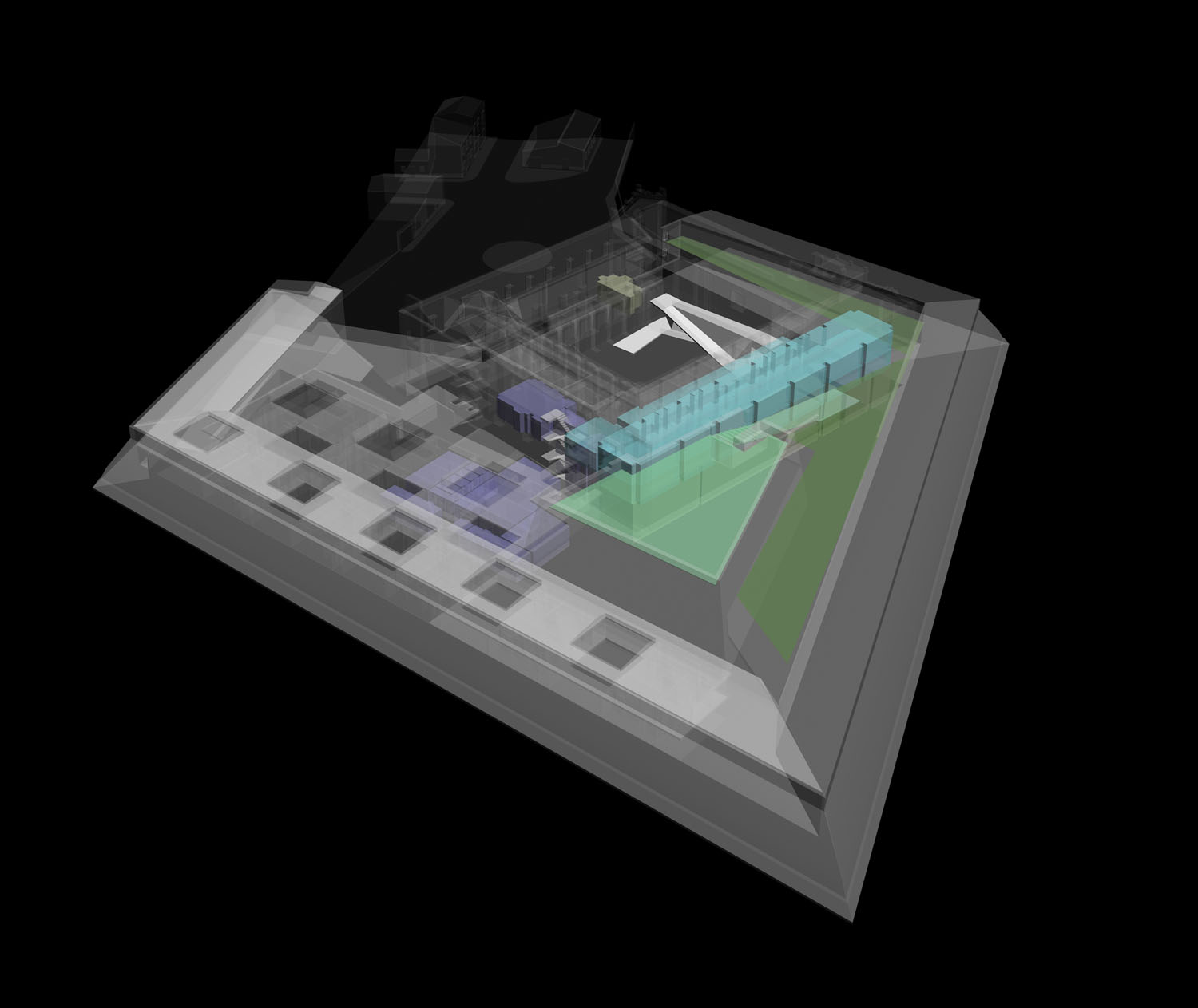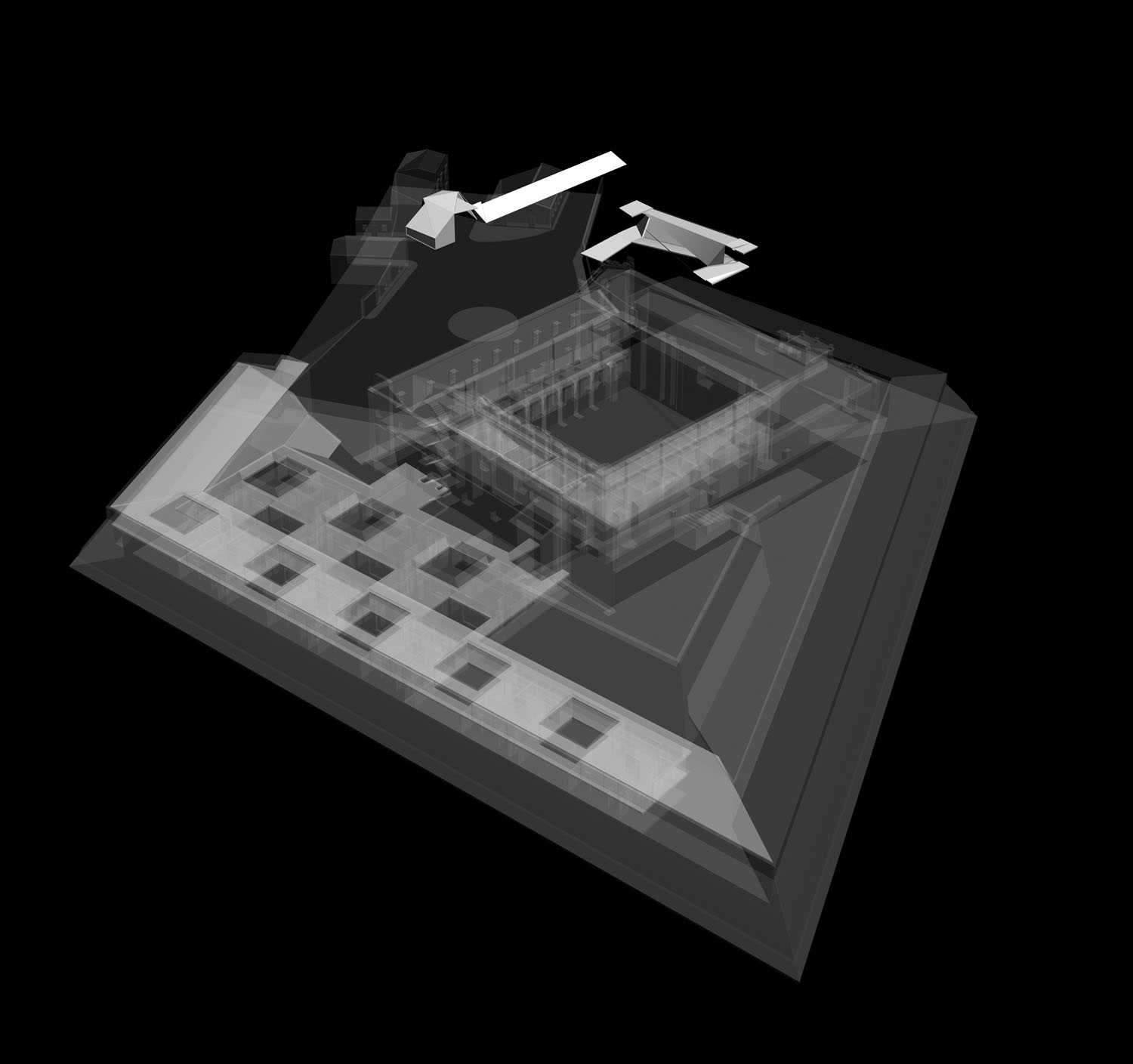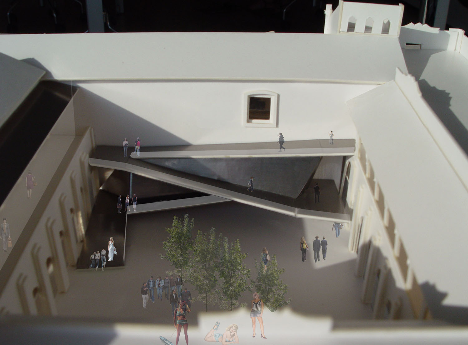 El proyecto conserva el edificio conventual con su disposición tipológica original y superpone una trama abstracta de llenos y vacíos bajo la cota del terraplén del baluarte. Esta trama de geometrías simples regulares se fusiona y pierde sus límites bajo la construcción fortificada, de forma que desde extramuros su presencia no es perceptible. Su cubierta es prolongación de las plataformas ajardinadas del baluarte. La nueva trama superpuesta sólo se deja ver en el frente a la plaza San Juan de Dios donde resuelve el límite del baluarte desde su flanco trasero este hasta la articulación con el Convento. La nueva fachada que asoma a la plaza se pliega y permite la conexión de la cubierta-baluarte con la plaza con lo que restituye la relación existente mediante las rampas actuales que se eliminan. Sobre este nuevo frente se ubican los accesos a garaje y de servicio.