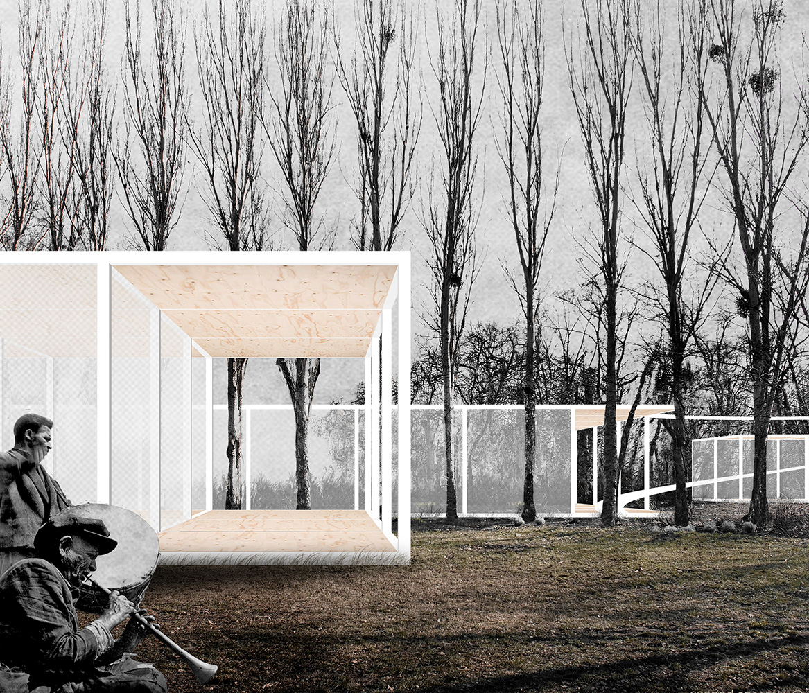 The house of the Hungarian music is not a monumental building. It is a juxtaposition of pavilions inserted between the trees of the city park. The roofs of these pavilions become the support of emergent uses at the intersection of the program and of public space. The ramps that access the roof depict the passage of undergrowth to new roof clearings as a metaphor for the evolution of the academic program towards the development of contemporary cultural practices of traditional music.