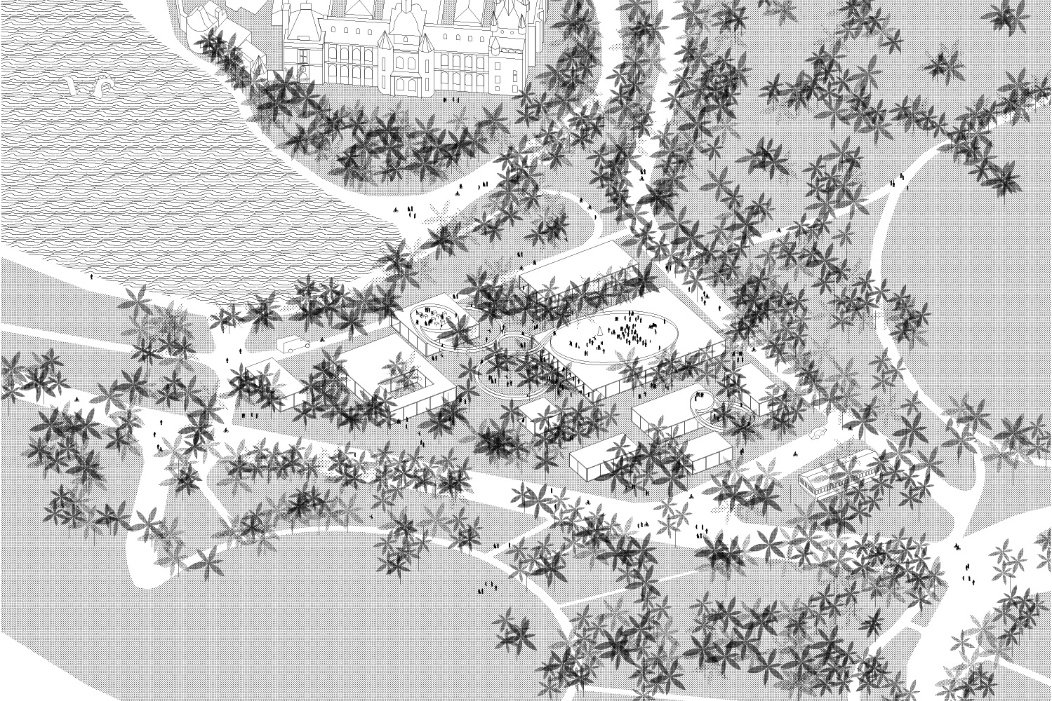 Varosliget consists of pavilions scattered in the park in between the trees. In a similar way, the House of Hungarian Music should be as series of pavilions scattered throughout the plot. The park retains its identity as a unifying element and the continuity of public space in the city.