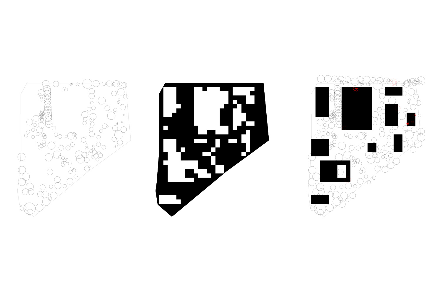 The relationship between the building plot and the landscape plot is the same as the ratio between the surface occupied by trees and the area of the space between the trees. Limited to building on the building plot requires the cutting of nearly all the trees on this plot. By contrast, it is possible to occupy all of the available space with a minimum of tree cuts on the site.