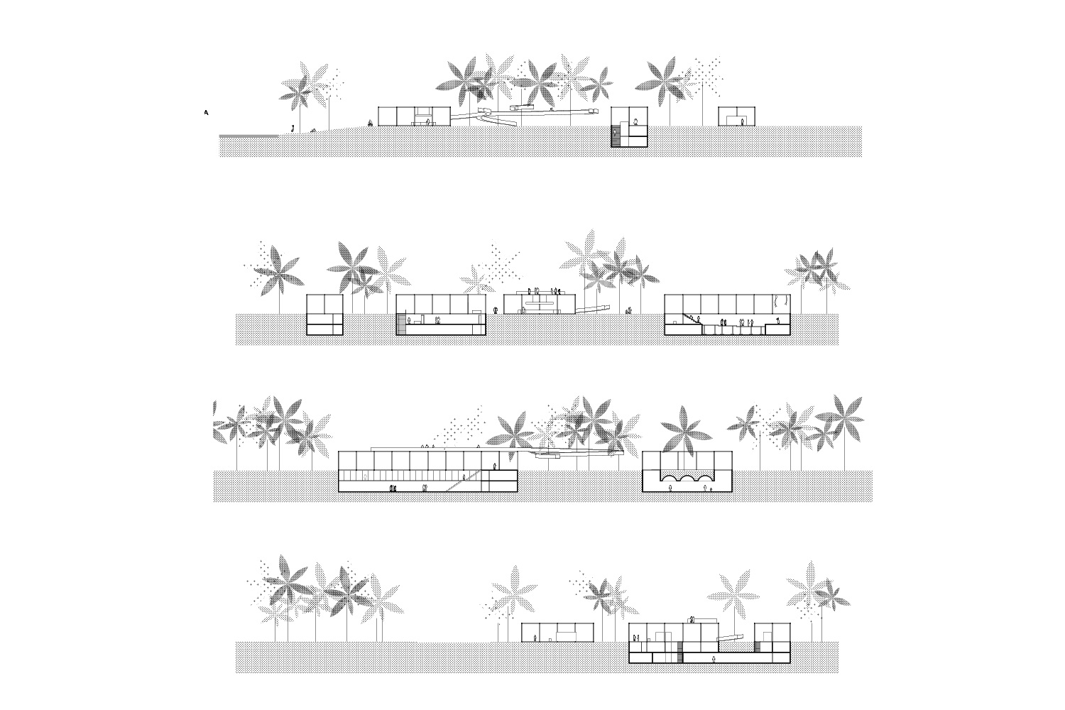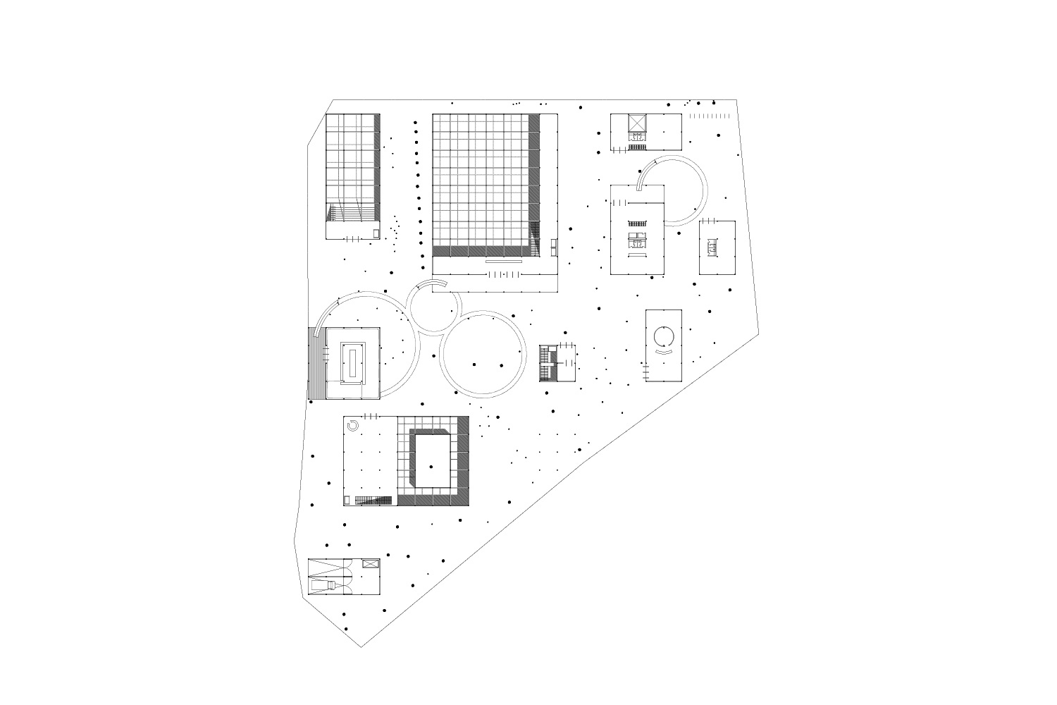 A three-dimensional structural grid in 5x5x5m posts/metal beams enables the covering of the main volumes. This structure becomes an oversized technical grid. With this grid, the exhibition space and the auditorium benefits from an indirect, natural light. This structural grid also helps to spread the other program spaces in between the trees: cafeteria, bookstore, press room, offices, delivery. The program is distributed throughout the plot in 8 distinct pavilions. Each pavilion is autonomous, containing all the necessary services. They can be independently opened or closed depending on opening hours or scheduled events. On the basis of neutral spaces, directly generated by the structure, each pavilion can accommodate a maximum of events. Separations between the parts are made by curtains that modulate the space for different uses. In the theater, movable platforms allow the seating steps to be modulated, configurating the room according to several uses.