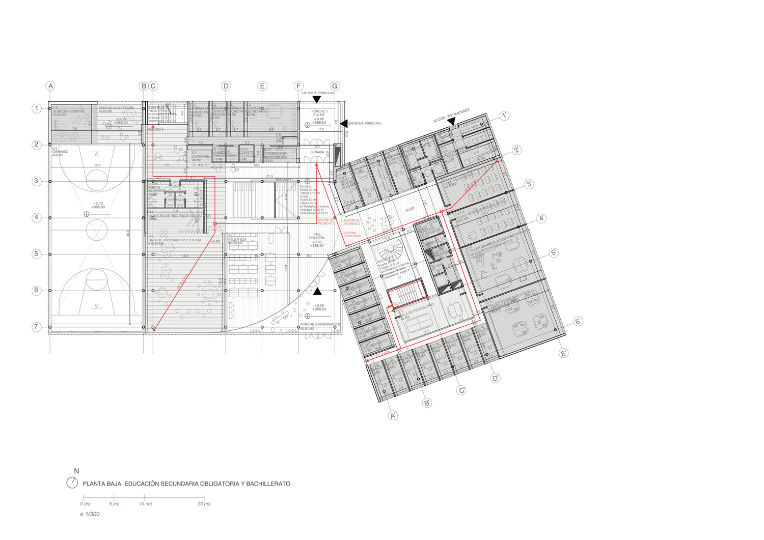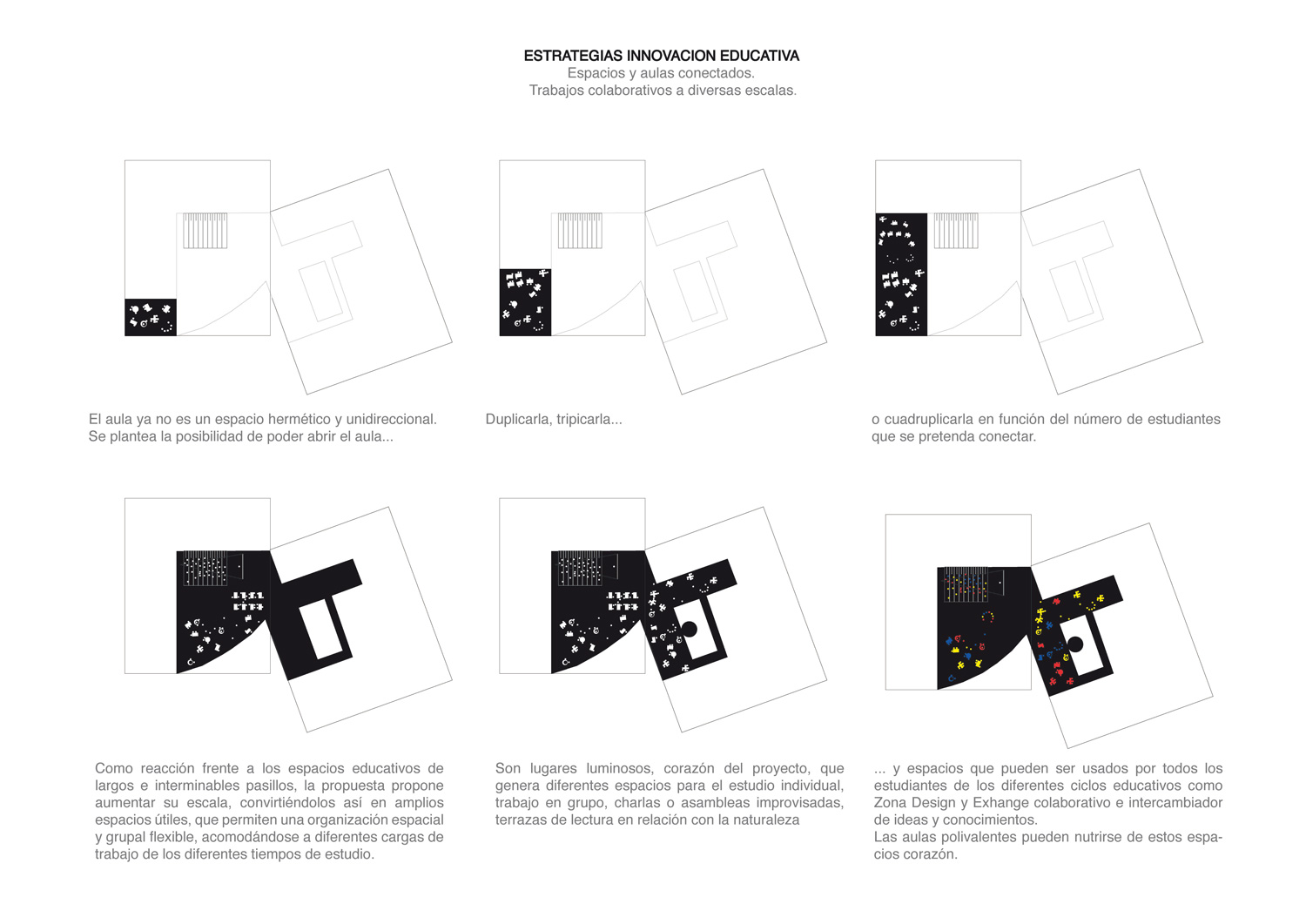Como reacción frente a los espacios educativos de largos e interminables pasillos, la propuesta propone aumentar su escala, convirtiéndolos así en amplios espacios útiles, que permiten una organización espacial y grupal flexible, acomodándose a diferentes cargas de trabajo de los diferentes tiempos de estudio.