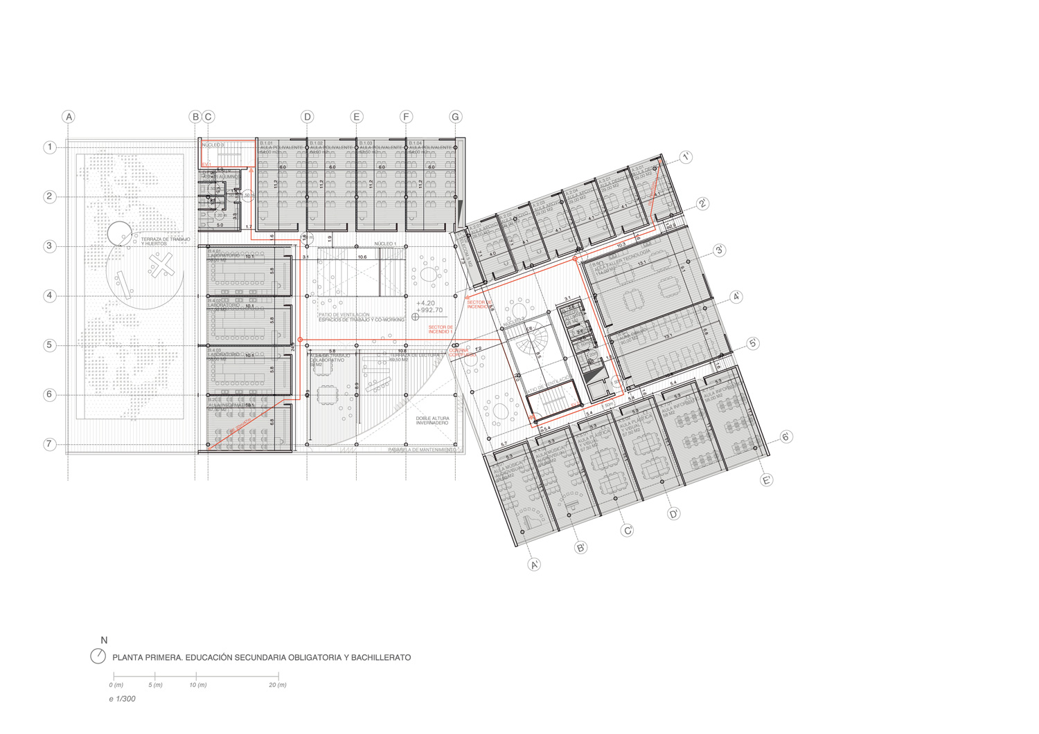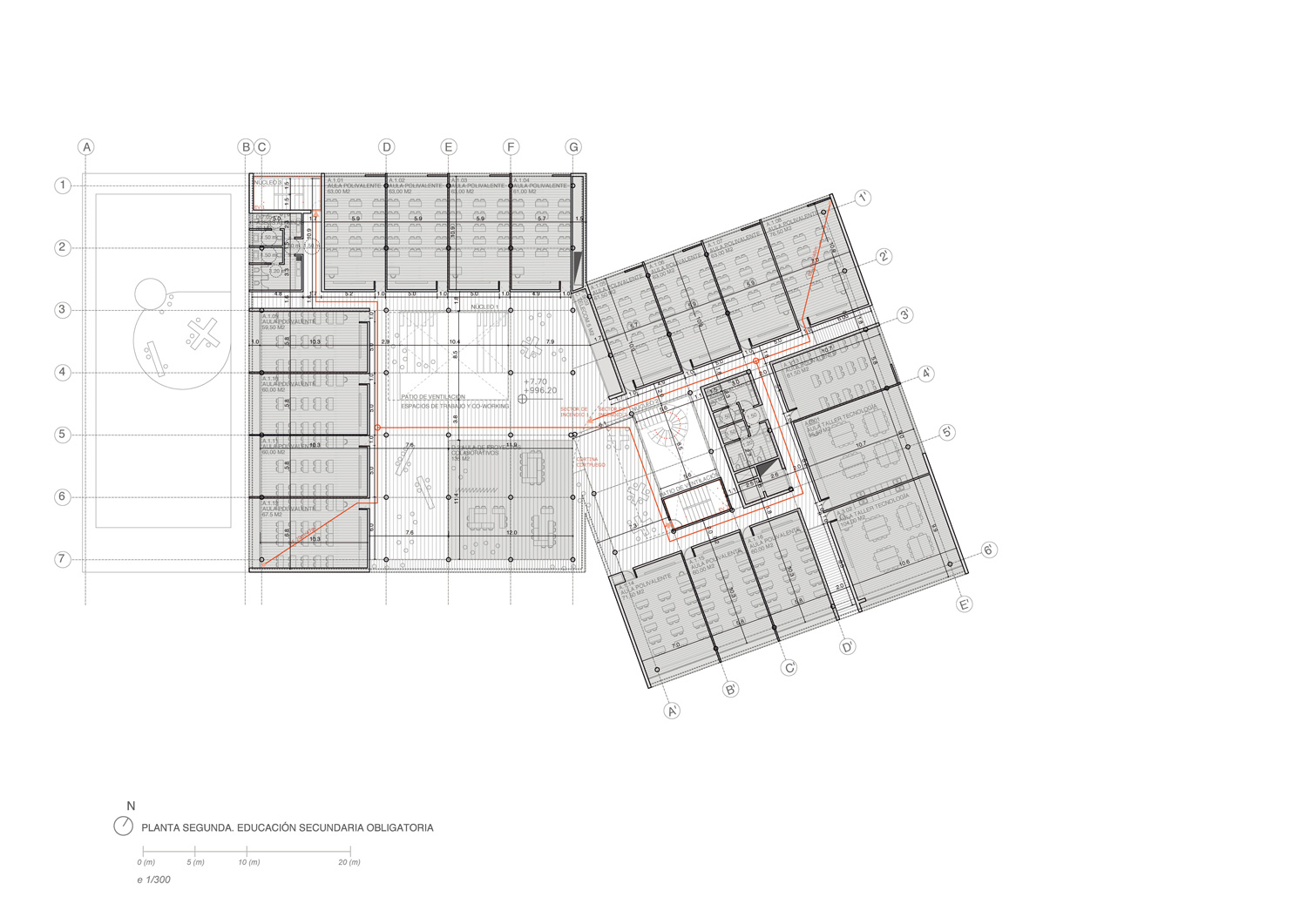 Tanto los espacios de aulas como los espacios “corazón”, propician una flexibilidad de usos acrecentada por la disposición de la estructura, cuya retícula de 6x6m permite la total redistribución interna si fuera necesario, y permite crear grandes espacios diáfanos que pueden dar lugar a situaciones organizativas infinitas; desde su uso como zona de estudio individual hasta su uso como espacio colaborativo de grupos.